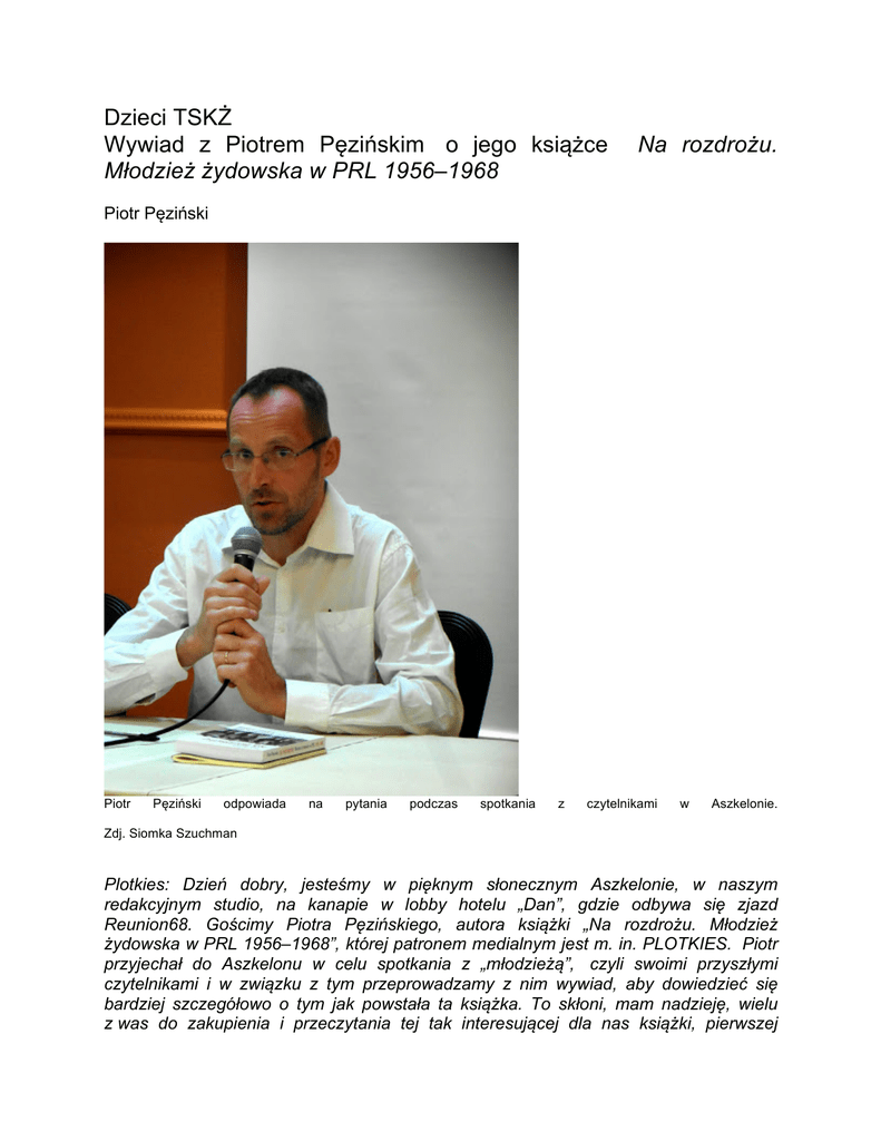 Dzieci TSKŻ Wywiad z Piotrem Pęzińskim o jego książce Młodzież żydowska w PRL 1956–1968 Na rozdrożu. Piotr Pęziński Piotr Pęziński odpowiada na pytania podczas spotkania z czytelnikami w Aszkelonie. Zdj. Siomka Szuchman Plotkies: Dzień dobry, jesteśmy w pięknym słonecznym Aszkelonie, w naszym redakcyjnym studio, na kanapie w lobby hotelu „Dan”, gdzie odbywa się zjazd Reunion68. Gościmy Piotra Pęzińskiego, autora książki „Na rozdrożu. Młodzież żydowska w PRL 1956–1968”, której patronem medialnym jest m. in. PLOTKIES. Piotr przyjechał do Aszkelonu w celu spotkania z „młodzieżą”, czyli swoimi przyszłymi czytelnikami i w związku z tym przeprowadzamy z nim wywiad, aby dowiedzieć się bardziej szczegółowo o tym jak powstała ta książka. To skłoni, mam nadzieję, wielu z was do zakupienia i przeczytania tej tak interesującej dla nas książki, pierwszej i jedynej na temat „naszej" młodości w Polsce. Piotrze, opowiedz nam trochę o swoim background, rodzinie, pochodzeniu, wykształceniu i młodości. Jakie są twoje związki z żydostwem? Piotr Pęziński: Mój rodzinny background... Myślę, że z jednej strony zwyczajny, ale i trochę zwariowany. Jeśli pytasz o żydowskie koneksje to ich z domu nie posiadam, a w każdym razie nic mi na ten temat nie wiadomo. Od lat interesuję się z żona, Magdą, historią i kulturą żydowską. Nasze córki chodziły do przedszkola i do szkoły Laudera w Warszawie. Mamy trochę znajomych z tego środowiska. Urodziłem się w Warszawie, mieszkałem najpierw na Bielanach, potem na Rakowcu, gdzie z kluczem na szyi biegałem do zwykłej, przeładowanej uczniami, trzyzmianowej szkoły podstawowej. „Załapałem się” jeszcze na czasy, kiedy dzieci miały więcej wolności, „hartowały się” na podwórku, a rodzice – jeśli ingerowali w ich życie – to głównie po wywiadówce, karząc za kiepskie oceny „szlabanem” . Tata był naukowcem, pracował w instytucie badawczym, a mama – redaktorem w PWN. Otwarci ludzie, mocno zaangażowani w pierwsza „Solidarność”, potem w latach 80. działający społecznie z młodzieżą w ramach KIK-owskich obozów i kolonii, niezmordowani wędrowcy i turyści. Myślę, że rodzice wychowywali mnie bardzo idealistycznie, co w połączeniu z bogatymi doświadczeniami życia podwórkowego – jego niepisanym kodeksem honorowym, szalonymi przygodami, umiłowaniem do robienia wielu rzeczy „na przekór" – mocno wpłynęło (i nadal wpływa) na moje życie. Dalej było Liceum im Z. Modzelewskiego, studia historyczne na Uniwersytecie Warszawskim. Dużo by opowiadać... Jako że dość wcześnie urodziło mi się dziecko i założyłem rodzinę, na pierwsze miejsce wysunęły się sprawy życia codziennego, bytowe. Jeszcze w czasie studiów zacząłem pracować w dziale oświatowym Zamku Królewskiego w Warszawie, gdzie w ramach tzw. lekcji muzealnych uczyłem dzieci historii. Później był epizod pracy w Fundacji Polsko-Niemieckie Pojednanie, a potem długie lata w wysokonakładowych pismach, należących do niemieckich koncernów wydawniczych. Kilka lat temu, dogłębnie „przemielony" przez życie korporacyjne, postanowiłem poszukać ratunku dla mojej duszy, wracając m.in. do uprawiania historii. Częścią tego mojego powrotu jest książka o młodzieży żydowskiej. P. A czy możesz nam powiedzieć coś o swoich studiach, na jakim wydziale, jaką tematyka się zajmowałeś i kim byli twoi nauczyciele historii? PP. Mój życiorys jest troszeczkę pogmatwany, do pewnych rzeczy doszedłem nie od razu i nie prostą drogą. Studia historyczne, podjąłem jeszcze w czasach schyłkowej komuny. Na egzamin przyszedłem w mundurze wojskowym, bo jako że dwa lata wcześniej nie dostałem się na prawo, zostałem zgarnięty przez MON w tzw. „kamasze” do pilnowania robotników w Zakładach Mechanicznych „Ursus”. Wartownikiem byłem jednak dość kiepskim, Mało zaangażowanym. Wsadzali mnie do aresztu, wychowywali w bardziej lub mniej wyszukany sposób, wreszcie uznali chyba, że jestem debilem i skierowali na tzw. „posterunki obserwacyjno-ochronne”, gdzie zamiast ludzi biegały zające i bażanty. Miałem spokój i dużo czasu na czytanie, przygotowywanie się do egzaminów. Zdąłem je bez większych problemów. Tak więc – ku zaskoczeniu moich rodziców, którzy już widzieli mnie w Technikum Wieczorowym Naprawy Sprzętu Artykułów Gospodarstwa Domowego – zostałem przyjęty na studia. To było ważne wydarzenie, pierwszego dnia bowiem na samym rozpoczęciu roku akademickiego spotkałem na schodach Instytutu Historycznego dziewczynę, w której się zakochałem. Magda do dziś jest moja żoną i to jej właśnie zadedykowałem książkę Na rozdrożu… . Miałem świetnych akademików, niektórzy byli już profesorami, niektórzy stali się nimi później – Andrzej Garlicki, Henryk Samsonowicz, Włodzimierz Lengauer, Tadeusz Cegielski, Łukasz Kądziela, Tomasz Nałęcz, Romuald Turkowski. Specjalizowałem się w historii XX wieku, historii PRL-u. Interesowały mnie mniejszości narodowe. Pierwotnie przystąpiłem do pisania pracy magisterskiej związanej z przesiedleniem ludności autochtonicznej na Warmii i Mazurach z ziem północno-wschodniej Polski do Niemiec. Niestety byłem za ambitny, a docent prowadzący seminarium chyba za bardzo obojętny w czym "dłubią się" jego studenci. To był raczej temat na doktorat – aby go napisać należałoby parę lat spędzić w archiwum w Olsztynie i Archiwum MSW, które było jeszcze wtedy niedostępne. Klasycznie „wkopałem się” w ten temat i się „nie wykopałem”. Okazał się za trudny dla takiego gówniarza jak ja. Tematu nigdy nie zakończyłem i już nigdy potem do niego nie wróciłem. Zrobili to „za mnie” inni – są już książki na ten temat, publikacje zbiorów dokumentów itp. Po latach wróciłem do historii, ale zabrałem się za zupełnie inne zagadnienie, dot