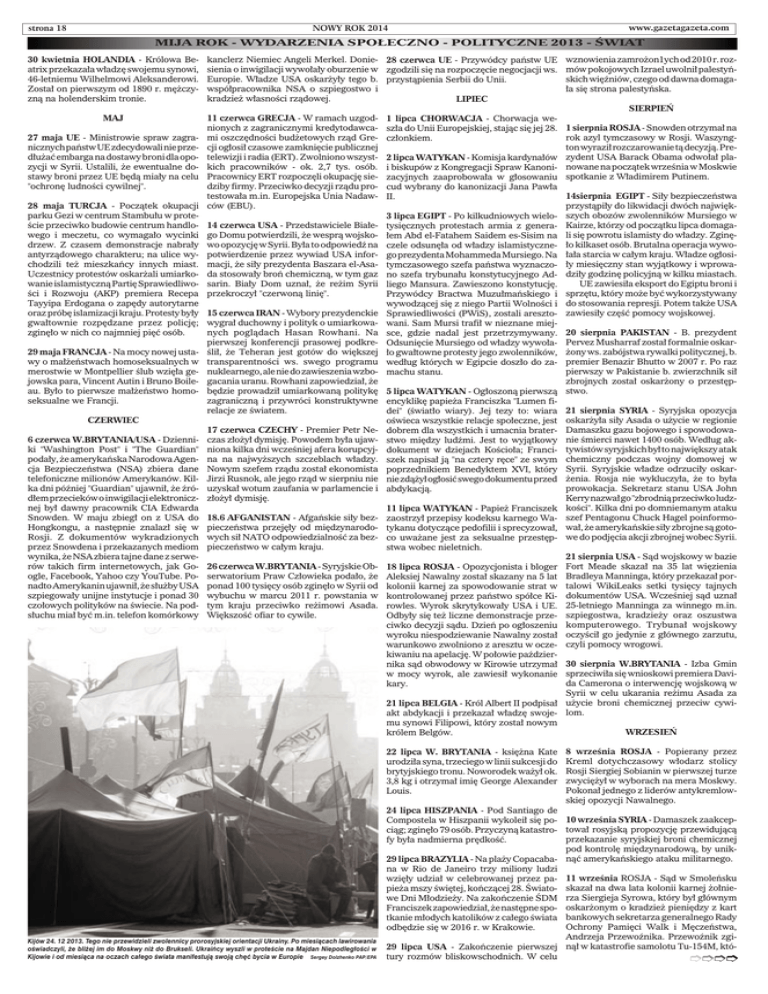 strona 18 NOWY ROK 2014 www.gazetagazeta.com MIJA ROK - WYDARZENIA SPOŁECZNO - POLITYCZNE 2013 - ŚWIAT 30 kwietnia HOLANDIA - Królowa Beatrix przekazała władzę swojemu synowi, 46-letniemu Wilhelmowi Aleksanderowi. Został on pierwszym od 1890 r. mężczyzną na holenderskim tronie. MAJ 27 maja UE - Ministrowie spraw zagranicznych państw UE zdecydowali nie przedłużać embarga na dostawy broni dla opozycji w Syrii. Ustalili, że ewentualne dostawy broni przez UE będą miały na celu "ochronę ludności cywilnej". 28 maja TURCJA - Początek okupacji parku Gezi w centrum Stambułu w proteście przeciwko budowie centrum handlowego i meczetu, co wymagało wycinki drzew. Z czasem demonstracje nabrały antyrządowego charakteru; na ulice wychodzili też mieszkańcy innych miast. Uczestnicy protestów oskarżali umiarkowanie islamistyczną Partię Sprawiedliwości i Rozwoju (AKP) premiera Recepa Tayyipa Erdogana o zapędy autorytarne oraz próbę islamizacji kraju. Protesty były gwałtownie rozpędzane przez policję; zginęło w nich co najmniej pięć osób. 29 maja FRANCJA - Na mocy nowej ustawy o małżeństwach homoseksualnych w merostwie w Montpellier ślub wzięła gejowska para, Vincent Autin i Bruno Boileau. Było to pierwsze małżeństwo homoseksualne we Francji. kanclerz Niemiec Angeli Merkel. Donie- 28 czerwca UE - Przywódcy państw UE sienia o inwigilacji wywołały oburzenie w zgodzili się na rozpoczęcie negocjacji ws. Europie. Władze USA oskarżyły tego b. przystąpienia Serbii do Unii. współpracownika NSA o szpiegostwo i kradzież własności rządowej. LIPIEC 11 czerwca GRECJA - W ramach uzgodnionych z zagranicznymi kredytodawcami oszczędności budżetowych rząd Grecji ogłosił czasowe zamknięcie publicznej telewizji i radia (ERT). Zwolniono wszystkich pracowników - ok. 2,7 tys. osób. Pracownicy ERT rozpoczęli okupację siedziby firmy. Przeciwko decyzji rządu protestowała m.in. Europejska Unia Nadawców (EBU). 14 czerwca USA - Przedstawiciele Białego Domu potwierdzili, że wesprą wojskowo opozycję w Syrii. Była to odpowiedź na potwierdzenie przez wywiad USA informacji, że siły prezydenta Baszara el-Asada stosowały broń chemiczną, w tym gaz sarin. Biały Dom uznał, że reżim Syrii przekroczył "czerwoną linię". 15 czerwca IRAN - Wybory prezydenckie wygrał duchowny i polityk o umiarkowanych poglądach Hasan Rowhani. Na pierwszej konferencji prasowej podkreślił, że Teheran jest gotów do większej transparentności ws. swego programu nuklearnego, ale nie do zawieszenia wzbogacania uranu. Rowhani zapowiedział, że będzie prowadził umiarkowaną politykę zagraniczną i przywróci konstruktywne relacje ze światem. CZERWIEC 6 czerwca W.BRYTANIA/USA - Dzienniki "Washington Post" i "The Guardian" podały, że amerykańska Narodowa Agencja Bezpieczeństwa (NSA) zbiera dane telefoniczne milionów Amerykanów. Kilka dni później "Guardian" ujawnił, że źródłem przecieków o inwigilacji elektronicznej był dawny pracownik CIA Edwarda Snowden. W maju zbiegł on z USA do Hongkongu, a następnie znalazł się w Rosji. Z dokumentów wykradzionych przez Snowdena i przekazanych mediom wynika, że NSA zbiera tajne dane z serwerów takich firm internetowych, jak Google, Facebook, Yahoo czy YouTube. Ponadto Amerykanin ujawnił, że służby USA szpiegowały unijne instytucje i ponad 30 czołowych polityków na świecie. Na podsłuchu miał być m.in. telefon komórkowy 17 czerwca CZECHY - Premier Petr Neczas złożył dymisję. Powodem była ujawniona kilka dni wcześniej afera korupcyjna na najwyższych szczeblach władzy. Nowym szefem rządu został ekonomista Jirzi Rusnok, ale jego rząd w sierpniu nie uzyskał wotum zaufania w parlamencie i złożył dymisję. 18.6 AFGANISTAN - Afgańskie siły bezpieczeństwa przejęły od międzynarodowych sił NATO odpowiedzialność za bezpieczeństwo w całym kraju. 26 czerwca W.BRYTANIA - Syryjskie Obserwatorium Praw Człowieka podało, że ponad 100 tysięcy osób zginęło w Syrii od wybuchu w marcu 2011 r. powstania w tym kraju przeciwko reżimowi Asada. Większość ofiar to cywile. SIERPIEŃ 1 lipca CHORWACJA - Chorwacja weszła do Unii Europejskiej, stając się jej 28. 1 sierpnia ROSJA - Snowden otrzymał na rok azyl tymczasowy w Rosji. Waszyngczłonkiem. ton wyraził rozczarowanie tą decyzją. Pre2 lipca WATYKAN - Komisja kardynałów zydent USA Barack Obama odwołał plai biskupów z Kongregacji Spraw Kanoni- nowane na początek września w Moskwie zacyjnych zaaprobowała w głosowaniu spotkanie z Władimirem Putinem. cud wybrany do kanonizacji Jana Pawła 14sierpnia EGIPT - Siły bezpieczeństwa II. przystąpiły do likwidacji dwóch najwięk3 lipca EGIPT - Po kilkudniowych wielo- szych obozów zwolenników Mursiego w tysięcznych protestach armia z genera- Kairze, którzy od początku lipca domagałem Abd el-Fatahem Saidem es-Sisim na li się powrotu islamisty do władzy. Zginęczele odsunęła od władzy islamistyczne- ło kilkaset osób. Brutalna operacja wywogo prezydenta Mohammeda Mursiego. Na łała starcia w całym kraju. Władze ogłositymczasowego szefa państwa wyznaczo- ły miesięczny stan wyjątkowy i wprowano szefa trybunału konstytucyjnego Ad- dziły godzinę policyjną w kilku miastach. UE zawiesiła eksport do Egiptu broni i liego Mansura. Zawieszono konstytucję. Przywódcy Bractwa Muzułmańskiego i sprzętu, który może być wykorzystywany wywodzącej się z niego Partii Wolności i do stosowania represji. Potem także USA Sprawiedliwości (PWiS), zostali areszto- zawiesiły część pomocy wojskowej. wani. Sam Mursi trafił w nieznane miejsce, gdzie nadal jest przetrzymywany. 20 sierpnia PAKISTAN - B. prezydent Odsunięcie Mursiego od władzy wywoła- Pervez Musharraf został formalnie oskarło gwałtowne protesty jego zwolenników, żony ws. zabójstwa rywalki politycznej, b. według których w Egipcie doszło do za- premier Benazir Bhutto w 2007 r. Po raz pierwszy w Pa