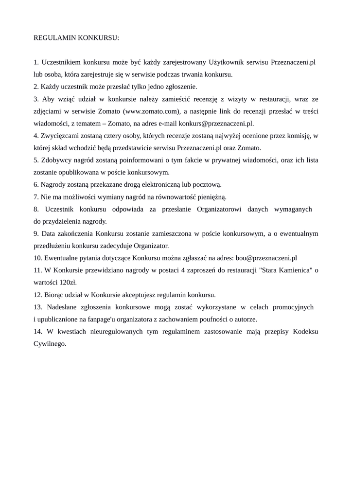 REGULAMIN KONKURSU: 1. Uczestnikiem konkursu może być każdy zarejestrowany Użytkownik serwisu Przeznaczeni.pl lub osoba, która zarejestruje się w serwisie podczas trwania konkursu. 2. Każdy uczestnik może przesłać tylko jedno zgłoszenie. 3. Aby wziąć udział w konkursie należy zamieścić recenzję z wizyty w restauracji, wraz ze zdjęciami w serwisie Zomato (www.zomato.com), a następnie link do recenzji przesłać w treści wiadomości, z tematem – Zomato, na adres e-mail [email protected]. 4. Zwycięzcami zostaną cztery osoby, których recenzje zostaną najwyżej ocenione przez komisję, w której skład wchodzić będą przedstawicie serwisu Przeznaczeni.pl oraz Zomato. 5. Zdobywcy nagród zostaną poinformowani o tym fakcie w prywatnej wiadomości, oraz ich lista zostanie opublikowana w poście konkursowym. 6. Nagrody zostaną przekazane drogą elektroniczną lub pocztową. 7. Nie ma możliwości wymiany nagród na równowartość pieniężną. 8. Uczestnik konkursu odpowiada za przesłanie Organizatorowi danych wymaganych do przydzielenia nagrody. 9. Data zakończenia Konkursu zostanie zamieszczona w poście konkursowym, a o ewentualnym przedłużeniu konkursu zadecyduje Organizator. 10. Ewentualne pytania dotyczące Konkursu można zgłaszać na adres: [email protected] 11. W Konkursie przewidziano nagrody w postaci 4 zaproszeń do restauracji "Stara Kamienica" o wartości 120zł. 12. Biorąc udział w Konkursie akceptujesz regulamin konkursu. 13. Nadesłane zgłoszenia konkursowe mogą zostać wykorzystane w celach promocyjnych i upublicznione na fanpage'u organizatora z zachowaniem poufności o autorze. 14. W kwestiach nieuregulowanych tym regulaminem zastosowanie mają przepisy Kodeksu Cywilnego.