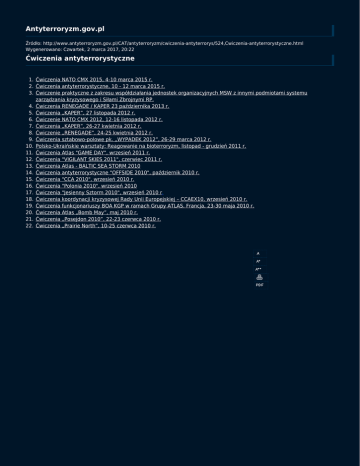 Antyterroryzm.gov.pl Źródło: http://www.antyterroryzm.gov.pl/CAT/antyterroryzm/cwiczenia-antyterrorys/524,Cwiczenia-antyterrorystyczne.html Wygenerowano: Czwartek, 2 marca 2017, 20:22 Ćwiczenia antyterrorystyczne 1. Ćwiczenia NATO CMX 2015, 4-10 marca 2015 r. 2. Ćwiczenia antyterrorystyczne, 10 - 12 marca 2015 r. 3. Ćwiczenie praktyczne z zakresu współdziałania jednostek organizacyjnych MSW z innymi podmiotami systemu zarządzania kryzysowego i Siłami Zbrojnymi RP. 4. Ćwiczenia RENEGADE / KAPER 23 października 2013 r. 5. Ćwiczenia „KAPER”, 27 listopada 2012 r. 6. Ćwiczenie NATO CMX 2012, 12-16 listopada 2012 r. 7. Ćwiczenia „KAPER”, 26-27 kwietnia 2012 r. 8. Ćwiczenie „RENEGADE”, 24-25 kwietnia 2012 r. 9. Ćwiczenia sztabowo-polowe pk. „WYPADEK 2012”, 26-29 marca 2012 r. 10. Polsko-Ukraińskie warsztaty: Reagowanie na bioterroryzm, listopad - grudzień 2011 r. 11. Ćwiczenia Atlas "GAME DAY", wrzesień 2011 r. 12. Ćwiczenia "VIGILANT SKIES 2011", czerwiec 2011 r. 13. Ćwiczenia Atlas - BALTIC SEA STORM 2010 14. Ćwiczenia antyterrorystyczne "OFFSIDE 2010", październik 2010 r. 15. Ćwiczenia "CCA 2010", wrzesień 2010 r. 16. Ćwiczenia "Polonia 2010", wrzesień 2010 17. Ćwiczenia "Jesienny Sztorm 2010", wrzesień 2010 r. 18. Ćwiczenia koordynacji kryzysowej Rady Unii Europejskiej – CCAEX10, wrzesień 2010 r. 19. Ćwiczenia funkcjonariuszy BOA KGP w ramach Grupy ATLAS. Francja, 23-30 maja 2010 r. 20. Ćwiczenia Atlas „Bomb May”, maj 2010 r. 21. Ćwiczenia „Posejdon 2010”, 22-23 czerwca 2010 r. 22. Ćwiczenia „Prairie North”, 10-25 czerwca 2010 r.