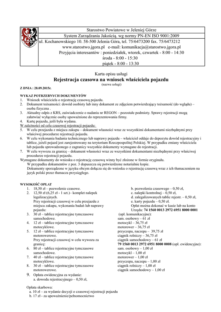 Starostwo Powiatowe w Jeleniej Górze System Zarządzania Jakością. wg normy PN-EN ISO 9001:2009 ul. Kochanowskiego 10. 58-500 Jelenia Góra, tel. 75/6473200 fax. 75/6473212 www.starostwo.jgora.pl e-mail: [email protected] Przyjęcia interesantów : poniedziałek, wtorek, czwartek - 8:00 - 14:30 środa - 8:00 - 15:30 piątek - 8:00 - 13:30 Karta opisu usługi Rejestracja czasowa na wniosek właściciela pojazdu (nazwa usługi) Z DNIA : 28.09.2015r. WYKAZ POTRZEBNYCH DOKUMENTÓW 1. 2. Wniosek właściciela o rejestrację czasową pojazdu. Dokument tożsamości: dowód osobisty lub inny dokument ze zdjęciem potwierdzający tożsamość (do wglądu) – osoba fizyczna . 3. Aktualny odpis z KRS, zaświadczenie o nadaniu nr REGON – pozostałe podmioty. Sprawy rejestracji mogą załatwiać wyłącznie osoby upoważnione do reprezentowania firmy. 4. Kartę pojazdu, jeśli była wydana. W zależności od celu czasowej rejestracji pojazdu: 5. W celu przejazdu z miejsca zakupu – dokument własności wraz ze wszystkimi dokumentami niezbędnymi przy właściwej procedurze rejestracji pojazdu. 6. W celu wykonania badania technicznego lub naprawy pojazdu – właściciel oddaje do depozytu dowód rejestracyjny i tablice, jeżeli pojazd jest zarejestrowany na terytorium Rzeczpospolitej Polskiej. W przypadku zmiany właściciela lub pojazdu sprowadzonego z zagranicy wszystkie dokumenty wymagane do rejestracji. 7. W celu wywozu za granicę – dokument własności wraz ze wszystkimi dokumentami niezbędnymi przy właściwej procedurze rejestracji pojazdu. Wymagane dokumenty do wniosku o rejestrację czasową winny być złożone w formie oryginału. W przypadku dokumentów z poz. 3 dopuszcza się potwierdzone notarialnie kopie. Dokumenty sporządzone w języku obcym dołącza się do wniosku o rejestrację czasową wraz z ich tłumaczeniem na język polski przez tłumacza przysięgłego. WYSOKOŚĆ OPŁAT 1. 2. 3. 4. 5. 6. 7. 8. 9. 18,50 zł – pozwolenie czasowe. 12,50 zł (6,25 zł - 1 szt.)– komplet nalepek legalizacyjnych. Przy rejestracji czasowej w celu przejazdu z miejsca zakupu, wykonania badań lub naprawy pojazdu: 30 zł – tablice rejestracyjne tymczasowe samochodowe. 12 zł – tablice rejestracyjne tymczasowe motocyklowe. 12 zł – tablice rejestracyjne tymczasowe motorowerowe. Przy rejestracji czasowej w celu wywozu za granicę: 80 zł – tablice rejestracyjne tymczasowe samochodowe. 40 zł – tablice rejestracyjne tymczasowe motocyklowe. 30 zł – tablice rejestracyjne tymczasowe motorowerowe. Opłata ewidencyjna za wydanie: a. dowodu rejestracyjnego – 0,50 zł, b. pozwolenia czasowego – 0,50 zł, c. nalepki kontrolnej – 0,50 zł, d. zalegalizowanych tablic rejestr. – 0,50 zł, e. karty pojazdu – 0,50 zł. Opłat można dokonać w kasie lub na konto Urzędu: 74 1560 0013 2972 6951 8000 0001 (opł. komunikacyjne): sam. osobowy – 61 zł motocykl – 36,75 zł motorower – 36,75 zł przyczepa, naczepa – 39,75 zł ciągnik rolniczy – 36,75 zł ciągnik samochodowy – 61 zł 79 1560 0013 2972 6951 8000 0008 (opł. ewidencyjne): sam. osobowy – 1,00 zł motocykl – 1,00 zł motorower – 1,00 zł przyczepa, naczepa – 1,00 zł ciągnik rolniczy – 1,00 zł ciągnik samochodowy – 1,00 zł Opłata skarbowa: a. 10 zł – za wydanie decyzji o czasowej rejestracji pojazdu b. 17 zł - za upoważnienie/pełnomocnictwo Zapłaty opłaty skarbowej należy dokonać w kasie Wydziału Komunikacji Starostwa Powiatowego. Możliwe jest także wpłacanie odpowiedniej kwoty na konto Urzędu m. Jelenia Góra: 98 1160 2202 0000 0000 6011 5566 MIEJSCE SKŁADANIA WNIOSKU / PODANIA Pokój nr 1 - po uprzednim osobistym lub telefonicznym ustaleniu terminu MIEJSCE WYKONYWANIA USŁUGI Stanowisko ds. rejestracji, parter, pokój nr 1, tel. (75) 64 73205÷7, SPOSÓB ZAŁATWIENIA USŁUGI Wydanie decyzji o rejestracji czasowej pojazdu. CZAS REALIZACJI USŁUGI 1. Niezwłocznie - sprawy niewymagające zbierania dowodów, informacji lub wyjaśnień. 1NFORMACJA O TRYB1E ODWOŁAWCZYM Do Samorządowego Kolegium Odwoławczego w terminie 14 dni od dnia doręczenia decyzji za pośrednictwem organu, który wydał decyzję. SPOSÓB ODBIORU DOKUMENTÓW Osobiście lub przez upoważnionego pełnomocnika PODSTAWA PRAWNA 1. 2. 3. 4. 5. 6. 7. 8. Ustawa z dnia 14 czerwca 1960 r. Kodeks postępowania administracyjnego (tekst jednolity: Dz. U. z 2013r., poz. 267), Ustawa z dnia 20 czerwca 1997 r. Prawo o ruchu drogowym (tekst jednolity: Dz. U. z 2012r., poz. 1137), Ustawa z dnia 16 listopada 2006r. o opłacie skarbowej (tekst jednolity: Dz. U. z 2014r. poz. 1628), Rozporządzenie Ministra Infrastruktury z dnia 22 lipca 2002 r. w sprawie rejestracji i oznaczenia pojazdów (tekst jednolity: Dz. U. z 2014r., poz. 1522), Rozporządzenie Ministra Infrastruktury z dnia 27 września 2003 r. w sprawie szczegółowych czynności organów w sprawach związanych z dopuszczeniem pojazdu do ruchu oraz wzorów dokumentów w tych sprawach (tekst jednolity: Dz. U. z 2007r., Nr 137, poz. 968), Rozporządzenie Ministra Infrastruktury z dnia 22 grudnia 2003 r. w sprawie wysokości opłat za wydanie dowodu rejestracyjnego, pozwolenia czasowego i tablic (tablicy) rejestracyjnych pojazdów (Dz. U. Nr 230, poz. 2302 ze zm.), Rozporządzenie Ministra Infrastruktury z dnia 20 października 2003 r. w sprawie warunków i trybu wydania kart pojazdów, wzoru karty pojazdu i jej opisu (Dz. U. Nr 189, poz. 1858), Rozporządzenie Ministra Spraw Wewnętrznych i Administracji z dnia 18 grudnia 2003 r. w sprawie opłaty ewidencyjnej, o której mowa w przepisach ustawy – Prawo o ruchu drogowym (Dz. U. Nr 227, poz. 2254). UWAGI Brak