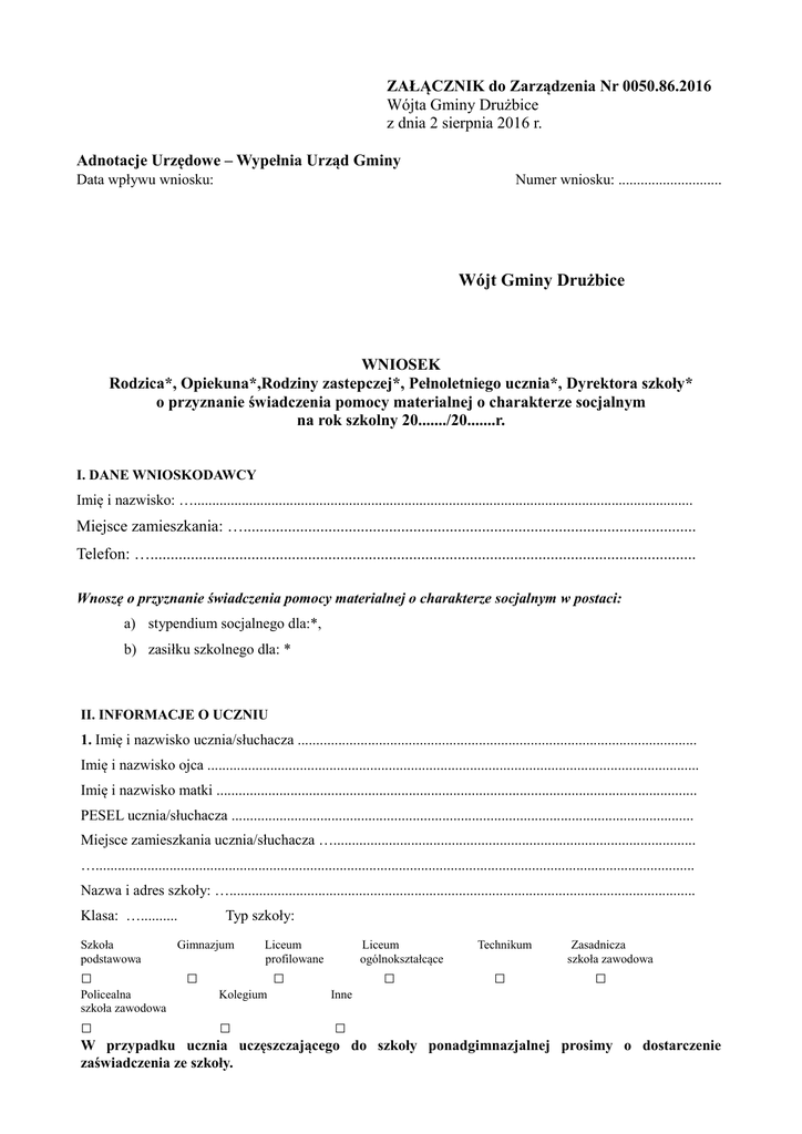 ZAŁĄCZNIK do Zarządzenia Nr 0050.86.2016 Wójta Gminy Drużbice z dnia 2 sierpnia 2016 r. Adnotacje Urzędowe – Wypełnia Urząd Gminy Data wpływu wniosku: Numer wniosku: ............................ Wójt Gminy Drużbice WNIOSEK Rodzica*, Opiekuna*,Rodziny zastepczej*, Pełnoletniego ucznia*, Dyrektora szkoły* o przyznanie świadczenia pomocy materialnej o charakterze socjalnym na rok szkolny 20......./20.......r. I. DANE WNIOSKODAWCY Imię i nazwisko: …....................................................................................................................................... Miejsce zamieszkania: …................................................................................................................ Telefon: …....................................................................................................................................... Wnoszę o przyznanie świadczenia pomocy materialnej o charakterze socjalnym w postaci: a) stypendium socjalnego dla:*, b) zasiłku szkolnego dla: * II. INFORMACJE O UCZNIU 1. Imię i nazwisko ucznia/słuchacza ............................................................................................................ Imię i nazwisko ojca ..................................................................................................................................... Imię i nazwisko matki .................................................................................................................................. PESEL ucznia/słuchacza ............................................................................................................................. Miejsce zamieszkania ucznia/słuchacza ….................................................................................................. ….................................................................................................................................................................. Nazwa i adres szkoły: ….............................................................................................................................. Klasa: ….......... Szkoła podstawowa □ Typ szkoły: Gimnazjum Liceum profilowane □ Liceum ogólnokształcące □ □ Policealna szkoła zawodowa Kolegium Inne □ □ □ Technikum □ Zasadnicza szkoła zawodowa □ W przypadku ucznia uczęszczającego do szkoły ponadgimnazjalnej prosimy o dostarczenie zaświadczenia ze szkoły. 2. Imię i nazwisko ucznia/słuchacza ............................................................................................................ Imię i nazwisko ojca ..................................................................................................................................... Imię i nazwisko matki .................................................................................................................................. PESEL ucznia/słuchacza ............................................................................................................................. Miejsce zamieszkania ucznia/słuchacza ….................................................................................................. ….................................................................................................................................................................. Nazwa i adres szkoły: ….............................................................................................................................. Klasa: ….......... Szkoła podstawowa Typ szkoły: Gimnazjum □ Liceum profilowane □ Liceum ogólnokształcące □ □ Policealna szkoła zawodowa Kolegium Inne □ □ □ Technikum □ Zasadnicza szkoła zawodowa □ 3. Imię i nazwisko ucznia/słuchacza ............................................................................................................ Imię i nazwisko ojca ..................................................................................................................................... Imię i nazwisko matki .................................................................................................................................. PESEL ucznia/słuchacza ............................................................................................................................. Miejsce zamieszkania ucznia/słuchacza ….................................................................................................. ….................................................................................................................................................................. Nazwa i adres szkoły: ….............................................................................................................................. Klasa: ….......... Szkoła podstawowa Typ szkoły: Gimnazjum □ Liceum profilowane □ Liceum ogólnokształcące □ □ Policealna szkoła zawodowa Kolegium Inne □ □ □ Technikum □ Zasadnicza szkoła zawodowa □ 4. Imię i nazwisko ucznia/słuchacza ............................................................................................................ Imię i nazwisko ojca .................................................................................................................................... Imię i nazwisko matki .................................................................................................................................. PESEL ucznia/słuchacza ............................................................................................................................. Miejsce zamieszkania ucznia/słuchacza ….................................................................................................. ….................................................................................................................................................................. Nazwa i adres szkoły: …......