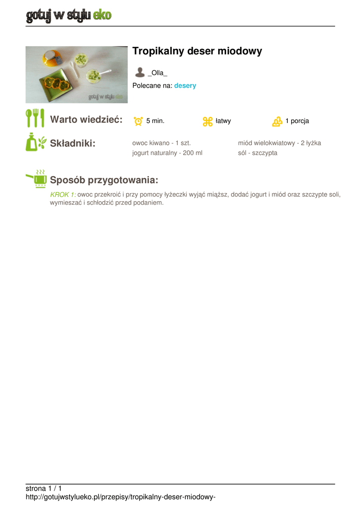 Tropikalny deser miodowy _Olla_ Polecane na: desery Warto wiedzieć: Składniki: 5 min. owoc kiwano - 1 szt. jogurt naturalny - 200 ml łatwy 1 porcja miód wielokwiatowy - 2 łyżka sól - szczypta Sposób przygotowania: KROK 1: owoc przekroić i przy pomocy łyżeczki wyjąć miąższ, dodać jogurt i miód oraz szczypte soli, wymieszać i schłodzić przed podaniem. strona 1 / 1 http://gotujwstylueko.pl/przepisy/tropikalny-deser-miodowyPowered by TCPDF (www.tcpdf.org)