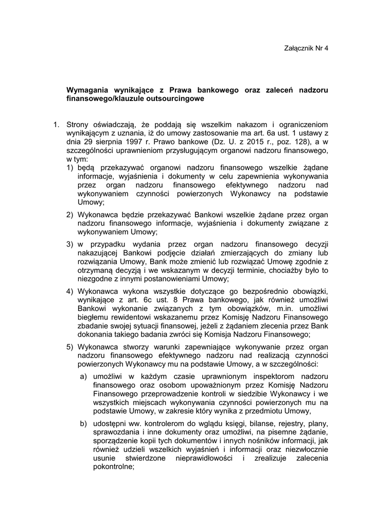 Załącznik Nr 4 Wymagania wynikające z Prawa bankowego oraz zaleceń nadzoru finansowego/klauzule outsourcingowe 1. Strony oświadczają, że poddają się wszelkim nakazom i ograniczeniom wynikającym z uznania, iż do umowy zastosowanie ma art. 6a ust. 1 ustawy z dnia 29 sierpnia 1997 r. Prawo bankowe (Dz. U. z 2015 r., poz. 128), a w szczególności uprawnieniom przysługującym organowi nadzoru finansowego, w tym: 1) będą przekazywać organowi nadzoru finansowego wszelkie żądane informacje, wyjaśnienia i dokumenty w celu zapewnienia wykonywania przez organ nadzoru finansowego efektywnego nadzoru nad wykonywaniem czynności powierzonych Wykonawcy na podstawie Umowy; 2) Wykonawca będzie przekazywać Bankowi wszelkie żądane przez organ nadzoru finansowego informacje, wyjaśnienia i dokumenty związane z wykonywaniem Umowy; 3) w przypadku wydania przez organ nadzoru finansowego decyzji nakazującej Bankowi podjęcie działań zmierzających do zmiany lub rozwiązania Umowy, Bank może zmienić lub rozwiązać Umowę zgodnie z otrzymaną decyzją i we wskazanym w decyzji terminie, chociażby było to niezgodne z innymi postanowieniami Umowy; 4) Wykonawca wykona wszystkie dotyczące go bezpośrednio obowiązki, wynikające z art. 6c ust. 8 Prawa bankowego, jak również umożliwi Bankowi wykonanie związanych z tym obowiązków, m.in. umożliwi biegłemu rewidentowi wskazanemu przez Komisję Nadzoru Finansowego zbadanie swojej sytuacji finansowej, jeżeli z żądaniem zlecenia przez Bank dokonania takiego badania zwróci się Komisja Nadzoru Finansowego; 5) Wykonawca stworzy warunki zapewniające wykonywanie przez organ nadzoru finansowego efektywnego nadzoru nad realizacją czynności powierzonych Wykonawcy mu na podstawie Umowy, a w szczególności: a) umożliwi w każdym czasie uprawnionym inspektorom nadzoru finansowego oraz osobom upoważnionym przez Komisję Nadzoru Finansowego przeprowadzenie kontroli w siedzibie Wykonawcy i we wszystkich miejscach wykonywania czynności powierzonych mu na podstawie Umowy, w zakresie który wynika z przedmiotu Umowy, b) udostępni ww. kontrolerom do wglądu księgi, bilanse, rejestry, plany, sprawozdania i inne dokumenty oraz umożliwi, na pisemne żądanie, sporządzenie kopii tych dokumentów i innych nośników informacji, jak również udzieli wszelkich wyjaśnień i informacji oraz niezwłocznie usunie stwierdzone nieprawidłowości i zrealizuje zalecenia pokontrolne; 6) Wykonawca ponadto: a) zapewni Bankowi możliwość dostępu do informacji o bieżącym funkcjonowaniu Wykonawcy w zakresie związanym z wykonywaniem czynności powierzonych mu na podstawie Umowy, b) zapewni Bankowi prawo do wykonania nadzoru w zakresie Umowy poprzez możliwość zlecenia lub przeprowadzania audytu sprawozdania finansowego Wykonawcy oraz zapewni Bankowi dostęp do sprawozdań finansowych*, c) umożliwi wykonywanie obowiązków przez biegłego rewidenta upoważnionego do badania sprawozdań finansowych Banku, d) przekaże niezwłocznie na żądanie Banku pełne informacje i dokumenty, mające związek z realizacją postanowień Umowy, e) umożliwi Bankowi podejmowanie w każdym czasie kontroli wewnętrznej, według obowiązujących w Banku procedur i planów kontroli, w zakresie związanym z wykonywaniem czynności powierzonych Wykonawcy na podstawie Umowy, w siedzibie Wykonawcy i we wszystkich miejscach wykonywania tych czynności, f) udostępni Bankowi informacje i dokumenty dotyczące stosowanych u Wykonawcy zasad bezpieczeństwa, procedur i mechanizmów kontroli, a także umożliwi Bankowi weryfikację tych dokumentów, g) będzie wykonywał swoje obowiązki umowne z uwzględnieniem Planu działania Wykonawcy zapewniającego ciągłe i niezakłócone wykonywanie czynności powierzonych mu na podstawie Umowy, stanowiącego Załącznik nr … do Umowy, h) zastosuje się do udostępnionych mu przepisów bezpieczeństwa obowiązujących w Banku w przypadku wykorzystywania przy wykonywaniu Umowy zasobów Banku. 2. Żadne prawa ani obowiązki wynikające z Umowy nie mogą zostać przeniesione na osobę trzecią bez pisemnej zgody drugiej Strony. Dotyczy to także powierzenia przez Wykonawcę osobie trzeciej wykonania części lub całości obowiązków Wykonawcy określonych w Umowie. Bank może wyrazić zgodę na powierzenie, o którym mowa wyżej, o ile nie naruszy to przepisów Prawa bankowego, jednocześnie z uzgodnieniem w formie aneksu do Umowy warunków takiego powierzenia. 3. Wykonawca ponosi wobec Banku pełną odpowiedzialność za szkody wyrządzone klientom Banku wskutek niewykonania lub nienależytego wykonania Umowy przez Wykonawcę. Odpowiedzialności tej nie można wyłączyć ani ograniczyć, chociażby było to niezgodne z innymi postanowieniami Umowy. 4. Do kontaktów w trybie ciągłym w celu szybkiego rozwiązywania pojawiających się problemów Strony wyznaczają: 1) ze strony Banku – p. … , tel. … , e-mail … , 2) ze strony Wykonawcy - p. … , tel. …, e-mail … . 5. Zmiana osoby wyznaczonej przez każdą ze stron może być dokonana przez tę stronę w drodze jednostronnego pisemnego oświadczenia skierowanego do drugiej strony, bez potrzeby podpisywania aneksu do Umowy. * dotyczy tylko podmiotów obowiązanych do sporządzania finansowych na podstawie przepisów o rachunkowości. sprawozdań