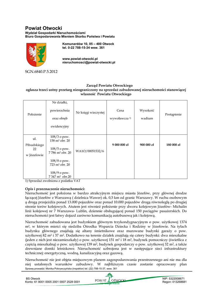 Powiat Otwocki Wydział Gospodarki Nieruchomościami Biuro Gospodarowania Mieniem Skarbu Państwa i Powiatu Komunardów 10, 05 – 400 Otwock tel. 0-22 788-15-34 wew. 361 www.powiat-otwocki.pl [email protected] SGN.6840.P.5.2012 Zarząd Powiatu Otwockiego ogłasza trzeci ustny przetarg nieograniczony na sprzedaż zabudowanej nieruchomości stanowiącej własność Powiatu Otwockiego Nr działki, powierzchnia Położenie Nr księgi wieczystej oraz obręb Cena Wysokość wywoławcza 1) wadium 9 000 000 zł 900 000 zł Postąpienie ewidencyjny ul. Piłsudskiego 22 w Józefowie 108/3 o pow. 158 m2 obr. 20 108/5 o pow. 7 786 m2 obr. 20 180 000 zł WA1O/00051532/6 108/8 o pow. 723 m2 obr. 20 108/9 o pow. 7 347 m2 obr.20 1) Sprzedaż zwolniona z podatku VAT Opis i przeznaczenie nieruchomości: Nieruchomość jest położona w bardzo atrakcyjnym miejscu miasta Józefów, przy głównej drodze łączącej Józefów z Warszawą ( dzielnica Wawer) ok. 0,5 km od granic Warszawy. W ruchu osobowym ą drogą przejeżdża ponad 13.000 pojazdów oraz ponad 10.000 pojazdów drogą równoległą po drugiej stronie torów kolejowych. Atutem jest również położenie przy dworu kolejowym Józefów- Michalin linii kolejowej nr 7 Warszawa- Lublin, dziennie obsługującej ponad 150 pociągów pasażerskich. Do nieruchomości jest łatwy dojazd zarówno komunikacją autobusową jak i kolejową. Nieruchomość zabudowana jest budynkiem głównym trzykondygnacyjnym o pow. użytkowej 1374 m2, w którym mieści się siedziba Ośrodka Wsparcia Dziecka i Rodziny w Józefowie. Na tyłach budynku głównego znajdują się altany śmietnikowe oraz murowane budynki garaży o pow. użytkowej 82 m2 i 37 m2. Dodatkowo na terenie działek znajdują się cztery budynki: dwa mieszkalne (jeden z nich jest niezamieszkały) o pow. użytkowej 151 m2 i 18 m2, budynek pomocniczy (świetlica z częścią mieszkalną) o pow. użytkowej 139 m2, budynek gospodarczy o pow. użytkowej 32 m2, a także drewniane domki letniskowe. Nieruchomość uzbrojona jest w następujące sieci infrastruktury technicznej: energetyczną, wodną, kanalizacyjną oraz gazową. Nieruchomość nie jest objęta miejscowym planem zagospodarowania przestrzennego ani nie ma dla niej ustalonych warunków zabudowy. W najbliższym czasie zostanie opracowany plan Sprawę prowadzi: Monika Pokrywczyńska (inspektor) tel. (22) 788-15-37, wew. 361 BS Otwock Konto: 61 8001 0005 2001 0007 2528 0001 NIP: 5322008671 Regon: 013268681 uwzględniający ustalenia . Studium uwarunkowań i kierunków zagospodarowania przestrzennego Miasta Józefowa dla nieruchomości położonej na terenach usług miastotwórczych i ogólnomiejskich (oznaczonych symbolem U). Trzeci ustny przetarg nieograniczony na sprzedaż nieruchomości odbędzie się w dniu 28 sierpnia 2013 r. o godz. 12 00 w siedzibie Starostwa Powiatowego w Otwocku przy ul. Górnej 13 – pokój nr 121 (sala konferencyjna). Wadium w wysokości podanej w tabeli należy wpłacić najpóźniej do dnia 23 sierpnia 2013 r. na konto depozytowe Starostwa Powiatowego w Otwocku ul. Górna 13, nr 07 8001 0005 2001 0007 2528 0003. Wadium wpłacone przez osobę, która wygra przetarg zostaje zaliczone na poczet ceny nabycia. Wadium przepada na rzecz sprzedającego w przypadku uchylenia się przez tę osobę od zawarcia umowy lub nie stawienia się bez usprawiedliwienia w terminie i miejscu zawarcia umowy, o którym wcześniej zostanie powiadomiona przez organizatora przetargu. Zwrot wadium uczestnikowi, który przetargu nie wygrał, następuje niezwłocznie nie później niż w ciągu trzech dni od dnia rozstrzygnięcia przetargu. Przetarg będzie ważny bez względu na liczbę uczestników, jeżeli chociaż jeden uczestnik zaoferuje jedno postąpienie powyżej ceny wywoławczej. Zastrzega się prawo odwołania przetargu z uzasadnionej przyczyny. Informacja o odwołaniu przetargu zostanie ogłoszona w formie właściwej dla ogłoszenia o przetargu. Ogłoszenie o przetargu podano na stronie internetowej: www.powiat-otwocki.pl. Dodatkowych informacji na temat przedstawionej nieruchomości oraz warunków przetargu uzyskać można w Wydziale Gospodarki Nieruchomościami z siedzibą w Otwocku – Świdrze, ul. Komunardów 10, wejście D, pok. 27 tel.: 788-15-37 lub 788-14-65 w. 361, 365. Przewodnicząca Zarządu Powiatu Sprawę prowadzi: Monika Pokrywczyńska (inspektor) tel. (22) 788-15-37, wew. 361 BS Otwock Konto: 61 8001 0005 2001 0007 2528 0001 NIP: 5322008671 Regon: 013268681