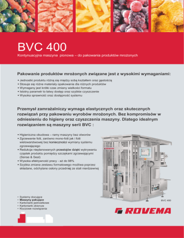 BVC 400 Kontynuacyjna maszyna pionowa – do pakowania produktów mrożonych Pakowanie produktów mrożonych związane jest z wysokimi wymaganiami: Jednostki produktu różną się między sobą kształtem oraz gęstością Stosuje się różne materiały opakowania dla różnych produktów Wymagany jest krótki czas zmiany wielkości formatu Istotny parametr to łatwy dostęp oraz szybkie czyszczenie Wysoka sprawność oraz dostępność systemu - Przemysł zamrażalniczy wymaga elastycznych oraz skutecznych rozwiązań przy pakowaniu wyrobów mrożonych. Bez kompromisów w odniesieniu do higieny oraz czyszczenia maszyny. Dlatego idealnym rozwiązaniem są maszyny serii BVC : Higieniczna obudowa – ramy maszyny bez otworów Zgrzewanie folii, zarówno mono-folii jak i folii wielowarstwowej bez konieczności wymiany systemu zgrzewającego Redukcja nieplanowanych przestojów dzięki wykrywaniu cząstek produktu pomiędzy szczękami zgrzewającymi (Sense & Seal) Wysoka efektywność pracy - aż do 98% Szybka zmiana zestawu formatowego możliwa poprzez składane, odchylane osłony przedniej ze stali nierdzewnej • • • • • Systemy dozujące Maszyny pakujące Kartoniarki jednostkowe Kartoniarki zbiorcze Kluczowe rozwiązania BVC 400 BVC 400 Kontynuacyjna maszyna pionowa – do pakowania produktów mrożonych Sterowanie i kontrola: komunikacja poprzez ekran dotykowy, menu w języku polskim przemysłowy komputer PC, zintegrowane oprogramowanie PLC, program ROVEMA P@ckControl pamięć 100 programów, licznik godzin pracy i wsadów, pamięć błędów oraz kontrola poprawności wprowadzonych danych automatyczne obliczanie parametrów zgrzewania oraz cyklu zgrzewania ustawianie pola nadruku (wzdłużnie) na ekranie dotykowym fotokomórka dla detekcji znacznika długości torebki na folii opakowaniowej instrukcja obsługi maszyny oraz podręcznik HELP dostępne na ekranie dotykowym modem dla diagnozy zakłóceń pracy na odległość Podstawowe wyposażenie maszyny w wersji ze stali nierdzewnej szczęki poprzeczne zgrzewające impulsowe w wersji do zgrzewania folii Mono-PE oraz wielowarstwowych motoryczny system odwijania folii, pneumatycznie rozprężany wałek folii płyta frontowa z uchwytami do mocowania zestawu formatowego bez konieczności stosowania narzędzi moduł formowania zgrzewu wzdłużnego torebek gorącym powietrzem regulacja siły docisku szczęk zgrzewających na ekranie dotykowym, skala w Niutonach regulacja zakresu ruchu szczęk zgrzewających na ekranie dotykowym maszyny stacja zgrzewu poprzecznego z napędem z dwóch serwomotorów automatyczne centrowanie folii na kołnierzu formującym wyeliminowana konieczność stosowania chłodzenia wodą napędy serwomotoryczne oraz elementy pneumatyki w szczelnej obudowie odczyty parametrów bez otwierania osłon maszyny stolik do sklejania folii z dwóch rolek dodatkowy tubus wewnętrzny z króćcem do odciągania powietrza BVC 400 – dane techniczne Wielkość formatu (szerokość torebki) 80 - 400 mm Opcjonalnie dla torebek z fałdami bocznymi 420 mm Długość torebki 150 - 540 mm Szerokość folii opakowaniowej do 880 mm Średnica rolki folii do 450 mm, opcjonalnie 600 mm Wydajności do 150 cykli/min Siła docisku do 8000 N ROVEMA GmbH 35463 Fernwald Mail: [email protected] ROVEMA Polska Sp. z o.o. 02-672 Warszawa Mail: [email protected] Passion for packaging