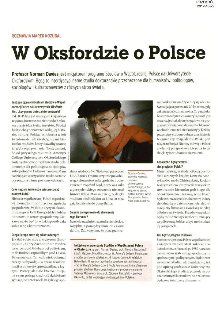 PRZEKRÓJ 2012-10-29 ROZMAWIA MAREK KOZUBAL W Oksfordzie o Polsce Profesor Norman Davies jest inicjatorem programu Studiów o Współczesnej Polsce na Uniwersytecie Oksfordzkim. Będą to interdyscyplinarne studia doktoranckie przeznaczone dla humanistów: politologów, socjologów i kulturoznawców z różnych stron świata. mi Polski stan wiedzy o niej się obniża. Sytuacja jest gorsza niż 20 lat temu, gdy zakończyła się zimna wojna. To paradoks, bo zimna wojna się skończyła, świat jest otwarty, jednak dotacje rządowe na pro gramy poświęcone dawnemu blokowi wschodniemu też się skończyły. Dzisiaj przeciętny student dobrze zna historię Niemiec czy Rosji, ale nie Polski. Jest tak, że to Rosja i Niemcy mówią o Polsce z własnej perspektywy. Liczę na to, że dzięki tym studiom to się zmieni. Jest pan ojcem chrzestnym studiów o Współ czesnej Polsce na Uniwersytecie Oksfordz kim. Liczy pan na duże zainteresowanie? Tak. Bo Polska jest znaczącym krajem tego regionu. Już teraz codziennie do Krako wa przyjeżdża tysiąc turystów. Młodzi ludzie chcą poznawać Polskę, jej histo rię, kulturę. Polska jest obecna w ich świadomości, ale niestety, nie ma kie runku studiów, który dawałby szansę jej głębszego poznania. To się zmieni, bo od przyszłego roku w St. Antony's College Uniwersytetu Oksfordzkiego zostaną utworzone trzyletnie studia dok toranckie dla politologów, socjologów, antropologów, kulturoznawców. Mam nadzieję, że w przyszłości nauka zostanie poszerzona o inne poziomy edukacji. Co w naszym kraju może zainteresować młodych ludzi? Historia współczesnej Polski to podsta wa. Ponadto imponujące osiągnięcia gospodarcze. W dobie kryzysu ekono micznego w Unii Europejskiej Polska odnotowuje wzrost gospodarczy. Cie kawe może być to, w jaki sposób dała sobie radę z komunizmem. Czego Europa może się od nas nauczyć? Jak dać sobie radę z kryzysem. Euro pejskie „żubry Zachodu" nie wiedzą teraz, co robić. Gdybym był politykiem, to do Brukseli zaprosiłbym prof. Leszka Balcerowicza. Ten człowiek dokonał rzeczy niebywałej - w czasie transfor macji ustrojowej wyprowadził kraj z kry zysu. Polacy jak mało kto rozumieją, na czym polega kruchość dzisiejszej sytuacji, bo przez wiele lat żyli w gospo Absolwenci będą tworzyli sieć przyjaciół Polski? darce niedoborów. Niedawno prezydent USA Barack Obama użył nieprawdzi wego sformułowania „polskie obozy śmierci". Popełnił błąd, ponieważ nikt z prezydenckiego otoczenia nie znał historii Polski. Mam nadzieję, że dzięki studiom oksfordzkim za kilka lat taka gafa będzie nie do pomyślenia. Norman Davies, brytyjski historyk, profesor Uniwersytetu Londyńskiego, autor książek na temat historii Europy, Wysp Brytyjskich i Polski. Kibic klubu Cracovia. Co pana zainspirowało do stworzenia tego kierunku? Na wielu uczelniach sąstudia niemieckie, rosyjskie, a pomiędzy nimi jest czarna dziura. Zauważyłem, że poza granica- Inicjatorami powstania Studiów o Współczesnej Polsce w Oksfordzie sa_ prof. Norman Oavies, prof. Timothy Garton Ash i prof. Margaret MacMillan, rektor St. Antony's College. Fundatorem studiów po stronie polskiej jest dr Leszek Czarnecki, właściciel Noble Bank. W ramach tego banku powołana została fundacja - St. Anthony's College Oxford Noble Foundation, która sfinansuje program studiów. Honorowymi patronami programu są premier Tadeusz Mazowiecki oraz prof. Zbigniew Pełczyński - profesor Oksfordu, od lat wspierający studiujących tam Polaków. Mam nadzieję, że studenci będą pocho dzili z różnych krajów. Liczę na Ame rykanów, może Chińczyków, Rosjan. Naszym celem jest przede wszystkim utworzenie kierunku polskiego dla obcokrajowców. Liczymy, że po latach będzie coraz więcej absolwentów, którzy się odnajdą w dziennikarstwie, dyplo macji czy biznesie i zwiększą wiedzę o Polsce na świecie. Przede wszystkim będą to ludzie wykształceni, znający współczesną Polskę, a być może także jej przyjaciele. Jaki będzie program studiów? Skoncentruje się na Polsce współczesnej, a więc przemianach lat 80., sukcesie i za łożeniach transformacji po 1989 r., a także dzisiejszym systemie gospodarczym, społecznym i politycznym. Doktorant wybierze fakultet, ale znajdzie się też pod opieką profesora z Uniwersytetu Oksfordzkiego. Studia te pozwolą na po znanie innych kierunków, bo z założenia będą one interdyscyplinarne.