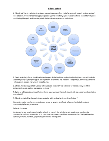 Bilans szkód 1. Określ jak Twoje zadłużenie wpływa na podstawowe sfery życia/w wolnych kołach możesz wpisać inne obszary. Obok kół oznaczających poszczególne dziedziny życia wpisz hasłowo charakterystyczne przykłady głównych problemów jakich doświadczasz z powodu zadłużenia. 2. Oceń, w której sferze skutki zadłużenia są na dziś dla ciebie najbardziej dolegliwe – zakreśl to koło. Uzasadnij swój wybór podając b. szczegółowe przykłady. Np. Rodzina – separacja, alimenty; Zdrowie – źle sypiam, cierpię na wrzody żołądka, itd. 3. Określ /korzystając z listy uczuć/ jakie uczucia pojawiały się u Ciebie w trakcie pracy nad tym zestawieniem, co czujesz patrząc na to teraz ? 4. Opisz w jaki sposób unikałaś/eś myślenia o powyższych faktach kiedyś, jak się przed tym broniłeś w przeszłości ? 5. Określ co dało Ci wykonanie tego zadania, jakie pojawiły się myśli, refleksje ? Uczestnicy zajęć kolejno prezentują swe prace w grupie, dzielą się własnymi doświadczeniami, przekazują informacje zwrotne. Zadanie domowe Kontynuuj pracę analizując nie tylko szkody w innych sferach życia, ale wzajemne powiązania problemów z różnych dziedzin. W b. osobistych sprawach problem możesz omówić indywidualnie z wybranym konsultantem, psychologiem lub na mitingu DA.