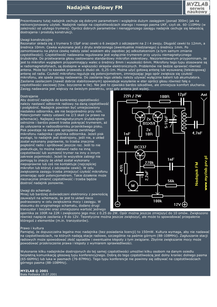 Nadajnik radiowy FM Prezentowany tutaj nadajnik cechuje się dobrymi parametrami i względnie dużym zasięgiem (ponad 300m) jak na nielicencjonowany użytek. Nadajnik nadaje na częstotliwościach starego i nowego pasma UKF, czyli ok. 60-110MHz (w zależności od użytego trymera). Oprócz dobrych parametrów i nienajgorszego zasięgu nadajnik cechuje się łatwością dostrajania i prostotą konstrukcji. Uwagi konstrukcyjne Rezonator składa się z trymera 5-15pF oraz cewki o 6 zwojach z odczepami na 2 i 4 zwoju. Długość cewki to 12mm, a średnica 10mm. Cewka wykonana jest z drutu srebrzonego (ewentualnie miedzianego) o średnicy 1mm. Po zamontowaniu na płytce cewkę należy zalać woskiem aby zapobiec jej odkształceniom (a tym samym zmianie częstotliwości). Częstotliwość nadawania regulowana jest wyłącznie trymerem przy uzyciu niemagnetycznego śrubokręta. Do przetwarania głosu zastowoano standardowy mikrofon elekretowy. Niezorientowanym przypominam, że jest to mikrofon wyglądem przypominający walec o średnicy 8mm i wysokości 6mm. Mikrofony tego typu stosowane są w radiomagnetofonach, są dostepne w większości sklepów elektronicznych. Problemów nie bedzie sprawiać również antena. Może być to kawałek przewodu o dłuści ok. 0,25-1m. Można użyć gotową antenę lub wysuwaną (teleskopową) antenę od radia. Czułość mikrofonu reguluje się potencjometrem, zmniejszając jego opór zwiększa się czułość mikrofonu, ale spada zasięg nadawania. Do zasilania tego układu należy używać wyłącznie baterii lub akumulatora. Zasilanie zasilaczem (nawet dobrze stabilizowanym) spowoduje wysyłanie w eter oprócz głosu również falę o częstotliwości sieciowej (tzw. bzyczenie w tle). Nie jest to zjawisko bardzo szkodliwe, ale zmniejsza komfort słuchania. Zasięg nadawania jest większy na świeżym powietrzu, oraz gdy antena jest wyżej. Dostrajanie Aby dostroić nadajnik do konkrentej częstotliwości należy nastawić odbiornik radiowy na daną częstotliwość i podgłośnić. Nadajnik powinien być umiejscowiony niedaleko odbiornika, ale nie bezpośrednio przy nim. Potencjometr należy ustawić na 2/3 skali (w prawo na schemacie). Najlepiej niemagnetycznym śrubokrętem ostrożnie i bardzo powoli trzeba pokręcać trymerem, aż do usłyszenia w radioodbiorniku przenikliwego pisku. Pisk powstaje na wskutek sprzężenia zwrotnego mikrofonu nadajnika i głośnika odbiornika. Jeżeli pisk wystąpi, to nadajnik jest dostrojony, jeśli nie, a układ został wykonany poprawnie, to trzeba znacznie pogłośnić radio i spróbować jeszcze raz. Jeśli to nie poskutkuje, to można nastawić radio na inną częstotliwość lub wymienić trymer na inny o innym zakresie pojemności. Jeżeli te wszystkie zabiegi nie pomogą to znaczy że układ został wykonany niepoprawnie lub coś nie kontaktuje (najczęściej mikrofon lub któryś z odczepów cewki). W celu zwiększenia zasięgu trzeba zmiejszyć czyłość mikrofonu zmieniając opór potencjometrem. Takie działenie może nieznacznie zmienić częstotliwość i trzeba będzie dostroić nadajnik ponownie. Uwagi do schematu Mniej lub bardziej doświadczeni elektronicy z pewnością zauważyli na schemacie, że jest to układ nieco podrasowany w celu zwiększenia mocy i zasięgu. W stosunku do oryginalnego schamatu, dodano drugi tranzystor i bocznki oraz zmniejszono wartość jednego opornika ze 100R na 22R i zwiększono jego moc z 0.25 do 2W. Opór można jeszcze zmiejszyć do 10 omów. Zwiększono również napięcie zasilania z 9 do 12V. Teoretyczne można jeszcze zwiększyć, ale może to spowodować przepalenie któregoś z elementów (m.in. tranzystorów). Prawo i kultura Pamiętaj, że dopuszczalna legalna moc nadajnika (bez posiadania licencji) to 150mW. Kultura wymaga, aby nie nadawać na częstotliwościach, na których nadają stacje radiowe, szczególnie na paśmie górnym (88-108MHz). Zagłuszanie stacji radiowych może spowodować złość sąsiadów i ewentualne kłopoty z tym związane. Zbytnie zwiększanie mocy może powodować przekroczenie prawa i kłopoty z wymiarem sprawiedliwości. Wykonanie kilku nadajników dostrojonych do tej samej częstotliwości umożliwi kilku osobom na danym osiedlu bezpłatną komunikację głosową typu konferencyjnego. Dobrą do tego częstotliwością jest dolny kraniec dolnego pasma (65-66MHz) lub luka w pasmach (76-87MHz). Tego typu konferencje nie powinny się odbywać na częstotliwościach górnego pasma (88-108MHz). MYZLAB © 2001 Biała Podlaska 19.07.2001