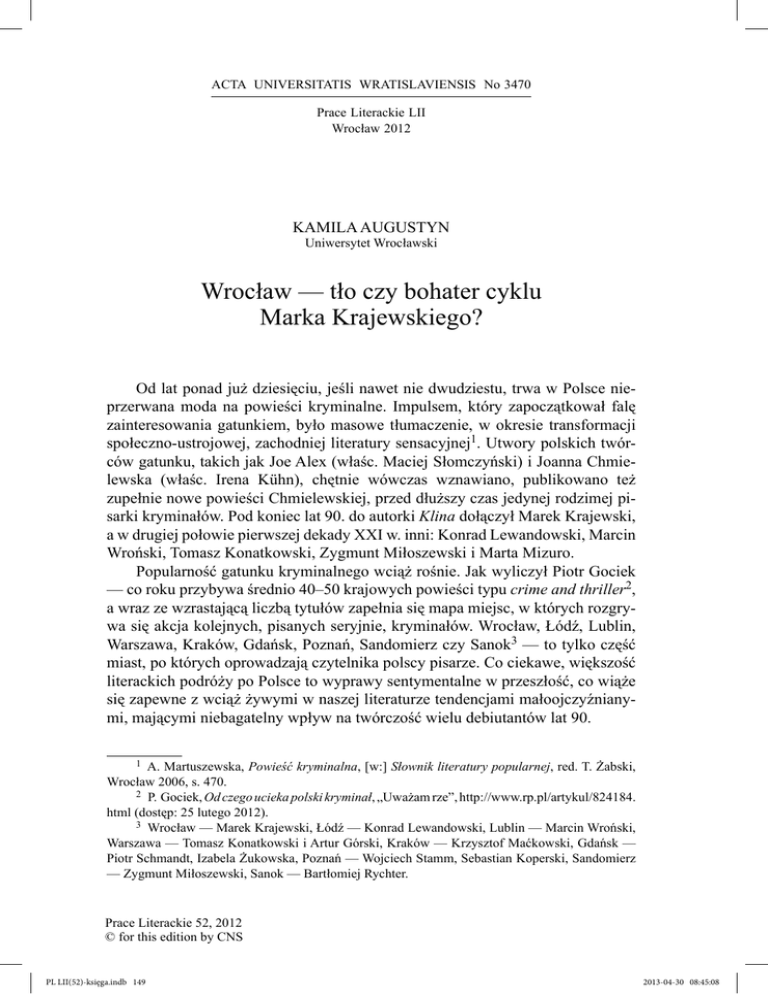 ACTA UNIVERSITATIS WRATISLAVIENSIS No 3470 Wrocław — tło czy bohater cyklu Marka Krajewskiego? 149 Prace Literackie LII Wrocław 2012 KAMILA AUGUSTYN Uniwersytet Wrocławski Wrocław — tło czy bohater cyklu Marka Krajewskiego? Od lat ponad już dziesięciu, jeśli nawet nie dwudziestu, trwa w Polsce nieprzerwana moda na powieści kryminalne. Impulsem, który zapoczątkował falę zainteresowania gatunkiem, było masowe tłumaczenie, w okresie transformacji społeczno-ustrojowej, zachodniej literatury sensacyjnej1. Utwory polskich twórców gatunku, takich jak Joe Alex (właśc. Maciej Słomczyński) i Joanna Chmielewska (właśc. Irena Kühn), chętnie wówczas wznawiano, publikowano też zupełnie nowe powieści Chmielewskiej, przed dłuższy czas jedynej rodzimej pisarki kryminałów. Pod koniec lat 90. do autorki Klina dołączył Marek Krajewski, a w drugiej połowie pierwszej dekady XXI w. inni: Konrad Lewandowski, Marcin Wroński, Tomasz Konatkowski, Zygmunt Miłoszewski i Marta Mizuro. Popularność gatunku kryminalnego wciąż rośnie. Jak wyliczył Piotr Gociek — co roku przybywa średnio 40–50 krajowych powieści typu crime and thriller2, a wraz ze wzrastającą liczbą tytułów zapełnia się mapa miejsc, w których rozgrywa się akcja kolejnych, pisanych seryjnie, kryminałów. Wrocław, Łódź, Lublin, Warszawa, Kraków, Gdańsk, Poznań, Sandomierz czy Sanok3 — to tylko część miast, po których oprowadzają czytelnika polscy pisarze. Co ciekawe, większość literackich podróży po Polsce to wyprawy sentymentalne w przeszłość, co wiąże się zapewne z wciąż żywymi w naszej literaturze tendencjami małoojczyźnianymi, mającymi niebagatelny wpływ na twórczość wielu debiutantów lat 90. 1 A. Martuszewska, Powieść kryminalna, [w:] Słownik literatury popularnej, red. T. Żabski, Wrocław 2006, s. 470. 2 P. Gociek, Od czego ucieka polski kryminał, „Uważam rze”, http://www.rp.pl/artykul/824184. html (dostęp: 25 lutego 2012). 3 Wrocław — Marek Krajewski, Łódź — Konrad Lewandowski, Lublin — Marcin Wroński, Warszawa — Tomasz Konatkowski i Artur Górski, Kraków — Krzysztof Maćkowski, Gdańsk — Piotr Schmandt, Izabela Żukowska, Poznań — Wojciech Stamm, Sebastian Koperski, Sandomierz — Zygmunt Miłoszewski, Sanok — Bartłomiej Rychter. Prace Literackie 52, 2012 © for this edition by CNS PL LII(52)-księga.indb 149 2013-04-30 08:45:08 150 KAMILA AUGUSTYN Marek Krajewski bez wątpienia zalicza się do grona pisarzy, dla których ojczyźniany kontekst ma znaczenie; przekonujemy się o tym, czytając cykl kryminałów z Breslau w tytule. Wizja przeszłości miasta, jaką przedstawia nam autor Śmierci w Breslau, jest jednak odmienna od typowego, a więc bardzo zmitologizowanego obrazu, znanego z kanonicznych utworów należących do nurtu „literatury korzennej”4. Odmienność można oczywiście wyjaśnić różnicami gatunkowymi, znacząco wpływającymi na konstrukcję świata przedstawionego w poszczególnych utworach. Z podporządkowania treści formie wynika często służebność warstwy przedmiotów5, stąd zagrożenie, że mimo dość pieczołowicie odtworzonych realiów topograficznych międzywojennego Wrocławia nadodrzańska metropolia może być w całym cyklu kryminalnym Krajewskiego zaledwie tłem kolejnego śledztwa Eberharda Mocka — głównego bohatera powieści. Potwierdzenia donioślejszej roli miasta, niż tylko jako scenerii retrokryminałów, należałoby szukać w stylistyce, organizacji czasowo-przestrzennej zdarzeń, drabinkach scenariuszowych i kreacji postaci. Po publikacji debiutanckiej Śmierci w Breslau i drugim w kolejności Końcu świata w Breslau Krajewskiego chwalono za wierne i nastrojowe przedstawienie Wrocławia lat 20. i 30. minionego wieku i stworzenie „zaskakującej, niejednoznacznej, a przez to intrygującej historii kryminalnej, wciągnięcie czytelnika w erudycyjną grę domysłów”6. W cyklu dopatrywano się podobieństw do powieści Raymonda Chandlera osadzonych w nurcie noir — popularnym tuż po drugiej wojnie światowej, a powracającym ponownie na ekrany kin od końca lat 70. Krajewski chętnie podkreśla swoją fascynację twórczością amerykańskiego pisarza7 oraz współczesnymi filmami pozostającymi w konwencji neonoir i stylistyka thrillerów psychologicznych osadzonych w Breslau istotnie przypomina tę, którą pamiętamy z powieści Żegnaj laleczko, Siostrzyczki czy filmów Harry Angel albo Sin City — miasto grzechu8. Przedwojenny Wrocław to może nie miasto gangster4 Nurt „literatury korzennej”, zwany także nurtem literatury „ojczyźnianej” czy „małoojczyźnianej”, współtworzą takie utwory, jak: Hanemann Stefana Chwina, Lida Aleksandra Jurewicza, Dolina Issy Czesława Miłosza, Opowieści galicyjskie Andrzeja Stasiuka, Ujrzane, w czasie zatrzymane Zbigniewa Żakiewicza, Powrót do Breitenheide Włodzimierza Kowalewskiego, Zasypie wszystko, zawieje… Włodzimierza Odojewskiego, Dziura w niebie i Bohiń Tadeusza Konwickiego, Na wysokiej połoninie Stanisława Vincenza, Mój Lwów Józefa Wittlina. 5 R. Ingarden, Z teorii dzieła literackiego, [w:] Teorie literatury XX wieku. Antologia, red. A. Burzyńska, M.P. Markowski, Kraków 2007. 6 P. Huniewicz, (rec.) Marek Krajewski — Koniec świata w Breslau, http://www.ksiazka. net.pl/index.php?id=49&tx_ttnews[tt_news]=1788&tx_ttnews [backPid]=49&cHash=b07f856711 (dostęp: 3 lutego 2012). 7 Poprawki w mundurze esesmana. Z Markiem Krajewskim rozmawiał Wojciech Orliński, „Gazeta Wyborcza. Wysokie Obcasy” 25 lutego 2008, http://www.wysokieobcasy.pl/wysokieobcasy/1,53581,4950784.html (dostęp: 25 lutego 2008); Po piętnastej. Marek Krajewski opowiada Stanisławowi Łubieńskiemu o fascynacji Breslau i o tym, co łączy pracę filologa i detektywa, „Lampa” 2006, nr 2 (23). 8 Harry Angel reż. Alan Parker, Sin City — miasto grzechu reż. Robert Rodriguez. Prace Literackie 52, 2012 © 