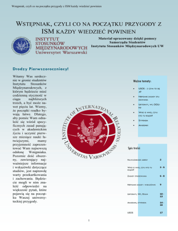 Wstępniak, czyli co na początku przygody z ISM każdy wiedzieć powinien WSTĘPNIAK, CZYLI CO NA POCZĄTKU PRZYGODY Z ISM KAŻDY WIEDZIEĆ POWINIEN Materiał opracowany dzięki pomocy Samorządu Studentów Instytutu Stosunków Międzynarodowych UW Drodzy Pierwszoroczniacy! Witamy Was serdecznie w gronie studentów Instytutu Stosunków Międzynarodowych, z którym będziecie mieć codzienną styczność w ciągu najbliższych trzech, a być może nawet pięciu lat. Wiemy, że początki rzadko bywają łatwe. Dlatego, aby pomóc Wam odnaleźć się wśród specyficznych zasad panujących w akademickim życiu i uczynić pierwsze miesiące nauki łatwiejszymi, mamy przyjemność zaprezentować Wam najnowszą odsłonę Wstępniaka. Pozornie dość obszerny, zawierający najważniejsze informacje i wskazówki dotyczące studiów, jest naprawdę warty przekartkowania i zachowania. Będziecie mogli w nim znaleźć odpowiedzi na większość pytań, które pojawią się na początku Waszej uniwersyteckiej przygody. Ważne tematy: USOS - Z CZYM TO SIĘ JE? NIEPISANE ZASADY STUDIOWANIA LEKTORATY, WF, OGUNY WHO IS WHO, CZYLI KTO TU RZĄDZI? STYPENDIA AKADEMIKI Spis treści 1 NAJWAŻNIEJSZE ADRESY 2 WHO IS WHO, CZYLI KTO TU RZĄDZI? 3-5 ZASADY STUDIOWANIA 6-8 NIEPISANE ZASADY I WSKAZÓWKI 9 LEKTORATY, WF, OGUN 10 13 AKADEMIKI, STYPENDIA 14 16 USOS 17 Wstępniak, czyli co na początku przygody z ISM każdy wiedzieć powinien Przede wszystkim - najważniejsze adresy www! A) www.ism.uw.edu.pl - oficjalna strona Instytutu; znajdziecie na niej informacje o planach zajęć, dyżurach kadry, wiadomości od wykładowców i - o czym często studenci zapominają - sylabusy do zajęć B) www.wdinp.uw.edu.pl - tutaj znajdziecie informacje związane z życiem całego wydziału - USOS, stypendia, najważniejsze dokumenty C) https://usosweb.wdinp.uw.edu.pl - wiele wieczorów spędzicie, wpatrując się tę witrynę, bo to właśnie za pomocą systemu USOS będziecie się rejestrować na zajęcia D) http://www.wdinp.uw.edu.pl/usos/ - strona pełnomocnika do spraw USOS WDiNP - patrona spraw beznadziejnych E) http://www.rejestracja.usos.uw.edu.pl/ - tu odbywać się będzie rejestracja żetonowa, dzięki której będziecie mogli zapisać się na WF, lektoraty i przedmioty ogólnouniwersyteckie F) http://samorzad.uw.edu.pl/ - wszelkie informacje dotyczące działalności samorządu studenckiego UW ŻURAWIA 4, IV PIĘTRO - NASZA SIEDZIBA GŁÓWNA; ODBYWA SIĘ TU Adresy wciąż potrzebne, ale nieco mniej wirtualne A) Żurawia 4, IV piętro - nasza siedziba główna; odbywa się tu większość ćwiczeń, mają miejsce dyżury kadry, a przy odrobinie szczęścia uda Wam się również odnaleźć pokój samorządu B) Krakowskie Przedmieście 3 (pseudonim operacyjny KP3) - siedziba naszej sekcji studenckiej z Panią Sylwią Ziółkowską na czele, dziekanatu, komisji stypendialnej i kasy C) Nowy Świat 67 - odbywają się tam ćwiczenia i wykłady D) Bednarska 2/4 - odbywają się tam niektóre ćwiczenia E) Nowy Świat 69 - siedziba biblioteki wydziałowej, odbywają się tutaj również niektóre ćwiczenia F) Krakowskie Przedmieście 26/28 - kampus główny UW, gdzie w Auditorium Maximum odbywać się będą Wasze wykłady WIĘKSZOŚĆ ĆWICZEŃ, MAJĄ MIEJSCE DYŻURY KADRY 2 Wstępniak, czyli co na początku przygody z ISM każdy wiedzieć powinien Who is who, czyli kto tu rządzi? Kolegium Dziekańskie WDiNP Prof. dr hab. Janusz Adamowski Dziekan Prof. UW, dr hab. Wojciech Jakubowski - Prodziekan ds. badań naukowych i współpracy z zagranicą WŁAŚCIWA HISTORIA WYDZIAŁU DZIENNIKARSTWA I NAUK POLITYCZNYCH ROZPOCZYNA SIĘ 1975 ROKU – W NOWOUTWORZON EJ JEDNOSTCE PROWADZONO NAUCZANIE NA KIERUNKACH DZIENNIKARSTWO I NAUKI POLITYCZNE Prof. UW, dr hab. Gertruda Uścińska Prodziekan ds. studenckich 3 Wstępniak, czyli co na początku przygody z ISM każdy wiedzieć powinien Dyrekcja ISM Prof. dr hab. Edward Haliżak Dyrektor ISM Dr Agnieszka Bógdał-Brzezińska Zastępca Dyrektora ds. dydaktycznych INSTYTUT STOSUNKÓW MIĘDZYNARODOWY CH (ISM) ROZPOCZĄŁ DZIAŁALNOŚĆ 1 PAŹDZIERNIKA 1976R. W RAMACH UTWORZONEGO ROK WCZEŚNIEJ WYDZIAŁU Dr Jakub Zajączkowski Zastępca Dyrektora ds. współpracy z zagranicą 4 DZIENNIKARSTWA I NAUK POLITYCZNYCH UNIWERSYTETU Wstępniak, czyli co na początku przygody z ISM każdy wiedzieć powinien Sekcja studencka Kierownikiem studiów dziennych I stopnia (licencjackich), ale również studiów II stopnia (magisterskich) jest dr Anna Wróbel Kierownikiem studiów zaocznych i wieczorowych I stopnia (licencjackich), ale również studiów II stopnia (magisterskich) jest mgr Iwona Wyciechowska Kierownikiem sekcji studenckiej dla studentów dziennych i wieczorowych jest mgr Sylwia Ziółkowska, natomiast studiami zaocznymi zajmuje się mgr Wiesława Czechowska – siedziba sekcji studenckiej znajduje się na Krakowskim Przedmieściu 3 sala 206 (II piętro). Godziny pracy sekcji: poniedziałek 12:00-15:00 wtorek 11:00-14:00 środa 12:00-15:00 czwartek 9:00-12:00 piątek nieczynne 5 Wstępniak, czyli co na początku przygody z ISM każdy wiedzieć powinien Zasady studiowania - zaliczanie przedmiotów ZAZWYCZAJ PRZYSŁUGUJĄ NAM DWIE NIEOBECNOŚCI NA ZAJĘCIACH OBOWIĄZKOW YCH (KONWERSATOR IUM, ĆWICZENIA) Prowadzący zajęcia zobowiązany jest do informowania studentów najpóźniej na drugich zajęciach o zasadach zaliczania, formie zaliczenia i formie egzaminu oraz zasadach zaliczania nieobecności i ich limicie. Zazwyczaj przysługują nam dwie nieobecności na zajęciach obow i ą z k o w y c h (konwersatorium, ćwiczenia). Nieobecność studenta może zostać usprawiedliwiona pod warunkiem, że natychmiast po ustaniu przyczyny absencji dostarczy on prowadzącemu zajęcia usprawiedliwienie potwierdzające niemożność uczestnictwa w zajęciach. Powodem usprawiedliwienia nieobecności może być w szczególności choroba lub inne wydarzenia losowe. Choroba musi być potwierdzona zaświa