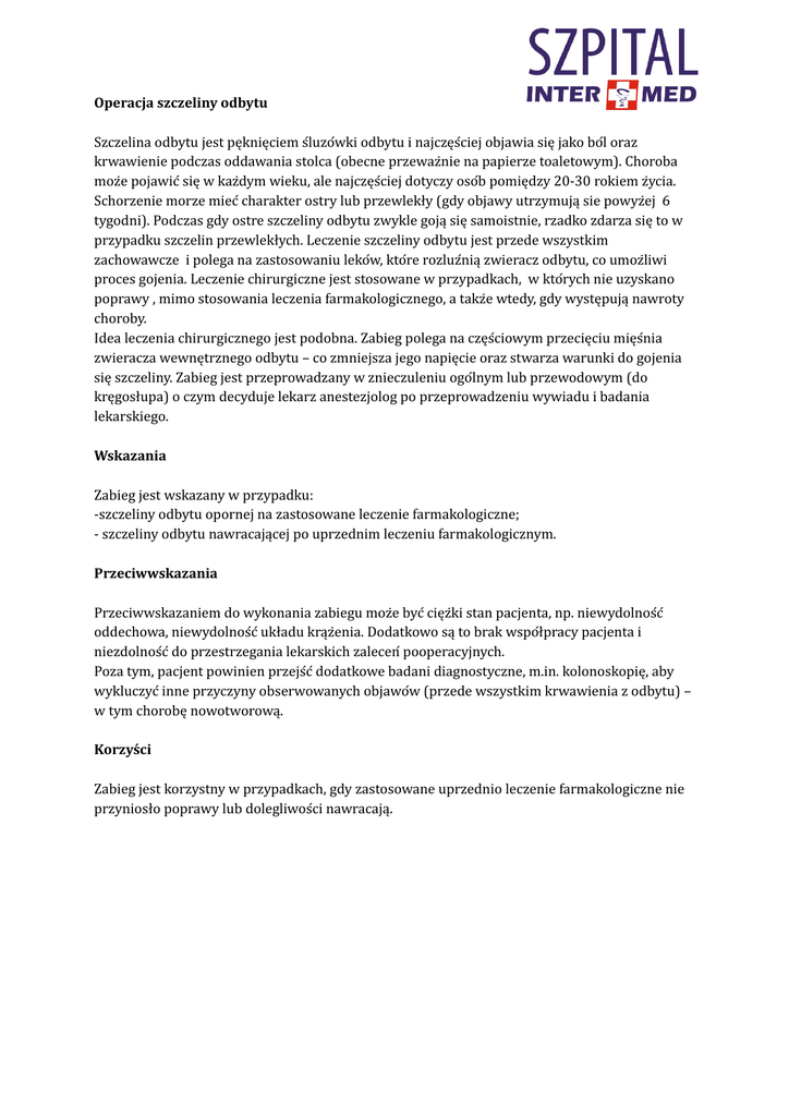 Operacja szczeliny odbytu Szczelina odbytu jest pęknięciem slluzolwki odbytu i najczęslciej objawia się jako boll oraz krwawienie podczas oddawania stolca (obecne przewazinie na papierze toaletowym). Choroba mozie pojawicl się w kazidym wieku, ale najczęslciej dotyczy osolb pomiędzy 20-30 rokiem ziycia. Schorzenie morze miecl charakter ostry lub przewlekły (gdy objawy utrzymują sie powyziej t tygodni). Podczas gdy ostre szczeliny odbytu zwykle goją się samoistnie, rzadko zdarza się to w przypadku szczelin przewlekłych. Leczenie szczeliny odbytu jest przede wszystkim zachowawcze i polega na zastosowaniu lekolw, ktolre rozluzlnią zwieracz odbytu, co umoziliwi proces gojenia. Leczenie chirurgiczne jest stosowane w przypadkach, w ktolrych nie uzyskano poprawy , mimo stosowania leczenia farmakologicznego, a takzie wtedy, gdy występują nawroty choroby. Idea leczenia chirurgicznego jest podobna. Zabieg polega na częslciowym przecięciu mięslnia zwieracza wewnętrznego odbytu – co zmniejsza jego napięcie oraz stwarza warunki do gojenia się szczeliny. Zabieg jest przeprowadzany w znieczuleniu ogollnym lub przewodowym (do kręgosłupa) o czym decyduje lekarz anestezjolog po przeprowadzeniu wywiadu i badania lekarskiego. Wskazania Zabieg jest wskazany w przypadku: -szczeliny odbytu opornej na zastosowane leczenie farmakologiczne; - szczeliny odbytu nawracającej po uprzednim leczeniu farmakologicznym. Przeciwwskazania Przeciwwskazaniem do wykonania zabiegu mozie bycl cięziki stan pacjenta, np. niewydolnoslcl oddechowa, niewydolnoslcl układu krązienia. Dodatkowo są to brak wspolłpracy pacjenta i niezdolnoslcl do przestrzegania lekarskich zalecenl pooperacyjnych. Poza tym, pacjent powinien przejslcl dodatkowe badani diagnostyczne, m.in. kolonoskopię, aby wykluczycl inne przyczyny obserwowanych objawolw (przede wszystkim krwawienia z odbytu) – w tym chorobę nowotworową. Korzyści Zabieg jest korzystny w przypadkach, gdy zastosowane uprzednio leczenie farmakologiczne nie przyniosło poprawy lub dolegliwoslci nawracają.