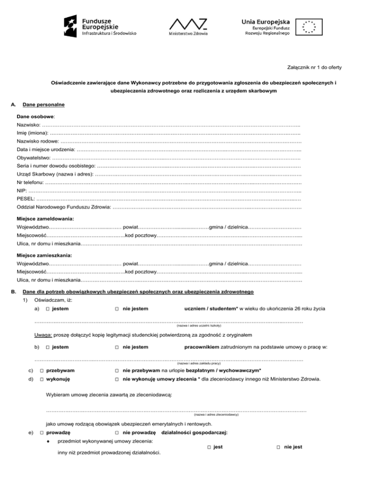 Załącznik nr 1 do oferty Oświadczenie zawierające dane Wykonawcy potrzebne do przygotowania zgłoszenia do ubezpieczeń społecznych i ubezpieczenia zdrowotnego oraz rozliczenia z urzędem skarbowym A. Dane personalne Dane osobowe: Nazwisko: ………………………………………………………………………………………………………………………………….. Imię (imiona): …………………………………………………..………………………………………………………………………….. Nazwisko rodowe: ………………………………………………….……………………………………………………………………… Data i miejsce urodzenia: …………………………………………………………………………..…………………………………….. Obywatelstwo: ………………………………………………………..…………………………………………..……………………….. Seria i numer dowodu osobistego: …………………………………..…………………………………………..……………………… Urząd Skarbowy (nazwa i adres): ……………………………………………………………..…………….……………...…………… Nr telefonu: ………………………………………………………………………..………………………………..………..…….………. NIP: ………………………………………….………………..…………………………………………………………………………….. PESEL: .………………..………………..……………………………………..………………………………………………………...… Oddział Narodowego Funduszu Zdrowia: …………………………………………………………………….………………………… Miejsce zameldowania: Województwo………………………….......…… powiat………………….............………gmina / dzielnica………….……………… Miejscowość………………………………..……..kod pocztowy……………..……………………………..…………………………... Ulica, nr domu i mieszkania……………………………..………………………………………………………………………………… Miejsce zamieszkania: Województwo………………………….......…… powiat………………….............………gmina / dzielnica………….……………… Miejscowość………………………………..……..kod pocztowy……………..……………………………..…………………………... Ulica, nr domu i mieszkania……………………………..………………………………………………………………………………… B. Dane dla potrzeb obowiązkowych ubezpieczeń społecznych oraz ubezpieczenia zdrowotnego Oświadczam, iż: 1) a) jestem nie jestem uczniem / studentem* w wieku do ukończenia 26 roku życia ……………………………………………………………………………………………………………………………..………… (nazwa i adres uczelni /szkoły) Uwaga: proszę dołączyć kopię legitymacji studenckiej potwierdzoną za zgodność z oryginałem b) jestem nie jestem pracownikiem zatrudnionym na podstawie umowy o pracę w: …………………………….…………………………………………………………………………………………………………. (nazwa i adres zakładu pracy) c) przebywam nie przebywam na urlopie bezpłatnym / wychowawczym* d) wykonuję nie wykonuję umowy zlecenia * dla zleceniodawcy innego niż Ministerstwo Zdrowia. Wybieram umowę zlecenia zawartą ze zleceniodawcą: …………………………………………………………………………………………………………………………………… (nazwa i adres zleceniodawcy) jako umowę rodzącą obowiązek ubezpieczeń emerytalnych i rentowych. e) prowadzę nie prowadzę przedmiot wykonywanej umowy zlecenia: inny niż przedmiot prowadzonej działalności. działalności gospodarczej: jest nie jest przychód z tytułu zawartej umowy zlecenia z Ministerstwem Zdrowia 1) jest nie jest niższy od minimalnej podstawy wymiaru składek na ubezpieczenia społeczne z tytułu prowadzonej działalności. wybieram opłacanie obowiązkowych składek emerytalno-rentowych2) od umowy zlecenia w MZ f) wyrażam jestem prowadzonej działalności gospodarczej nie wyrażam zgody na objęcie dobrowolnym ubezpieczeniem emerytalno-rentowym 3) nie jestem zarejestrowany(a) w Urzędzie Pracy jako bezrobotny z prawem bez prawa do zasiłku ……………………………………………………………………………………………………………………………………… (nazwa i adres Urzędu Pracy) g) jestem nie jestem emerytem / rencistą* ………..………………………………………………. (nr emerytury / renty) h) 2) C. mam nie mam orzeczony lekki / umiarkowany / znaczny* stopień niepełnosprawności Umowa zlecenia zawarta od ………..…………………………… do ……..…………………………………………… Dane dla potrzeb dobrowolnych ubezpieczeń emerytalno-rentowych i dobrowolnego ubezpieczenia chorobowego 1) zgłaszam nie zgłaszam wniosku o objęcie mnie dobrowolnym ubezpieczeniem emerytalno – rentowym z tytułu wykonywanej umowy cywilnoprawnej 2) zgłaszam nie zgłaszam wniosku o objęcie mnie dobrowolnym ubezpieczeniem chorobowym z tytułu wykonywanej umowy cywilnoprawnej * niepotrzebne skreślić Oświadczam, że powyższe zgłoszenie wypełniłem(am) zgodnie z prawdą i że jestem świadomy(a) odpowiedzialności karnej z art. 233 §1 Kodeksu karnego za zeznanie nieprawdy lub zatajenie prawdy. Pr