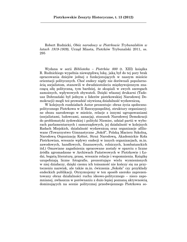 Piotrkowskie Zeszyty Historyczne, t. 13 (2012) _______________________________________________________________ Robert Rudnicki, Obóz narodowy w Piotrkowie Trybunalskim w latach 1919-1939), Urząd Miasta, Piotrków Trybunalski 2011, ss. 295 Wydana w serii Biblioteka – Piotrków 800 (t. XIII) ksiąŜka R. Rudnickiego wypełnia niewątpliwą lukę, jaką był do tej pory brak opracowania dziejów jednej z funkcjonujących w naszym mieście orientacji politycznych. Choć endecy nigdy nie dorównali popularnością socjalistom, stanowili w dwudziestoleciu międzywojennym znaczącą siłę polityczną, tym bardziej, Ŝe skupiali w swych szeregach zamoŜnych, wpływowych obywateli. Dzięki własnej drukarni (Tadeusz Dobrzański był jednym z liderów piotrkowskiej Narodowej Demokracji) mogli teŜ prowadzić oŜywioną działalność wydawniczą. W kolejnych rozdziałach Autor prezentuje: obraz Ŝycia społecznopolitycznego Piotrkowa w II Rzeczypospolitej, struktury organizacyjne obozu narodowego w mieście, relacje z innymi ugrupowaniami (socjalistami, ludowcami, sanacją), stosunek Narodowej Demokracji do problematyki Ŝydowskiej i polityki Niemiec, udział partii w wyborach parlamentarnych i samorządowych, jej działalność w kolejnych Radach Miejskich, działalność wydawniczą oraz organizacje afiliowane (Towarzystwo Gimnastyczne „Sokół”, Polską Macierz Szkolną, Narodową Organizację Kobiet, StraŜ Narodową, Akademickie Koła Piotrkowian, wreszcie wpływy endecji w innych organizacjach, m.in. zawodowych, handlowych, finansowych, rolniczych, kombatanckich itd.) Omawiane zagadnienia opracowane zostały w oparciu o liczne źródła zgromadzone w Archiwach Państwowych w Piotrkowie i Łodzi, bogatą literaturę, prasę, wreszcie relacje i wspomnienia. KsiąŜkę uzupełniają liczne fotografie, prezentujące wielu wymienionych w niej działaczy, dzięki czemu ich toŜsamość nie kończy się na przytoczeniu nazwisk, ale takŜe m.in. ćwiczenia „Sokoła” czy przykłady endeckich publikacji. Otrzymujemy w ten sposób szeroko zaprezentowany obraz działalności ruchu ideowo-politycznego – nieco zapomnianej, zwłaszcza w porównaniu z duŜo lepiej poznaną aktywnością dominujących na scenie politycznej przedwojennego Piotrkowa so- Daniel Warzocha _______________________________________________________________ cjalistów. Oprócz zagadnień politycznych poznajemy takŜe działalność róŜnych organizacji społecznych, takŜe w aspektach dość od polityki odległych, jak oświata, sport czy działania samopomocowe piotrkowian studiujących w Warszawie czy Krakowie. Publikacja godna jest niewątpliwej uwagi, toteŜ streszczanie jej zawartości nie jest celem niniejszej recenzji. Do niektórych zawartych w niej treści wypada jednak odnieść się krytycznie. W wielu miejscach ksiąŜki wyraźnie widoczna jest sympatia Autora do opisywanego nurtu politycznego. Autor oczywiście ma do tego prawo. Spotykamy jednak sformułowania zdecydowanie odbiegające od zasad obiektywizmu, jak np. stronnictwo, które na początku lat 20. spełniało oczekiwania przewaŜającej części społeczeństwa polskiego (s. 5) – gdyby tak faktycznie było, narodowcy wygraliby wybory duŜą większością i tworzyliby samodzielnie rząd, do czego nie doszło. Uczestniczyli wyłącznie w rządach koalicyjnych. Przy okazji Autor podkreśla, Ŝe w PRL dzieje ruchu narodowego były fałszowane i zakłamywane (s. 9) – to prawda, ale zakłamywaniu podlegały wówczas takŜe inne obszary historii najnowszej. Dzieje endecji nie były jakimś wyjątkiem. Pisząc, Ŝe masonerii zarzuca się działalność na szkodę państw narodowych (s. 74), Autor nie podaje źródła takiej interpretacji (narzuca się pytanie: kto zarzuca ową szkodliwą działalność, skoro wolnomularze odgrywali istotną rolę w tworzeniu wielu nowoŜytnych państw narodowych w XVIII i XIX w.?) Trudno znaleźć opinie krytyczne wobec opisywanego ruchu narodowego. Tak np. na przełomie lat 1922/1923 równieŜ w Piotrkowie szerokim echem odbiła się śmierć pierwszego prezydenta Rzeczypospolitej Gabriela Narutowicza i proces jego zabójcy. Bez emocji Autor stwierdza, Ŝe środowiska endeckie próbowały tłumaczyć postępek Niewiadomskiego i wskazywały, Ŝe jego czyn został popełniony z ogromnego umiłowania do swojej ojczyzny (s. 84). A przecieŜ tak pojmowany patriotyzm (dzielący obywateli na lepsze i gorsze kategorie, a więc faktycznie niszczący dla kraju!) nie tylko zaprowadził Eligiusza Niewiadomskiego przed pluton egzekucyjny, ale na długo zatruł atmosferę Ŝycia politycznego w Polsce. O młodych Stronnictwa Narodowego (frakcja znana z radykalnie nacjonalistycznych poglądów, dominująca w partii w latach trzydziestych) czytamy, iŜ po konflikcie ze starszymi działaczami powrócili do swojego głównego zajęcia, czyli wychowania mieszkańców Piotrkowa w duchu narodowo-katolickim (s. 59). Czy przez owo „wycho- 280 (Rec.) Robert Rudnicki, Obóz narodowy w Piotrkowie… _______________________________________________________________ wanie” mamy rozumieć nawoływanie do izolowania śydów od Polaków, ograniczanie ich praw obywatelskich i wreszcie nakłanianie do emigracji? Chłodny obiektywizm bywa chwalebny, jednak Autor krytykuje oponentów endecji, pisząc iŜ w Piotrkowie to socjaliści, których często wspomagali komuniści, byli stroną agresywną i uŜywali „prawa pięści” w stosunku do narodowych demokratów (s. 63). MoŜna odnieść wraŜenie wyolbrzymienia siły komunistów, będących w tym czasie grupą marginalną, w dodatku skonfliktowaną z PPS (w przyjmowanej przez KPP stalinowskiej terminologii niepodległościowych socjalistów nazywano przecieŜ socjalfaszystami). Dalej czytamy, Ŝe owa agresywność lewicy była skutkiem słabszego wykształcenia i niŜszego statusu społecznego oraz poziomu kultury politycznej członków PPS (s. 64). Pisząc jednak o zatargach między głównymi opo