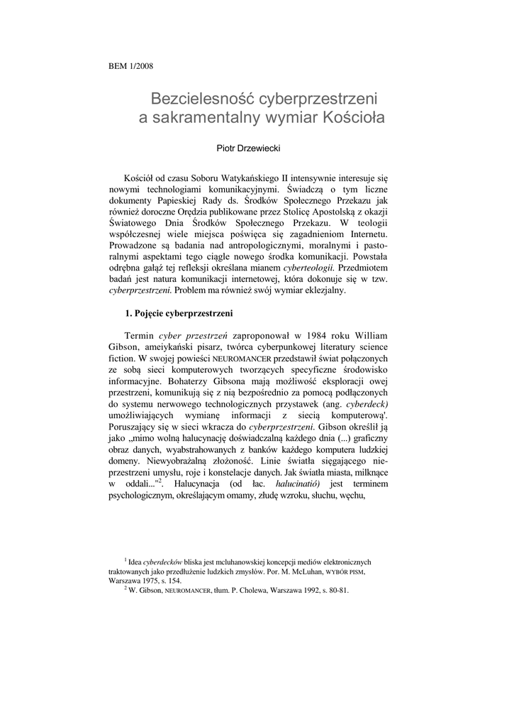 BEM 1/2008 Bezcielesność cyberprzestrzeni a sakramentalny wymiar Kościoła Piotr Drzewiecki Ko ciół od czasu Soboru Watykańskiego II intensywnie interesuje się nowymi technologiami komunikacyjnymi. wiadczą o tym liczne dokumenty Papieskiej Rady ds. rodków Społecznego Przekazu jak również doroczne Orędzia publikowane przez Stolicę Apostolską z okazji wiatowego Dnia rodków Społecznego Przekazu. W teologii współczesnej wiele miejsca po więca się zagadnieniom Internetu. Prowadzone są badania nad antropologicznymi, moralnymi i pastoralnymi aspektami tego ciągle nowego rodka komunikacji. Powstała odrębna gałąź tej refleksji okre lana mianem cyberteologii. Przedmiotem badań jest natura komunikacji internetowej, która dokonuje się w tzw. cyberprzestrzeni. Problem ma również swój wymiar eklezjalny. 1. Pojęcie cyberprzestrzeni Termin cyber przestrzeń zaproponował w 1984 roku William Gibson, ameiykański pisarz, twórca cyberpunkowej literatury science fiction. W swojej powie ci NEUROMANCER przedstawił wiat połączonych ze sobą sieci komputerowych tworzących specyficzne rodowisko informacyjne. Bohaterzy Gibsona mają możliwo ć eksploracji owej przestrzeni, komunikują się z nią bezpo rednio za pomocą podłączonych do systemu nerwowego technologicznych przystawek (ang. cyberdeck) umożliwiających wymianę informacji z siecią komputerową'. Poruszający się w sieci wkracza do cyberprzestrzeni. Gibson okre lił ją jako „mimo wolną halucynację do wiadczalną każdego dnia (...) graficzny obraz danych, wyabstrahowanych z banków każdego komputera ludzkiej domeny. Niewyobrażalną złożono ć. Linie wiatła sięgającego nieprzestrzeni umysłu, roje i konstelacje danych. Jak wiatła miasta, milknące w oddali..."2. Halucynacja (od łac. halucinatió) jest terminem psychologicznym, okre lającym omamy, złudę wzroku, słuchu, węchu, 1 Idea cyberdecków bliska jest mcluhanowskiej koncepcji mediów elektronicznych traktowanych jako przedłużenie ludzkich zmysłów. Por. M. McLuhan, WYBÓR PISM, Warszawa 1975, s. 154. 2 W. Gibson, NEUROMANCER, tłum. P. Cholewa, Warszawa 1992, s. 80-81. Bezcielesność cyberprzestrzeni a sakramentalny wymiar Kościoła 99 złudne spostrzeganie czego nieistniejące, przywidzenie3. To literackie okre lenie Gibsona ukazuje jeden z problemów współczesnej kultury polegający na zacieraniu się różnicy pomiędzy rzeczywisto cią a jej wirtualną, cyberprzestrzenną iluzją. Cyberprzestrzeń (ang. cyberspace), którą twórca cyberpunku okre la jako halucynację, jest bowiem łudząco podobna do realno ci fizycznej. U jej użytkowników - podobnie jak ma to miejsce w przypadku bohaterów Neuromancera - może w konsekwencji powstać pytanie: czym jest rzeczywisto ć? Co jest, istnieje naprawdę? Czy przestrzeń fizyczna czy też ta wykreowana za pomocą nowoczesnych technologii? Zjawisko cyberprzestrzeni bywa traktowane jako przejaw odwiecznego pragnienia zajmowania się fikcją i formę ucieczki od wiata4. Inne okre lenie cyberprzestrzeni to rzeczywistość wirtualna^. Marie Laurę Ryan podciąga termin cyberprzestrzeń pod wirtualną rzeczywisto ć i jest to dla niej immersyjne6 i interaktywne do wiadczenie wiata wygenerowanego przez komputer. Umieszcza ona użytkownika wewnątrz samych danych, w trójwymiarowej przestrzeni zaprojektowanej przez cyfrowo zakodowaną informację 7. Gibson nazywa także cyberprzestrzeń matrycą (ang. matrix). Case - bohater Neuromancera - „działał na nieustannym, niemal adrenalinowym haju, produkcie ubocznym młodo ci i sprawno ci, podłączony do robionego na zamówienie cyber-przestrzennego deku, który rzutował bezcielesną wiadomo ć na wszechzmysłową halucynację matrycy"8. Matrix to także tytuł inspirowanego cyberpunkiem filmu w reżyserii braci Wachowskich, w którym podejmuj ą próbę odpowiedzi na pytanie: co istnieje naprawdę, a co jest iluzją, symulacją rzeczywisto ci9? Współcze nie termin cyberprzestrzeń używany jest jako synonim przestrzeni informacyjnej, a przede wszystkim służy cało ciowemu okre leniu Internetu. Pojęcie funkcjonuje w tym znaczeniu od 1994 roku, w którym Internet dzięki ekspansji World Wide Web (www) i poczty elektronicznej (e-mail) zaistniał w wiadomo ci społecznej. To uproszczone, ale popularne pojmowanie 3 Por. Halucynacja, w: Z. Rysiewicz (red.), Słownik wyrazów obcych, Warszawa 1961, s. 262. 4 Por. Cyberprzestrzeń - hipertekst, http://www.techsty.art.pl/hipertekst/cyberprzestrzen.htm 3-1-2005. 5 Termin la realite virtuelle zaproponował w 1938 r. Antonin Artaud, franc. dramaturg i aktor filmowy w pracy zatytułowanej Teatr i jego sobowtór. Cyt. za: E. Davis, TechGnoza. Mit, magia + mistycyzm w wieku informacji, tłum. J. Kierul, Poznań 2002, s. 243. 6 Przez imersyjne do wiadczenie należy rozumieć takie, które poprawia i udoskanala nasze zdolno ci poznawcze. Imersyjny tzn. dotyczący imersji. Imersja (od łac. zanurzenie): w astronomii wej cie jednego ciała niebieskiego w cień drugiego, w fizyce: wprowadzenie cieczy między obiektyw mikroskopu i przedmiot oglądany dla powiększenia zdolno ci rozpoznawczej. Por. Imersja.w: Z. Rysiewicz (red.), SŁOWNIK..., dz. cyt., s. 287. 7 Por. Cyberprzestrzeń, http://www.techsty.art.pl/hipertekst/cyberprzestrzen/cybe_696.htm 3-12005. 8 W. Gibson, Neuromancer, dz. cyt., s. 12. 9 A. i L. Wachowscy (reż), Matrix, USA 1999. 100 Piotr Drzewiecki Bezcielesność cyberprzestrzeni… cyberprzestrzeni. Wkraczamy do niej za każdym razem, kiedy podłączamy się do sieci komputerowej choćby celem wysłania czy odebrania poczty10. W dobie technologii elektronicznej wszystko, co kryje się za interaktywnym ekranem komputera, jest cyberprzestrzenią". Obejmuje ona nie tylko Internet, choć ten przynależy do niej w sposób szczególny, ale także wcze niejsze media elektroniczne: telefon, telewizję, radio - telekomunikacyjne systemy, komunikację elektroniczną, sieci wykorzystujące fale