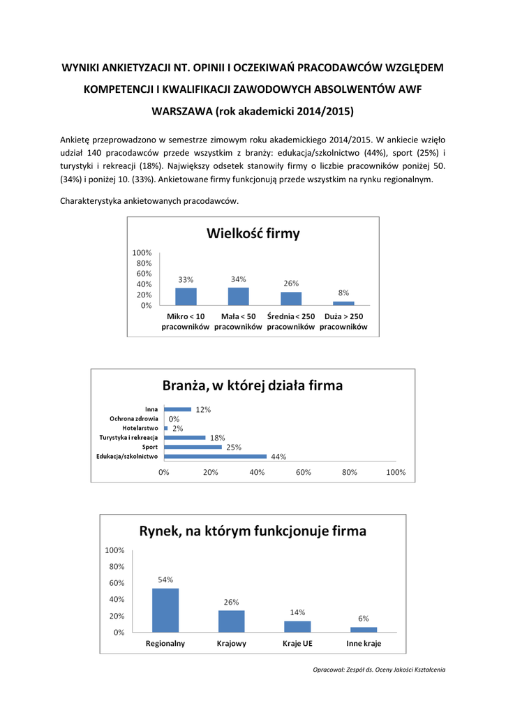 WYNIKI ANKIETYZACJI NT. OPINII I OCZEKIWAŃ PRACODAWCÓW WZGLĘDEM KOMPETENCJI I KWALIFIKACJI ZAWODOWYCH ABSOLWENTÓW AWF WARSZAWA (rok akademicki 2014/2015) Ankietę przeprowadzono w semestrze zimowym roku akademickiego 2014/2015. W ankiecie wzięło udział 140 pracodawców przede wszystkim z branży: edukacja/szkolnictwo (44%), sport (25%) i turystyki i rekreacji (18%). Największy odsetek stanowiły firmy o liczbie pracowników poniżej 50. (34%) i poniżej 10. (33%). Ankietowane firmy funkcjonują przede wszystkim na rynku regionalnym. Charakterystyka ankietowanych pracodawców. Opracował: Zespół ds. Oceny Jakości Kształcenia W tabeli poniżej podano stanowiska w firmach, na które jest obecnie największe zapotrzebowanie w zależności od branży (zachowano oryginalne odpowiedzi pracodawców). Branża, w której działa firma: Turystyka i rekreacja Sport Stanowiska w firmach na które jest obecnie największe zapotrzebowanie: Instruktor pływania. Konsultant ds. sprzedaży usług fitness, trener personalny, recepcjonista. ORT Instruktorzy różnych dyscyplin sportowych. Rekreacja, prowadzenie zajęć gier sportowych Instruktorów pływania, fitness, siłowni. Instruktorzy ogólnosportowi i wychowawcy, instruktorzy sportowi (specjalizacje). Wszystkie sporty, gry i zabawy. Animatorzy czasu wolnego. Instruktorzy rekreacji, piloci. Obsługa klienta zagranicznego. Oferent, kasjer lotniczy. Osób chętnych do nauki i pracy . Specjaliści ds. turystyki. Językowych, informatyków. Specjalista ds. Produktu. Specjalista ds. Turystyki przyjazdowej. Specjalista ds. Turystyki, konsultant anglojęzyczny. Animator czasu wolnego; instruktor fitness, zumby, yogi, pilatesu, tańca. Trenerów tenisa. Specjalista ds. Sprzedaży i promocji artykułów pływackich. Trenerzy, instruktorzy pływania. Instruktor gimnastyki korekcyjnej. Instruktor Rekreacji ruchowej - specjalistyka kulturystyka lub fitness. Trenerów: piłki nożnej, tenisa ziemnego, piłki siatkowej, cheerleaders. Instruktor sportu i rekreacji ruchowej. Trenerzy. Absolwentów AWF z uprawnieniami trenerskimi. Instruktor gimnastyki sportowej. Instruktor piłki nożnej, trener uefa b. Dział szkolenia, marketing. Trener personalny. Gimnastyka korekcyjna. Rehabilitacja. Trenerów tenisa, kosmetologów. Pedagogów i wszechstronnych instruktorów. Trenerów fitness z licencjatem z fizjoterapii. Trener tenisa, menedżer klubu tenisowego. Instruktorzy, trenerzy tenisa ziemnego, piłki nożnej, zumba kids. Instruktor: pływania, aqua aerobiku, fitness. Absolwent AWF, menager - zarządzanie w kulturze fiz.. Odpowiedzialny pracownik . Trener, fizjoterapeuta. Trener do zajęć z bardzo małymi dziećmi (2-5 lat) oraz do zajęć z rodzicami. Opracował: Zespół ds. Oceny Jakości Kształcenia Trener II klasy. Instruktor sportu. Instruktorzy fitness, gimnastyki korekcyjnej i tańca. Ochrona zdrowia Pielęgniarki. (szpitale, ośrodki Rehabilitanci, terapeuci. rehabilitacji, ośrodki Ndt bobath. odnowy biologicznej) Opiekunów kolonijnych. Rehabilitanci. Magister fizjoterapii. Lekarze. Pielęgniarki/Pielęgniarze. Fizjoterapeuci. Hotelarstwo Hotelarstwo. Specjalista do spraw gastronomii, hotelarstwa i obsługi klienta. Edukacja/szkolnictwo Nauczyciele wychowania fizycznego. Poloniści. Matematyk. Językowcy. Doświadczenie w branży gastronomicznej; wysoki poziom języka angielskiego. Nauczyciele przedmiotów zawodowych. Ratownik wodny. Nauczyciel języka angielskiego. Trenerów, instruktorów. Nauczycieli. Nauczycieli posiadających kwalifikacje do nauczania kilku przedmiotów. Informatyka. Organizator imprez. Nauczyciel wychowania fizycznego z uprawnieniami trenera. Którzy potrafią radzić sobie z uczniami i pracują w trudnych warunkach lokalowych. Trenerów dyscyplin sportowych. Matematyk. Psycholog. Nauczycieli matematyki , angielskiego. Trener piłki siatkowej. Nauczycieli przedmiotów. Nauczyciel fizyki. Pełna obsada. Anglistów. Nauczyciel wf i korektywa, zajęcia z kl.1-3. Matematyk. Nauczyciele uczący przedmiotu w języku angielskim. Językowców. Nauczyciel wf. Nauczyciel z uprawnieniami trenerskimi. Programistów. Studenci hotelarstwa, turystyki . Edukacja. Nauczyciel matematyki i muzyki. Opracował: Zespół ds. Oceny Jakości Kształcenia Inna Nauczyciele przedmiotów przyrodniczych. Recepcjonista/kelner. Animatorzy, instruktorzy dla dzieci w wieku 2-12 lat. Technik ortopeda, student/absolwent fizjoterapii. Specjalista ds. Sprzedaży. Kasjer Lotniczy, Specjalista ds. Rezerwacji Hotelowych. Sprzedawca, Kierownik działu, Produkt Menedżer. Fizjoterapeuci. Inżynier, handlowiec. Różne. Dziennikarzy. Analityk, mechanik. Inżynierowie produkcji, logistycy. W zakresie ubezpieczeń, prawa, zdrowia publicznego. IT. Na 128 ankietowanych pracodawców 81 (78%) deklaruje, że zatrudniają lub zatrudniali absolwentów AWF. Największy odsetek zatrudnianych absolwentów ukończyło kierunek wychowanie fizyczne (79%). Największy odsetek zatrudnianych absolwentów zajmuje/zajmowało stanowiska specjalistyczne (53%). Wśród opcji „inne” pracodawcy podali stanowisko nauczyciela wychowania fizycznego, instruktora, opiekuna kolonijnego w przypadku absolwentów kierunku wychowanie fizyczne oraz sprzedawcę w sklepie ze sprzętem rehabilitacyjnym w przypadku absolwentów kierunku fizjoterapia. Opracował: Zespół ds. Oceny Jakości Kształcenia Ogólny poziom przygotowania absolwentów AWF Warszawa do pracy zawodowej pracodawcy oceniają dość wysoko, bo na ocenę dobrą. Frakcje ocen pracodawców łącznie bardzo bardzo źle przeciętnie dobrze źle dobrze Ocena ogólnego poziomu przygotowania absolwentów AWF Warszawa do pracy zawodowej. 2% 6% 21% 39% 32% średnia ocena 3,9 Poniżej w tabeli podano powody niezatrudniania absolwentów AWF przez pracodawców (zachowano oryginalne odpowiedzi pracodawców). Powody niezatrudnienia absolwentów AWF przez ankietowanych pracodawców: Nie zgłosił się odpowiedni kandydat. Brak kandydatów. Nie mi