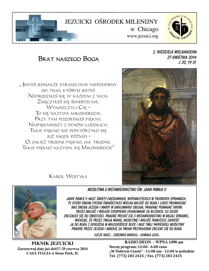 JEZUICKI OŚRODEK MILENIJNY w Chicago www.jezuici.org 2. Niedziela Wielkanocna 27 kwietnia 2014 J 20, 19-31 Brat naszego Boga ,, Jesteś jednakże straszliwie niepodobny do tego, którym jesteś Natrudziłeś się w każdym z nich. Zmęczyłeś się śmiertelnie. Wyniszczyli Cię To się nazywa miłosierdzie. Przy tym pozostałeś piękny. Najpiękniejszy z synów ludzkich. Takie piękno nie powtórzyło się już nigdy później O, jakież trudne piękno, jak trudne. Takie piękno nazywa się Miłosierdzie” Karol Wojtyła MODLITWA O WSTAWIENNICTWO ŚW. JANA PAWŁA II Janie Pawle II nasz święty orędowniku, Wspomożycielu w trudnych sprawach . Ty, który swoim życiem świadczyłeś wielką miłość do Boga i ludzi Prowadząc nas drogą Jezusa i Maryi w umiłowaniu obojga, pragnąc pomagać innym. Przez miłość i wielkie cierpienie ofiarowane za bliźnich, co dzień zbliżałeś się do świętości. Pragnę prosić Cię o wstawiennictwo w mojej sprawie... Wierząc, że przez Twoją wiarę, modlitwę i miłość pomożesz zanieść Ją do Boga Z ufnością w miłosierdzie Boże i moc Twej papieskiej modlitwy. Pragnę przez Jezusa i MaryjĘ Za Twoim przykładem zbliżać się do boga. Ojcze nasz... Zdrowaś Maryjo... Chwała ojcu... PIKNIK JEZUICKI Zarezerwuj datę już dziś!!! 29 czerwca 2014 CASA ITALIA w Stone Park, IL RADIO DEON - WPNA 1490 am Nocny program: 12:00 - 6:00 rano ,,W Dobrym Czasie” - 11:00 am - 12:00 w południe Tel. (773) 283 2425 / Fax. (773) 283 2435 PORZĄDEK MSZY ŚWIĘTYCH Poniedziałek - pi¹tek: 8:00, 18:00, 19:00 (radiowa: WCEV 1450) I piątek miesiąca: 8:00, 19:00, 20:30 Środa: 19:00 - nowenna do Matki Bożej Nieustającej Pomocy Sobota: 8:00 i 19:00 , tylko w I sobotę miesiąca o 17:00 dla chorych, Niedziela: 8:00 (radiowa), 9:30, 11:00, 13:00, 19:00, 20:30 -=- SpowiedŸ św.: od poniedziałku do soboty - 7:30 i 18:30, w niedzielę - pó³ godziny przed ka¿d¹ Msz¹ Œwiêt¹, w1. pi¹tek miesi¹ca - od 18:30 do 21:00 Adoracja Najświętszego Sakramentu - od poniedziałku do czwartku - od 18:30 do 19:00 sobota - od 18:00 do 19:00 Sanktuarium Najświętszego Serca Pana Jezusa Jezuicki Ośrodek Milenijny 5835 W. Irving Park Rd.; Chicago, IL 60634, Tel. 773 777 7000; fax 773 427 0126 www.jezuici.org e-mail: [email protected] Audycje Radia DEON: tel. 773 283 2425 Fax. 773 283 2435 www. radiodeon.com e-mail: [email protected] Biuro czynne: od poniedziałku do piątku: 8:30 - 9:00, 15:30 - 20:30 sobota: 9:30 - 20:30, niedziela: 8:30 - 14:30, 18:30 - 21:30 Biblioteka czynna: sobota: 18:00 - 19:00; niedziela: 10:30 - 14:30; 19:00 - 21:00 Kawiarenka czynna: niedz.: 10:00 - 15:00, 19:00 - 22:00 Sacred Heart Mission House 4105 N. Avers Ave., Chicago, IL 60618 Tel. 773 588 74 76; fax 773 588 65 17 Rektor Sanktuarium i Przełożony Jezuitów o. Jerzy Sermak, SJ (773-588-7476 - ext. 224) o. Józef Birecki, SJ (773-777-7000 - ext. 121) o. Jerzy Mordarski, SJ (773-588-7476 - ext. 234) o. Jerzy Karpiński, SJ (773-588-7476 - ext. 237) o. Piotr Kochanowicz, SJ (773-588-7476 - ext. 227) br. Adam Poręba, SJ (773-777-7000 - ext. 122) Wszelkie ofiary i donacje prosimy kierowaæ na adres Sanktuarium. Donacje s¹ wolne od podatku i mo¿na je odpisywaæ przy rozliczeniu z IRS. TRANSMISJE RADIOWE I INTERNETOWE od poniedziałku do piątku,transmisja Mszy Św. z godz. 19:00 Radio WCEV 1450 (www.wcev1450.com) w niedziele: godz 8-9, Radio WCEV 1450, oraz Polskie Radio Chicago 1030 WNVR (www.polskieradio.com) Codziennie przez całą dobę: Kamera internetowa z Sanktuarium (obraz i dźwięk; używać Internet Explorer): www.jezuici.org - link „Transmisje na żywo” – wpisać jako użytkownik i hasło: 5835 INTENCJE MSZY ŚWIĘTYCH Niedziela Miłosierdzia Bożego, 27 IV 2014 8:00 + + Kazimierz i Teresa Musielak, + + Barbara, Kazimierz i Krzysztof Grajnert; o błogosławieństwo św. Jana Pawła II dla dzieci Diany, Pawła, Cathy i wnuka Kazika 9:30 Zbiorowa 11:00 dziękczynna za otrzymane łaski z prośbą o dalszą opiekę i Boże błogosławieństwo dla Adama i Filomeny w 45. rocznicę ślubu oraz Grzegorza i Magdaleny w 10. rocznicę ślubu 13:00 + + Melania i Stefan Nęcki 19:00 Zbiorowa 20:30 + Barbara Kmieć Poniedziałek, 28 IV 8:00 + + Andrzej, Waleria, Aniela i Franciszka Długopolscy oraz dusze w czyścu cierpiące 18:00 o zdrowie i Boże błogosławieństwo dla Amy Ziółkowskiej z rodziną z okazji urodzin 19:00 Zbiorowa Wtorek, 29 IV 8:00 + + Wincenty, Anna, Józef i Aniela Dzielscy 18:00 + Stanisław Porowski 19:00 Zbiorowa Środa, 30 IV 8:00 za Dobroczyńców Jezuickiego Ośrodka Milenijnego 18:00 o zdrowie i Boże błogosławieństwo dla syna Janka w dniu urodzin 19:00 Zbiorowa I Czwartek, 1 V 8:00 o zdrowie i błogosławieństwo Boże dla Władysława i Anny Królów z rodziną 18:00 + Adela Tokarska 19:00 Zbiorowa I Piątek, 2 V 8:00 o opiekę i błogosławieństwo Boże dla syna Mateusza 19:00 Wynagradzająca Najświętszemu Sercu Pana Jezusa i za Czytelników Posłańca 20:30 Zbiorowa I Sobota, 3 V 8:00 + Zygmunt Wilk w dniu imienin, + + Genowefa i Mieczysław Wilk 17:00 Msza Św. w intencji chorych 19:00 Zbiorowa Różaniec Rodzinny - przez tydzień w każdej rodzinie Zgłoszenia przyjmują: Teresa tel. 773 308 4998 lub Małgorzata tel. 773 38733 32 Fundacja „Strong Family Silna Rodzina” na tabletach i w telefonach komórkowych przez Aplikację: TuneIn wpisać: Radio Siedem www.RadioSiedeM.net www.strongfamily.co Słuchaj! RadioDeon.com - WPNA 1490 AM - pon.-pt. 12:00 - 6:00 i 11:00 - 12:00 - tel. (773) 283 2425 OG£OSZENIA Niedziela, 27 IV Jeżeli chcesz lepiej poznać Katechizm Kościoła Katolickiego - 15:00 - specjalne Nabożeństwo ku czci Miłosierdzia Bożego serdecznie zapraszamy I Czwartek, 1 V na spotkania we - 20:00 - Godzina Święta czwartki o godz. 20:00 I Piątek, 2 V prowadzi o. Jerzy Sermak SJ - 18:30 - Spowiedź Święta I CZWARTEK MIESIĄCA - 19:00 - Msza Święta Godzina Święta 8:00 pm - 9:00 pm - 20:30 - Msza Święta a po nie