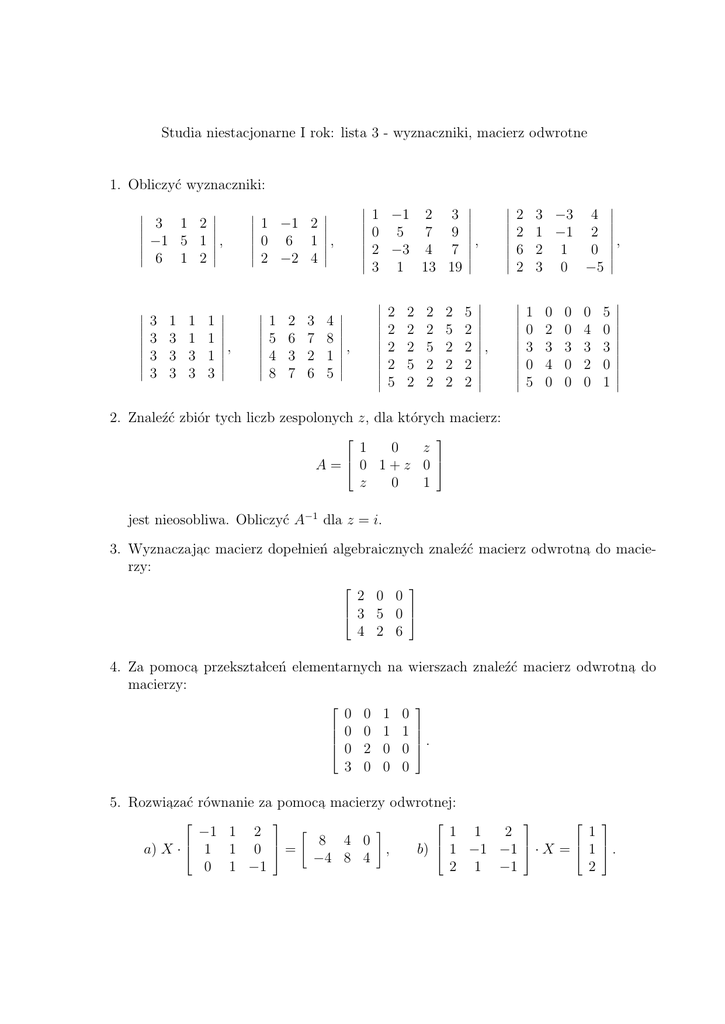 Studia niestacjonarne I rok: lista 3 - wyznaczniki, macierz odwrotne 1. Obliczyć wyznaczniki: 3 1 2 −1 5 1 6 1 2 3 3 3 3 1 3 3 3 1 1 3 3 , 1 1 1 3 , 1 −1 2 0 6 1 2 −2 4 1 5 4 8 2 6 3 7 3 7 2 6 , 4 8 1 5 1 −1 2 3 0 5 7 9 2 −3 4 7 3 1 13 19 , 2 2 2 2 5 2 2 2 5 2 2 2 5 2 2 2 5 2 2 2 , 5 2 2 2 2 , 3 −3 4 1 −1 2 2 1 0 3 0 −5 2 2 6 2 1 0 3 0 5 0 2 3 4 0 0 0 3 0 0 0 4 3 2 0 , 5 0 3 0 1 2. Znaleźć zbiór tych liczb zespolonych z, dla których macierz: 1 0 z A= 0 1+z 0 z 0 1 jest nieosobliwa. Obliczyć A−1 dla z = i. 3. Wyznaczajac , macierz dopelnień algebraicznych znaleźć macierz odwrotna, do macierzy: 2 0 0 3 5 0 4 2 6 4. Za pomoca, przeksztalceń elementarnych na wierszach znaleźć macierz odwrotna, do macierzy: 0 0 0 3 0 0 2 0 1 1 0 0 0 1 0 0 . 5. Rozwiazać równanie za pomoca, macierzy odwrotnej: , # " −1 1 2 8 4 0 a) X · 1 1 0 = , −4 8 4 0 1 −1 1 1 2 1 b) 1 −1 −1 · X = 1 . 2 1 −1 2