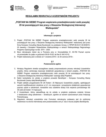 REGULAMIN REKRUTACJI UCZESTNIKÓW PROJEKTU „POSTAW NA SIEBIE! Program wspierania przedsiębiorczości osób powyżej 29 lat pozostających bez pracy z Obszarów Strategicznej Interwencji Wielkopolski” §1 Informacje o projekcie 1) Projekt „POSTAW NA SIEBIE! Program wspierania przedsiębiorczości osób powyżej 29 lat pozostających bez pracy z Obszarów Strategicznej Interwencji Wielkopolski” realizowany jest przez firmę Kompass Consulting Maciej Buczkowski na podstawie Umowy nr RPWP.06.03.01-30-0039/1500 zawartej z Zarządem Województwa Wielkopolskiego w ramach Wielkopolskiego Regionalnego Programu Operacyjnego na lata 2014 – 2020. 2) Biuro rekrutacyjne mieści się w Poznaniu przy ul. Grunwaldzkiej 21, 60-783 Poznań czynne od poniedziałku do piątku w godzinach 08.00-16.00, tel./fax 61 843 43 43. 3) Projekt realizowany jest w okresie od 1 września 2016 r. do 30 czerwca 2018 r. §2 Postanowienia ogólne 1) Niniejszy Regulamin określa szczegółowe zasady przeprowadzania procesu rekrutacji Uczestników projektu, którzy zamierzają rozpocząć działalność gospodarczą w ramach projektu, „POSTAW NA SIEBIE! Program wspierania przedsiębiorczości osób powyżej 29 lat pozostających bez pracy z Obszarów Strategicznej Interwencji Wielkopolski” zwanego dalej Projektem. 2) Nabór kandydatów do udziału w projekcie prowadzi Beneficjent – Kompass Consulting Maciej Buczkowski (zwany dalej Beneficjentem). 3) Projekt zakłada przygotowanie 60 (35 Kobiet i 25 Mężczyzn) Uczestników projektu, spełniających warunki kwalifikowalności określone w § 3, do rozpoczęcia i prowadzenia działalności gospodarczej poprzez udział w szkoleniach, doradztwie oraz udzielenie dotacji i/lub wsparcia pomostowego dla 36 osób (22 kobiet i 14 mężczyzn). 4) Z Uczestnikami, którzy zakwalifikują się do udziału w projekcie podpisana zostanie Umowa o świadczenie usług szkoleniowo – doradczych, zgodnie ze wzorem opracowanym przez Instytucję Pośredniczącą. 5) Regulamin rekrutacji uczestników oraz Formularz rekrutacyjny podawany jest do publicznej wiadomości na stronie internetowej www.postawnasiebie.com.pl oraz w biurze projektu Beneficjenta. §3 Warunki kwalifikowalności 1) Do udziału w projekcie zakwalifikowane mogą zostać osoby bezrobotne1 lub bierne zawodowo2 powyżej 29 roku życia3 zamierzające rozpocząć prowadzenie działalności gospodarczej na terenie województwa wielkopolskiego, które jednocześnie należą do jednej z następujących grup: osoby długotrwale bezrobotne4, osoby w wieku 50 lat i więcej, kobiety, osoby z niepełnosprawnościami5, osoby o niskich kwalifikacjach6. 2) Projekt skierowany jest do osób z obszaru województwa wielkopolskiego (w przypadku osób fizycznych uczą się, zamieszkują w rozumieniu przepisów Kodeksu Cywilnego) z następujących gmin: Chodzież Chodzież – gmina wiejska Trzcianka Krzyż Wielkopolski Osoby bezrobotne - osoby pozostające bez pracy, gotowe do podjęcia pracy i aktywnie poszukujące zatrudnienia. Definicja uwzględnia osoby zarejestrowane jako bezrobotne zgodnie z krajowymi przepisami, nawet jeżeli nie spełniają one wszystkich trzech kryteriów. Osobami bezrobotnymi są zarówno osoby bezrobotne w rozumieniu badania aktywności ekonomicznej ludności, jak i osoby zarejestrowane jako bezrobotne. Definicja nie uwzględnia studentów studiów stacjonarnych, nawet jeśli spełniają powyższe kryteria. Osoby kwalifikujące się do urlopu macierzyńskiego lub rodzicielskiego, które są bezrobotne w rozumieniu niniejszej definicji (nie pobierają świadczeń z tytułu urlopu), są również osobami bezrobotnymi w rozumieniu Wytycznych 2 Osoby bierne zawodowo - osoby, które w danej chwili nie tworzą zasobów siły roboczej (tzn. nie pracują i nie są bezrobotne). Studenci studiów stacjonarnych są uznawani za osoby bierne zawodowo. Osoby będące na urlopie wychowawczym (rozumianym jako nieobecność w pracy, spowodowana opieką nad dzieckiem w okresie, który nie mieści się w ramach urlopu macierzyńskiego lub urlopu rodzicielskiego), są uznawane za bierne zawodowo, chyba że są zarejestrowane już jako bezrobotne (wówczas status bezrobotnego ma pierwszeństwo). Osoby prowadzące działalność na własny rachunek (w tym członek rodziny bezpłatnie pomagający osobie prowadzącej działalność) nie są uznawane za bierne zawodowo. 3 Wiek Uczestnika projektu jest określany na podstawie daty urodzenia i ustalany w dniu rozpoczęcia udziału w projekcie – tj. od dnia 30 urodzin. 4 Osoby długotrwale bezrobotne - definicja pojęcia „długotrwale bezrobotny" różni się w zależności od wieku: • młodzież (<25 lat) - osoby bezrobotne nieprzerwanie przez okres ponad 6 miesięcy (>6 miesięcy), • dorośli (25 lat lub więcej) - osoby bezrobotne nieprzerwanie przez okres ponad 12 miesięcy (>12 miesięcy). Wiek Uczestników projektu jest określany na podstawie daty urodzenia i ustalany w dniu rozpoczęcia udziału w projekcie 5 Osoby z niepełnosprawnościami - osoby niepełnosprawne w rozumieniu ustawy z dnia 27 sierpnia1997 r. o rehabilitacji zawodowej i społecznej oraz zatrudnianiu osób niepełnosprawnych (Dz. U. z 2011 r.Nr 127, poz. 721, z późn. zm.), a także osoby z zaburzeniami psychicznymi w rozumieniu ustawy z dnia19 sierpnia 1994 r. o ochronie zdrowia psychicznego (Dz. U. z 2011 r. Nr 231, poz. 1375 z późn. zm.) 6 Osoby o niskich kwalifikacjach - osoby posiadające wykształcenie na poziomie: szkoły podstawowej, gimnazjum, liceum ogólnokształcącego, liceum profilowanego, uzupełniającego liceum ogólnokształcącego, technikum, uzupełniającego technikum, zasadnicza szkoła zawodowa (do ISCED 3 włącznie), zgodnie z Międzynarodową Klasyfikacją Standardów Edukacyjnych ISCED 2011 (UNESCO). 1 2 Wieleń Ujście Konin Golina Koło Koło – gmina wiejska Turek Turek- gmina wiejska Miłosław Pyzdry Mieścisko – gmina wiejska Skoki Kiszkowo – gmina wiejska 3) W pr