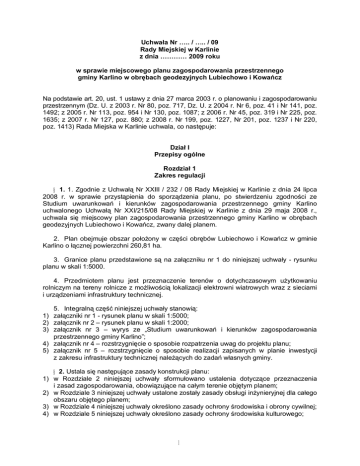 Uchwała Nr ….. / ….. / 09 Rady Miejskiej w Karlinie z dnia ………… 2009 roku w sprawie miejscowego planu zagospodarowania przestrzennego gminy Karlino w obrębach geodezyjnych Lubiechowo i Kowańcz Na podstawie art. 20, ust. 1 ustawy z dnia 27 marca 2003 r. o planowaniu i zagospodarowaniu przestrzennym (Dz. U. z 2003 r. Nr 80, poz. 717, Dz. U. z 2004 r. Nr 6, poz. 41 i Nr 141, poz. 1492; z 2005 r. Nr 113, poz. 954 i Nr 130, poz. 1087; z 2006 r. Nr 45, poz. 319 i Nr 225, poz. 1635; z 2007 r. Nr 127, poz. 880; z 2008 r. Nr 199, poz. 1227, Nr 201, poz. 1237 i Nr 220, poz. 1413) Rada Miejska w Karlinie uchwala, co następuje: Dział I Przepisy ogólne Rozdział 1 Zakres regulacji § 1. 1. Zgodnie z Uchwałą Nr XXIII / 232 / 08 Rady Miejskiej w Karlinie z dnia 24 lipca 2008 r. w sprawie przystąpienia do sporządzenia planu, po stwierdzeniu zgodności ze Studium uwarunkowań i kierunków zagospodarowania przestrzennego gminy Karlino uchwalonego Uchwałą Nr XXI/215/08 Rady Miejskiej w Karlinie z dnia 29 maja 2008 r., uchwala się miejscowy plan zagospodarowania przestrzennego gminy Karlino w obrębach geodezyjnych Lubiechowo i Kowańcz, zwany dalej planem. 2. Plan obejmuje obszar położony w części obrębów Lubiechowo i Kowańcz w gminie Karlino o łącznej powierzchni 260,81 ha. 3. Granice planu przedstawione są na załączniku nr 1 do niniejszej uchwały - rysunku planu w skali 1:5000. 4. Przedmiotem planu jest przeznaczenie terenów o dotychczasowym użytkowaniu rolniczym na tereny rolnicze z możliwością lokalizacji elektrowni wiatrowych wraz z sieciami i urządzeniami infrastruktury technicznej. 5. Integralną część niniejszej uchwały stanowią: 1) załączniki nr 1 - rysunek planu w skali 1:5000; 2) załącznik nr 2 – rysunek planu w skali 1:2000; 3) załącznik nr 3 – wyrys ze „Studium uwarunkowań i kierunków zagospodarowania przestrzennego gminy Karlino”; 4) załącznik nr 4 – rozstrzygnięcie o sposobie rozpatrzenia uwag do projektu planu; 5) załącznik nr 5 – rozstrzygnięcie o sposobie realizacji zapisanych w planie inwestycji z zakresu infrastruktury technicznej należących do zadań własnych gminy. 1) 2) 3) 4) § 2. Ustala się następujące zasady konstrukcji planu: w Rozdziale 2 niniejszej uchwały sformułowano ustalenia dotyczące przeznaczenia i zasad zagospodarowania, obowiązujące na całym terenie objętym planem; w Rozdziale 3 niniejszej uchwały ustalone zostały zasady obsługi inżynieryjnej dla całego obszaru objętego planem; w Rozdziale 4 niniejszej uchwały określono zasady ochrony środowiska i obrony cywilnej; w Rozdziale 5 niniejszej uchwały określono zasady ochrony środowiska kulturowego; 1 5) obszar objęty planem podzielony został na tereny funkcjonalne - tereny określone liniami rozgraniczającymi, o różnym przeznaczeniu i o rożnych zasadach zagospodarowania; 6) każdy teren funkcjonalny oznaczono na rysunku planu w skali 1:5000 i 1:2000 oraz w tekście planu identyfikatorem cyfrowo – literowym lub literowym; liczba oznacza kolejny numer terenu, symbol literowy oznacza główną funkcję terenu lub klasyfikację funkcjonalną drogi; 7) dla poszczególnych terenów funkcjonalnych sformułowano w Dziale II przepisy szczegółowe obowiązujące w granicach wyznaczonych linią rozgraniczającą danego terenu. Rozdział 2 Przeznaczenie i zasady zagospodarowania terenu § 3. 1. Ustalenia planu zawarte w tekście uchwały obejmują: 1) R – tereny upraw polowych z zakazem lokalizacji zabudowy; 2) ZL – tereny leśne; 3) EW/R - tereny lokalizacji elektrowni wiatrowych, infrastruktury towarzyszącej i upraw polowych; 4) KDW – tereny dróg wewnętrznych. 2. Na obszarze planu, ustala się: 1) przeznaczenie terenów oraz linie rozgraniczające tereny o różnym przeznaczeniu lub różnych zasadach zagospodarowania, a także szczególne warunki zagospodarowania terenów oraz ograniczenia w ich użytkowaniu, w tym zakaz zabudowy; 2) zasady ochrony i kształtowania ładu przestrzennego oraz parametry i wskaźniki kształtowania zabudowy oraz zagospodarowania terenu, w tym linie zabudowy, gabaryty obiektów; 3) zasady ochrony środowiska, przyrody, krajobrazu kulturowego, dziedzictwa kulturowego i zabytków; 4) zasady i warunki scalania i podziału nieruchomości; 5) zasady modernizacji, rozbudowy i budowy systemów komunikacji i infrastruktury technicznej; 6) sposób i termin tymczasowego zagospodarowania, urządzania i użytkowania terenów; 7) stawki procentowe, na podstawie których ustala się jednorazową opłatę od wzrostu wartości nieruchomości. 3. Przebieg linii rozgraniczających dla celów opracowań geodezyjnych należy określać poprzez odczyt osi odpowiednich linii z rysunku planu. Rozdział 3 Ustalenia z zakresu obsługi inżynieryjnej i komunikacyjnej § 4. 1. W zakresie obsługi inżynieryjnej ustala się: 1) elektrownie będą pracowały bezobsługowo, w związku z tym nie zachodzi potrzeba uzbrojenia terenu w sieci wodociągowe i kanalizacyjne; 2) elektrownie połączyć liniami elektroenergetycznymi ze stacją elektroenergetyczną – GPZ zlokalizowaną poza granicą opracowania planu; dopuszcza się w granicach opracowania, ułożenie linii teletechnicznych oraz lokalizację innych obiektów i urządzeń infrastruktury towarzyszącej; 3) istniejący gazociąg przesyłowy wysokiego ciśnienia DN 150, relacji Ciechnowo – Karlino do zachowania; zagospodarowanie terenu wzdłuż gazociągu zgodnie z przepisami, na podstawie których gazociąg został zaprojektowany i wybudowany przy uwzględnieniu ustaleń planu, w tym zakazu zabudowy; 2 4) istniejący gazociąg wysokiego ciśnienia DN 80, relacji gazociąg DN 150 – stacja redukcyjna Kowańcz do zachowania; zagospodarowanie terenu wzdłuż gazociągu zgodnie z przepisami, na podstawie których gazociąg został zaprojektowany i wybudowany przy uwzględnieniu ustaleń planu, w tym zakazu zabudowy; 5) zachowanie z możliwością przebudowy linii 