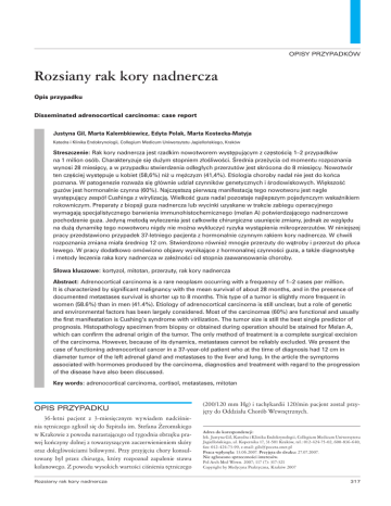 OPISY PRZYPADKÓW Rozsiany rak kory nadnercza Opis przypadku Disseminated adrenocortical carcinoma: case report Justyna Gil, Marta Kalembkiewicz, Edyta Polak, Marta Kostecka-Matyja Katedra i Klinika Endokrynologii, Collegium Medicum Uniwersytetu Jagiellońskiego, Kraków Streszczenie: Rak kory nadnercza jest rzadkim nowotworem występującym z częstością 1–2 przypadków na 1 milion osób. Charakteryzuje się dużym stopniem złośliwości. Średnia przeżycia od momentu rozpoznania wynosi 28 miesięcy, a w przypadku stwierdzenia odległych przerzutów jest skrócona do 8 miesięcy. Nowotwór ten częściej występuje u kobiet (58,6%) niż u mężczyzn (41,4%). Etiologia choroby nadal nie jest do końca poznana. W patogenezie rozważa się głównie udział czynników genetycznych i środowiskowych. Większość guzów jest hormonalnie czynna (60%). Najczęstszą pierwszą manifestacją tego nowotworu jest nagle występujący zespół Cushinga z wirylizacją. Wielkość guza nadal pozostaje najlepszym pojedynczym wskaźnikiem rokowniczym. Preparaty z biopsji guza nadnercza lub wycinki uzyskane w trakcie zabiegu operacyjnego wymagają specjalistycznego barwienia immunohistochemicznego (melan A) potwierdzającego nadnerczowe pochodzenie guza. Jedyną metodą wyleczenia jest całkowite chirurgiczne usunięcie zmiany, jednak ze względu na dużą dynamikę tego nowotworu nigdy nie można wykluczyć ryzyka wystąpienia mikroprzerzutów. W niniejszej pracy przedstawiono przypadek 37-letniego pacjenta z hormonalnie czynnym rakiem kory nadnercza. W chwili rozpoznania zmiana miała średnicę 12 cm. Stwierdzono również mnogie przerzuty do wątroby i przerzut do płuca lewego. W pracy dodatkowo omówiono objawy wynikające z hormonalnej czynności guza, a także diagnostykę i metody leczenia raka kory nadnercza w zależności od stopnia zaawansowania choroby. Słowa kluczowe: kortyzol, mitotan, przerzuty, rak kory nadnercza Abstract: Adrenocortical carcinoma is a rare neoplasm occurring with a frequency of 1–2 cases per million. It is characterized by significant malignancy with the mean survival of about 28 months, and in the presence of documented metastases survival is shorter up to 8 months. This type of a tumor is slightly more frequent in women (58.6%) than in men (41.4%). Etiology of adrenocortical carcinoma is still unclear, but a role of genetic and environmental factors has been largely considered. Most of the carcinomas (60%) are functional and usually the first manifestation is Cushing’s syndrome with virilization. The tumor size is still the best single predictor of prognosis. Histopathology specimen from biopsy or obtained during operation should be stained for Melan A, which can confirm the adrenal origin of the tumor. The only method of treatment is a complete surgical excision of the carcinoma. However, because of its dynamics, metastases cannot be reliably excluded. We present the case of functioning adrenocortical cancer in a 37-year-old patient who at the time of diagnosis had 12 cm in diameter tumor of the left adrenal gland and metastases to the liver and lung. In the article the symptoms associated with hormones produced by the carcinoma, diagnostics and treatment with regard to the progression of the disease have also been discussed. Key words: adrenocortical carcinoma, cortisol, metastases, mitotan OPIS PRZYPADKU 36-letni pacjent z 3-miesięcznym wywiadem nadciśnienia tętniczego zgłosił się do Szpitala im. Stefana Żeromskiego w Krakowie z powodu narastającego od tygodnia obrzęku prawej kończyny dolnej z towarzyszącym zaczerwienieniem skóry oraz dolegliwościami bólowymi. Przy przyjęciu chory konsultowany był przez chirurga, który rozpoznał zapalenie stawu kolanowego. Z powodu wysokich wartości ciśnienia tętniczego Rozsiany rak kory nadnercza (200/120 mm Hg) i tachykardii 120/min pacjent został przyjęty do Oddziału Chorób Wewnętrznych. Adres do korespondencji: lek. Justyna Gil, Katedra i Klinika Endokrynologii, Collegium Medicum Uniwersytetu Jagiellońskiego, ul. Kopernika 17, 31-501 Kraków, tel.: 012-424-75-02, 600-836-640, fax: 012-424-73-99, e-mail: [email protected] Praca wpłynęła: 13.06.2007. Przyjęta do druku: 27.07.2007. Nie zgłoszono sprzeczności interesów. Pol Arch Med Wewn. 2007; 117 (7): 317-321 Copyright by Medycyna Praktyczna, Kraków 2007 317 OPISY PRZYPADKÓW Ryc. 1. Tomografia komputerowa jamy brzusznej. Guz nadnercza lewego Ryc. 2. Tomografia komputerowa jamy brzusznej. Guz nadnercza lewego (strzałka gruba) oraz mnogie przerzuty w wątrobie (strzałki cienkie) Przed hospitalizacją stosował enalapryl 2 × 5 mg/d ze względu na nadciśnienie tętnicze. W wykonanych badaniach laboratoryjnych stwierdzono hipokaliemię 3,38 mmol/l, zwiększone wartości aminotransferaz: asparaginianowej (AST) – 87 U/l oraz alaninowej (ALT) – 125 U/l, zwiększone stężenie glukozy – 7,72 mmol/l, białka C-reaktywnego – 54 mg/l oraz nieco zmniejszone stężenie białka całkowitego – 51,8 g/l. Morfologia krwi, układ krzepnięcia, OB, sód, stężenie bilirubiny całkowitej oraz parametry nerkowe mieściły się w granicach normy. Do leczenia włączono inhibitor enzymu konwertującego angiotensynę II (ACE), bloker kanałów wapniowych, a-bloker oraz lek moczopędny oszczędzający potas. Na skutek zastoso318 wanego leczenia hipotensyjnego zmniejszono wartości ciśnienia do 160/90 mm Hg. Pomimo substytucji doustnej, a następnie dożylnej – 80 mEq/d, stężenie potasu we krwi zmniejszało się i w 11. dniu hospitalizacji wynosiło 2,24 mmol/l. Dobowa utrata potasu z moczem mieściła się w granicach normy. Na zdjęciu RTG klatki piersiowej stwierdzono plamisty miękki cień wielkości 17 mm w polu środkowym lewym oraz powiększenie sylwetki serca w wymiarze poprzecznym. Na podstawie badania USG jamy brzusznej, w którym uwidoczniono w górnym biegunie wnęki nerki lewej lity guz wielkości 12 × 10 × 10 cm oraz wątro
