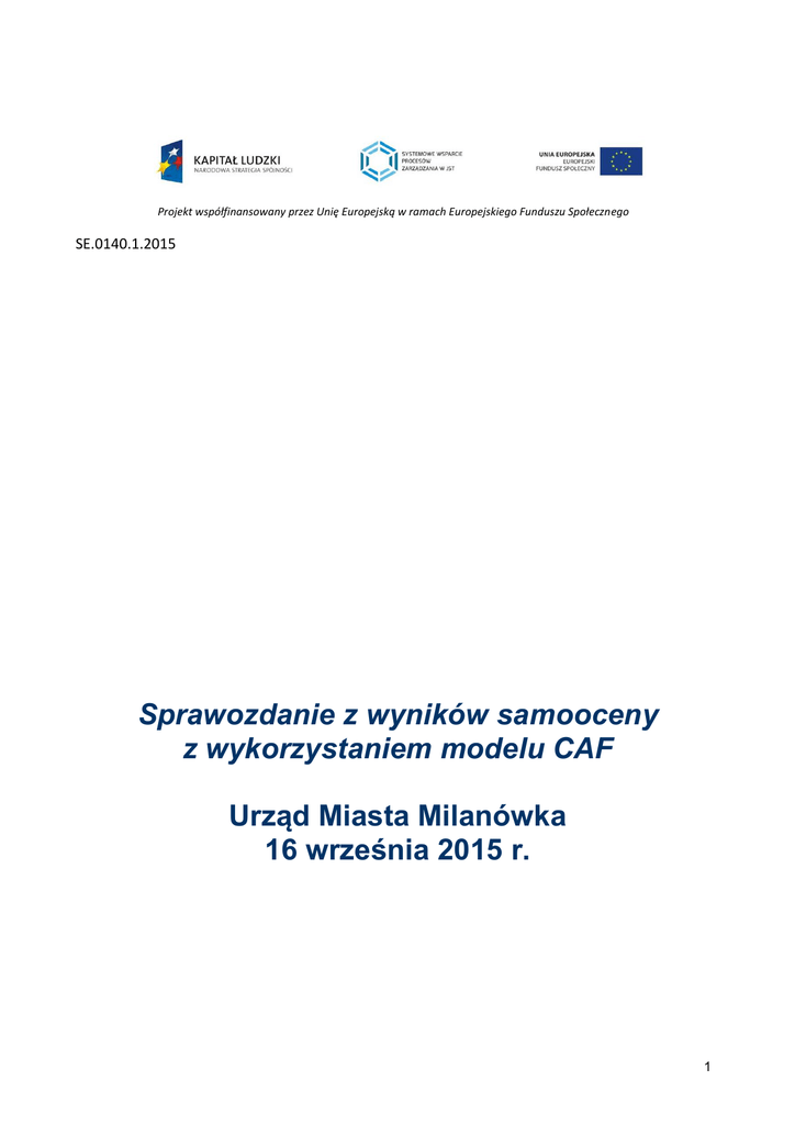 Projekt współfinansowany przez Unię Europejską w ramach Europejskiego Funduszu Społecznego SE.0140.1.2015 Sprawozdanie z wyników samooceny z wykorzystaniem modelu CAF Urząd Miasta Milanówka 16 września 2015 r. 1 Wstęp Niniejsze sprawozdanie zawiera wyniki samooceny przeprowadzonej w Urzędzie Miasta Milanówka z wykorzystaniem modelu CAF 2013. Urząd został poddany samoocenie w oparciu o 9 kryteriów potencjału i wyników. Na podstawie rezultatów samooceny określono mocne strony oraz obszary wymagające poprawy. Model CAF (Common Assessment Framework) – Wspólna Metoda Oceny jest stosowany przez organizacje administracji publicznej w całej Unii Europejskiej do oceny oraz doskonalenia systemu zarządzania. Raport został przedstawiony kierownictwu organizacji dla dokonania szczegółowej analizy mocnych stron i obszarów do doskonalenia wyboru oraz oceny możliwych działań doskonalących do realizacji w Urzędzie. Raport został przygotowany przez Macieja Jastrzębskiego – Sekretarza Miasta/Koordynatora ds. CAF przy współudziale członków Zespołu. W skład Samorządowego Zespołu ds. CAF wchodziły następujące osoby: 1. Maciej Jastrzębski – Sekretarz Miasta, 2. Bożena Sehn – Skarbnik Miasta, 3. Adriana Siłka-Lesiakowska – Kierownik Urzędu Stanu Cywilnego, 4. Anna Zajączkowska – Kierownik Referatu Organizacyjnego, 5. Joanna Sierpińska – Kierownik Referatu Technicznej Obsługi Miasta, 6. Emilia Misiak – p.o. Kierownika Referatu Ochrony Środowiska i Gospodarki Zielenią, 7. Anna Fabisiak – Kierownik Referatu Gospodarki Nieruchomościami i Planowania Przestrzennego, 8. Katarzyna Wąsińska-Jano – Kierownik Referatu Oświaty, 9. Łukasz Ryk – samodzielne stanowisko ds. Obrony Cywilnej i Zarządzania Kryzysowego/Archiwum Zakładowe, 10. Wojciech Wanat – Pełnomocnik Burmistrza ds. Profilaktyki Uzależnień, 11. Jacek Wojdyła – Koordynator Zespołu ds. Informatyki. Koordynatorem Samorządowego Zespołu ds. CAF był Maciej Jastrzębski – Sekretarz Miasta. 2 Samoocena Samoocena Samoocenę przeprowadzono w ramach procesu, na który składało się następujące działania: 1. Szkolenie wstępne – przygotowanie do procesu samooceny. 2. Zbieranie dokumentów i informacji obejmujących wszystkie obszary Modelu w ramach podzespołów. 3. Warsztaty samooceny, które odbyły się w dniach 1-2 września 2015 r. Proces odbywał się w ramach 10 kroków doskonalenia organizacji wg CAF – w ramach pierwszych dwóch faz: Faza 1 – Początek drogi z CAF Krok 1 - Zdecyduj, jak zorganizować i zaplanować samoocenę Krok 2 - Upowszechnij informację o projekcie samooceny Faza 2 – Proces samooceny Krok 3 - Utwórz jedną lub więcej grup samooceny Krok 4 - Zorganizuj szkolenie Krok 5 - Przeprowadź samoocenę Obecne sprawozdanie jest realizacją Kroku 6 - Sporządź sprawozdanie z wyników samooceny W celu przeprowadzenia samooceny powołano zespół samooceny złożony z 11 osób – pracowników Urzędu. Zespół został podzielony na 4 podzespoły i każdemu z nich przydzielono określone kryteria modelu CAF. Przed warsztatem samooceny podzespoły pracowały samodzielnie nad zebraniem dokumentów i informacji oraz dokonaniem wstępnej samooceny w zakresie przydzielonych kryteriów. Zapis pracy zespołów zostały dokonany w formularzach samooceny. Skład podzespołów i opracowywane kryteria: Podzespół Nr 1, opracowujący kryteria 2, 5 i 8: 1. Maciej Jastrzębski 2. Jacek Wojdyła Podzespół Nr 2, opracowujący kryteria 4 i 6: 1. Bożena Sehn 2. Anna Zajączkowska 3. Wojciech Wanat Podzespół Nr 3, opracowujący kryteria 1 i 9: 1. Adriana Siłka-Lesiakowska 3 2. Anna Fabisiak 3. Łukasz Ryk Podzespół Nr 4, oceniający kryteria 3 i 7: 1. Joanna Sierpińska 2. Emilia Misiak 3. Katarzyna Wąsińska-Jano Podczas warsztatów samooceny reprezentanci podzespołów przedstawiali wyniki wstępnej samooceny, będącej propozycją podzespołu i wynikiem indywidualnych ocen członków podzespołów. Następnie w całym zespole samooceny drogą dyskusji weryfikowano i uzgadniano ostateczne sformułowania mocnych stron, obszarów do poprawy oraz punktację dla wszystkich podkryteriów modelu CAF. Ostateczne wyniki samooceny są efektem konsensusu osiągniętego w ramach całego zespołu samooceny. Wyniki samooceny przedstawiono w dalszej części raportu w następującym układzie: ogólne wnioski na temat wyników samooceny, ocena punktowa dla poszczególnych podkryteriów modelu CAF, profil punktowy, mocne strony i obszary do poprawy, tabele oceny Wyniki samooceny Ogólne wnioski odnośnie wyników samooceny. Samoocena została dokonana w formie szkolenia wstępnego i warsztatów z ekspertem – Panem Sławomirem Wysockim oraz samodzielnej pracy podzespołów oceniających poszczególne podkryteria. Warsztaty odbyły się w dniach 1-2 września 2015 r. W trakcie warsztatów omówiono wspólnie wyniki prac podzespołów i dążono do wypracowania wspólnych dowodów dla poszczególnych przykładów z podkryteriów. Również wspólnie wskazano mocne strony organizacji Urzędu i obszary do poprawy, a następnie dokonano oceny według punktacji klasycznej. Do samooceny członkowie Zespoły wykorzystali przede wszystkim swoją własną wiedzą na temat organizacji i działania Urzędu. Korzystali jednak również dokumentów regulujących zasady działania i organizację Urzędu (a w niektórych przypadkach – całego Miasta) zawartych w uchwałach Rady Miasta i zarządzeniach Burmistrza, a także w niesformalizowanych zasadach i procedurach. 4 W wyniku samooceny najlepiej oceniono następujące kryteria: „Przywództwo” oraz „Partnerstwo i zasoby” z obszaru kryteriów potencjału. Natomiast najsłabiej oceniono kryteria z obszaru kryteriów wyników. Dla tych kryteriów trudno było znaleźć formalne dowody, gdyż w Urzędzie w praktyce nie funkcjonuje sformalizowany pomiar postrzegania i pomiar efektywności. Zarówno kryteria potencjału, jak i