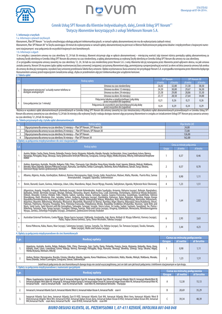 STA/STD/02 Obowiązuje od 07-04-2014 r. Cennik Usług SPT Novum dla Klientów Indywidualnych, dalej „Cennik Usług SPT Novum”1 1 Dotyczy Abonentów korzystających z usługi TeleNovum Novum S.A. 1. Informacje o taryfach 1.a. Informacje o planach taryfowych Abonament „Plan SPT Novum " to taryfa umożliwiająca obsługę połączeń telekomunikacyjnych, w ramach opłaty abonamentowej nie ma do wykorzystania żadnych minut. Abonament „Plan SPT Novum 30 ” to Taryfa zawierająca 30 minut do wykorzystania w ramach opłaty abonamentowej na pierwsze w Okresie Rozliczeniowym połączenia lokalne i międzystrefowe z krajowymi numerami stacjonarnymi oraz połączenia do wszystkich krajowych sieci komórkowych. 1.b. Informacje o ulgach 1) w związku z zawarciem umowy na czas określony 12, 24 lub 36 miesięcy, Abonent otrzymuje ulgę w opłacie abonamentowej – miesięczną wartość ulgi stanowi różnica pomiędzy opłatą abonamentową za wybraną Taryfę określoną w Cenniku Usług SPT Novum dla umowy na czas nieokreślony, a opłatą abonamentową za wybraną Taryfę określoną w Cenniku Usług SPT Novum dla umowy na czas określony. 2) w przypadku rozwiązania umowy zawartej na czas określony 12, 24, 36 lub na czas nieokreślony przez Novum S.A. z winy Abonenta lub jej rozwiązania przez Abonenta przed upływem okresu, na jaki umowa została zawarta, Novum SA ma prawo żądac opłaty wyrównawczej (kary umownej) związanej z przyznaną Abonentowi ulgą, pomniejszoną o proporcjonalną jej wartość za okres od dnia zawarcia umowy lub aneksu do umowy do dnia jej rozwiązania; wysokość kary umownej przedstawia Tabela Kary umowne. Opłata wyrównawcza (kara umowna) nie przysługuje Novum S.A. w przypadku rozwiązania przez Abonenta będącego Konsumentem umowy przed rozpoczęciem świadczenia usługi, chyba ze przedmiotem ulgi jest telekomunikacyjne urządzenie końcowe. 2. Tabela opłat SPT Novum SPT Novum 30 L.p. Rodzaj opłaty zł netto zł brutto zł netto zł brutto Umowa na czas nieokreślony 26,02 32,00 31,30 38,50 Umowa na okres 12 miesięcy 24,39 30,00 29,67 36,50 Abonament miesięczny2 za każdy numer telefonu w 1. dostępie analogowym Umowa na okres 24 miesięcy 23,58 29,00 28,86 35,50 Umowa na okres 36 miesięcy 23,17 28,50 27,64 34,00 Połączenia lokalne u międzystrefowe (całą dobę 0,21 0,26 0,21 0,26 przez wszystkie dni tygodnia) 2. Cena połączenia (za 1 minutę) Połączenia do wszystkich sieci komórkowych(całą dobę 0,24 0,29 0,24 0,29 przez wszystkie dni tygodnia) 2 Różnica w wysokości opłat abonamentowych przewidzianych w Cenniku Usług SPT Novum dla umowy zawartej na czas nieoznaczony a Wysokości opłat abonamentowych przewidzianych w Cenniku Usług SPT Novum dla umowy zawartej na czas określony 12,24 lub 36 miesięcy dla wybranej Taryfy i rodzaju dostępu stanowi ulgę przyznaną Abonentowi w związku ze świadczeniem Usługi SPT Novum przy zawarciu umowy na czas określony 12 ,24 lub 36 mięsiecy. 2a. Tabela przyznanych ulg z tytułu opłat abonamentowych L.p. Rodzaj opłaty Ulga brutto [zł] 1 Ulga przyznana dla umowy na czas określony 12 miesięcy – Plan SPT Novum, SPT Novum 30 24,00 2 Ulga przyznana dla umowy na czas określony 24 miesięcy – Plan SPT Novum, SPT Novum 30 72,00 3 Ulga przyznana dla umowy na czas określony 36 miesięcy – Plan SPT Novum 126,00 4 Ulga przyznana dla umowy na czas określony 36 miesięcy – Plan SPT Novum 30 162,00 3. Opłaty za połączenia międzynarodowe do sieci stacjonarnych Cena za minutę połączenia L.p. Rodzaj opłaty Grupa zł netto zł brutto 1. Austria, Belgia, Czechy, Dania, Estonia, Finlandia, Francja, Grecja, Hiszpania, Holandia, Irlandia, Kanada, Liechtenstein, Litwa, Luxemburg, Łotwa, Niemcy, Norwegia, Portugalia, Rosja, Słowacja, Stany Zjednoczone Ameryki Północnej, Szwajcaria, Szwecja, Węgry, Wielka Brytania, Włochy, International freephone 00800 1 0,37 0,46 2. Andora, Argentyna, Australia, Brazylia, Bułgaria, Chile, Chiny, Chorwacja, Cypr, Gibraltar, Hong-Kong, Islandia, Izrael, Japonia, Malezja, Meksyk, Mołdawia, Monako, Nowa Zelandia, Mariany Północne (wyspy), Rumunia, San Marino, Serbia i Czarnogóra, Słowenia, Korea Południowa, Taiwan, Turcja, Ukraina, Dziewicze Wyspy Stanów Zjednoczonych, Wietnam 2 0,57 0,70 3. Albania, Algieria, Aruba, Azerbejdżan, Białoruś, Bośnia i Hercegowina, Egipt, Gruzja, Indie, Kazachstan, Malawi, Malta, Maroko, Puerto Rico, Samoa Amerykańskie, Singapur, Tajlandia, Turkmenistan 3 0,90 1,11 4. Benin, Burundi, Guam, Gwinea, Indonezja, Liban, Libia, Macedonia, Nepal, Owcze Wyspy, Rwanda, Tadżykistan, Uganda, Wybrzeże Kości Słoniowej 4 1,23 1,51 5. Afganistan, Angola, Anguilla, Antigua i Barbuda (wyspy), Antyle Holenderskie, Arabia Saudyjska, Armenia, Bahama (wyspy), Bahrajn, Bangladesz, Barbados, Belize, Bermudy (wyspy), Bhutan, Boliwia, Botswana, Brunei, Burkina Faso, Czad, Dominika, Dominikana, Dziewicze Wyspy Brytyjskie, Dżibuti, Ekwador, Erytrea, Etiopia, Fidżi, Filipiny, Gabon, Gambia, Ghana, Grenada, Gujana, Gujana Francuska, Gwadelupa, Gwatemala, Gwinea Równikowa, Haiti, Honduras, Iran, Jamajka, Jemen, Jordania, Kajmany (wyspy), Kambodża, Kamerun, Katar, Kirgistan, Kolumbia, Kongo, Kongo Republika Demokratyczna, Kostaryka, Kuwejt, Laos, Lesotho, Liberia, Madagaskar, Makau, Malediwy, Mali, Marshalla Wyspy, Martynika, Mauretania, Mauritius, Mayotte, Mikronezja, Mongolia, Monserrat, Mozambik, Myanmar (d. Birma), Namibia, Niger, Nigeria, Nikaragua, Nowa Kaledonia, Oman, Pakistan, Palestyna, Panama, Paragwaj, Peru, Polinezja Francuska, Południowa Afryka, Republika Środkowo Afrykańska, Reunion, Saint Kitts and Nevis, Saint Lucia, Saint Vincent and the Grenadines, Salwador, Senegal, Seszele, Sierra Leone, Sri Lanka, Sudan, Surinam, Swaziland, Św. Piotra i Mikelona, Tanzania, Togo, Tonga (wyspy), Trynidad i Tobago, Tunezja, Turks and Caicos (wyspy), Urugwaj, Uzbekistan, Wenezuela, Wniebowstąpienia Wyspa, Zambia, Zielonego Przyl