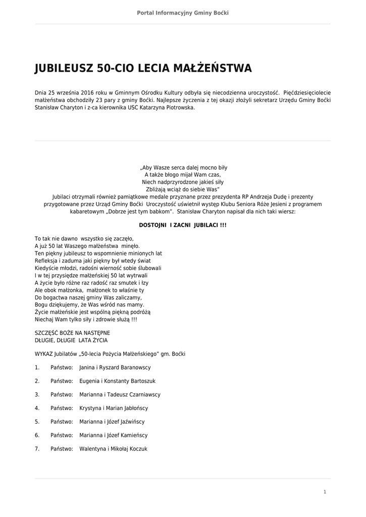 Portal Informacyjny Gminy Boćki JUBILEUSZ 50-CIO LECIA MAŁŻEŃSTWA Dnia 25 września 2016 roku w Gminnym Ośrodku Kultury odbyła się niecodzienna uroczystość. Pięćdziesięciolecie małżeństwa obchodziły 23 pary z gminy Boćki. Najlepsze życzenia z tej okazji złożyli sekretarz Urzędu Gminy Boćki Stanisław Charyton i z-ca kierownika USC Katarzyna Piotrowska. „Aby Wasze serca dalej mocno biły A także błogo mijał Wam czas, Niech nadprzyrodzone jakieś siły Zbliżają wciąż do siebie Was” Jubilaci otrzymali również pamiątkowe medale przyznane przez prezydenta RP Andrzeja Dudę i prezenty przygotowane przez Urząd Gminy Boćki Uroczystość uświetnił występ Klubu Seniora Róże Jesieni z programem kabaretowym „Dobrze jest tym babkom”. Stanisław Charyton napisał dla nich taki wiersz: DOSTOJNI I ZACNI JUBILACI !!! To tak nie dawno wszystko się zaczęło, A już 50 lat Waszego małżeństwa minęło. Ten piękny jubileusz to wspomnienie minionych lat Refleksja i zaduma jaki piękny był wtedy świat Kiedyście młodzi, radośni wierność sobie ślubowali I w tej przysiędze małżeńskiej 50 lat wytrwali A życie było różne raz radość raz smutek i łzy Ale obok małżonka, małżonek to właśnie ty Do bogactwa naszej gminy Was zaliczamy, Bogu dziękujemy, że Was wśród nas mamy. Życie małżeńskie jest wspólną piękną podróżą Niechaj Wam tylko siły i zdrowie służą !!! SZCZĘŚĆ BOŻE NA NASTĘPNE DŁUGIE, DŁUGIE LATA ŻYCIA WYKAZ Jubilatów „50-lecia Pożycia Małżeńskiego” gm. Boćki 1. Państwo: Janina i Ryszard Baranowscy 2. Państwo: Eugenia i Konstanty Bartoszuk 3. Państwo: Marianna i Tadeusz Czarniawscy 4. Państwo: Krystyna i Marian Jabłońscy 5. Państwo: Marianna i Józef Jaźwińscy 6. Państwo: Marianna i Józef Kamieńscy 7. Państwo: Walentyna i Mikołaj Koczuk 1 Portal Informacyjny Gminy Boćki 8. Państwo: Apolonia i Tadeusz Lubowiccy 9. Państwo: Nadzieja i Aleksander Matwiejuk 10. Państwo: Nina i Mikołaj Muśko 11. Państwo: Maria i Włodzimierz Muśko 12. Państwo: Kazimiera i Stanisław Niechoda 13. Państwo: Stanisława i Mieczysław Ofman 14. Państwo: Janina i Kazimierz Olszewscy 15. Państwo: Maria i Lucjan Piotrowscy 16. Państwo: Jadwiga i Józef Płonowscy 17 Państwo: Jadwiga i Wacław Sokołowscy 18. Państwo: Raisa i Jan Tomczuk 19. Państwo: Maria i Zygmunt Topczewscy 20. Państwo: Lidia i Grzegorz Waskiewicz 21. Państwo: Irena i Józef Wiercińscy 22. Państwo: Walentyna i Czesław Wojciuk 23. Państwo: Irena i Jerzy Wysoccy 2