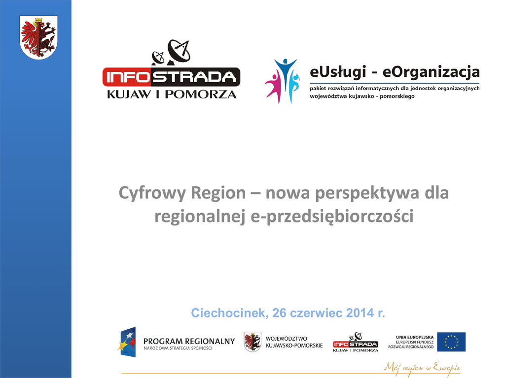 Cyfrowy Region – nowa perspektywa dla regionalnej e-przedsiębiorczości Ciechocinek, 26 czerwiec 2014 r. Oś priorytetowa 2 Cyfrowy region (alokacja na poziomie 30 MEUR) Oś priorytetowa 2. Cyfrowy region odpowiada celowi tematycznemu 2. Zwiększenie dostępności, stopnia wykorzystania i jakości technologii informacyjno-komunikacyjnych i będzie realizowana poprzez następujące priorytety inwestycyjne: 2.2 Rozwój produktów i usług opartych na technologiach informacyjnych i komunikacyjnych (TIK); przeniesiono do 3.1 Wsparcie tworzenia MŚP 100 MEUR 2.3 Wzmacnianie zastosowania TIK dla eadministracji, e-learningu, e-integracji, e-kultury, e-zdrowia. Priorytet inwestycyjny 2.2. Rozwój produktów i usług opartych na TIK Cel szczegółowy: - wsparcie zastosowania technologii komunikacyjnych i informacyjnych (TIK) w produkcji i usługach. Oczekiwane rezultaty: Wykorzystanie produktów i usług TIK przez przedsiębiorców przyczyni się w zasadniczy sposób do wzrostu ich konkurencyjności niezależnie od sektora gospodarki, w którym prowadzą swoją działalność. Priorytet inwestycyjny 2.2. Rozwój produktów i usług opartych na TIK Oczekiwane rezultaty: • • • • Wykorzystanie technologii cyfrowych w gospodarce umożliwi tworzenie nowych przedsiębiorstw, produktów i usług, otworzy nowe kanały dystrybucyjne oraz umożliwi nową organizację przedsiębiorstw. umożliwiając zdalne sterowanie procesami, zarządzanie rozproszonymi zasobami, itp. oraz współpracę między partnerami biznesowymi w modelu B2B. Stosowanie TIK wesprze również jego procesy decyzyjne, monitoring ponoszonych kosztów czy wykorzystania posiadanej infrastruktury. Zwiększenie dostępności i stopnia wykorzystania TIK będzie miało wpływ na realizację działań skierowanych na wzrost aktywności zawodowej (np. alternatywne formy zatrudnienia w Osi Priorytetowej 8 i 10). Realizacja interwencji w tym obszarze będzie miała wpływ na działania realizowane w Osi Priorytetowej 1 w zakresie B+R w obszarze TIK (przy współudziale przedsiębiorstw) oraz na działania w Osi Priorytetowej 3 związane ze wsparciem MŚP. Priorytet inwestycyjny 2.2. Rozwój produktów i usług opartych na TIK Opis przedsięwzięć planowanych w ramach priorytetu inwestycyjnego: 1) rozwój produktów i usług opartych na TIK 2) sprzedaż produktów i usług w Internecie (handel elektroniczny) 3) tworzenie i udostępnianie usług elektronicznych odpowiadających na potrzeby MŚP 4) wprowadzenie procesów modernizacyjnych wspierających m.in. procesy decyzyjne, zarządzanie, itp. Priorytet inwestycyjny 2.2. Rozwój produktów i usług opartych na TIK Typy beneficjentów: Mikro, małe i średnie przedsiębiorstwa. Terytorialny obszar realizacji: Obszar całego regionu. • Projekty w priorytecie wybierane będą w trybie konkursowym. • Decyzja dotycząca formy i zakresu wykorzystania instrumentów finansowych w ramach priorytetu podjęta zostanie na podstawie wyników analizy ex ante instrumentów finansowych. • Nie przewiduje się realizacji dużych projektów. Priorytet inwestycyjny 2.3. Wzmacnianie zastosowania TIK dla eadministracji, e-learningu, e-integracji, e-kultury, e-zdrowia Cel szczegółowy: - rozwój e-usług sektora publicznego. Oczekiwane rezultaty: Oczekuje się poprawy jakości oraz usprawnień w zarządzaniu administracją publiczną poprzez wdrożenie technologii komunikacyjno-informacyjnych. Będą one wykorzystywane również w celu udoskonalania zdalnego przekazu pomiędzy urzędem a mieszkańcem, ze szczególnym uwzględnieniem przedsiębiorców. Istotną rolę w tym procesie odgrywać będą narzędzia internetowe (portale, serwisy mapowe, internetowe skrzynki podawcze, elektroniczne dokumenty i inne), które skrócą czas obiegu dokumentów i usprawnią procedury administracyjne. Priorytet inwestycyjny 2.3. Wzmacnianie zastosowania TIK dla eadministracji, e-learningu, e-integracji, e-kultury, e-zdrowia Oczekiwane rezultaty: Wsparcie udzielane na rozwój technologii telemedycznych usprawni funkcjonowania opieki medycznej w województwie oraz przyczyni się do powstania nowych kanałów komunikacji pacjent-lekarz i lekarz-lekarz. Umożliwi także stosowanie cyfrowych technik diagnostyki i terapii. Wdrożone zostaną nowoczesne formy kształcenia, wykorzystujące dostępne narzędzia TIK. Oczekiwanym rezultatem będzie również upowszechnienie i szeroki dostęp do zdigitalizowanych zasobów kulturalnych, archiwalnych i bibliotecznych. Efektem realizacji priorytetu będzie także uruchamianie specjalistycznych zintegrowanych platform cyfrowych przez podmioty świadczące usługi publiczne dla ludności jak na przykład: systemy: w sferze administracji i zarządzania, z zakresu bezpieczeństwa publicznego (np. ratownictwa medycznego), teleedukacyjne, monitorowania (np. środowiska przyrodniczego, produkcji rolnej i innych). Priorytet inwestycyjny 2.3. Wzmacnianie zastosowania TIK dla eadministracji, e-learningu, e-integracji, e-kultury, e-zdrowia Opis przedsięwzięć planowanych w ramach priorytetu inwestycyjnego: • • • wsparcie rozwoju elektronicznych usług publicznych szczebla regionalnego/lokalnego oraz zwiększenie dostępu do nich obywateli, w tym m.in. projektów z zakresu e-administracji, e-zdrowia, e-edukacji, e-kultury, systemów informacji przestrzennej wsparcie digitalizacji zasobów kulturowych, naukowych i edukacyjnych będących w posiadaniu instytucji szczebla regionalnego/lokalnego, a także zapewnienie powszechnego, otwartego dostępu w postaci cyfrowej do tych zasobów rozwój infrastruktury informatycznej, w tym aplikacji i systemów bazodanowych, służących poprawie efektywności zarządzania oraz upowszechnianiu komunikacji elektronicznej w instytucjach publicznych (np. podpis elektroniczny, elektroniczny obieg dokumentów itp.) Priorytet inwestycyjny 2.3. Wzmacnianie zastosowania TIK dla eadministracji, e-learningu, e-integracji, e-kultury, e-zdrowia Typy beneficjent