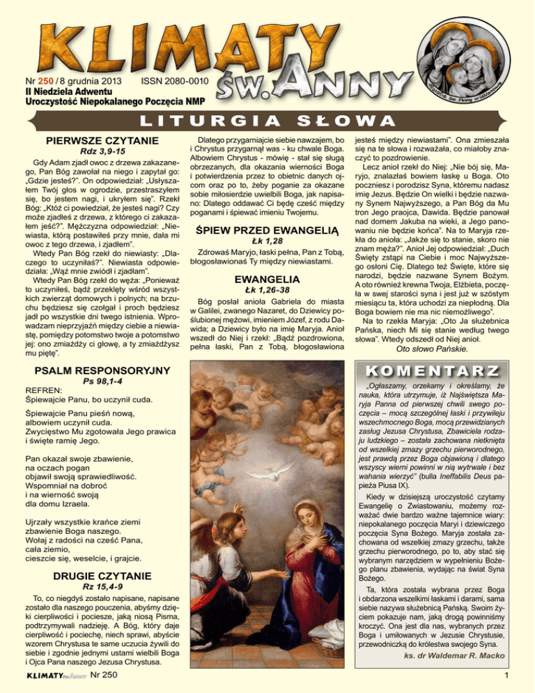 Nr 250 / 8 grudnia 2013 ISSN 2080-0010 II Niedziela Adwentu Uroczystość Niepokalanego Poczęcia NMP LITURGIA PIERWSZE CZYTANIE Rdz 3,9-15 Gdy Adam zjadł owoc z drzewa zakazanego, Pan Bóg zawołał na niego i zapytał go: „Gdzie jesteś?”. On odpowiedział: „Usłyszałem Twój głos w ogrodzie, przestraszyłem się, bo jestem nagi, i ukryłem się”. Rzekł Bóg: „Któż ci powiedział, że jesteś nagi? Czy może zjadłeś z drzewa, z którego ci zakazałem jeść?”. Mężczyzna odpowiedział: „Niewiasta, którą postawiłeś przy mnie, dała mi owoc z tego drzewa, i zjadłem”. Wtedy Pan Bóg rzekł do niewiasty: „Dlaczego to uczyniłaś?”. Niewiasta odpowiedziała: „Wąż mnie zwiódł i zjadłam”. Wtedy Pan Bóg rzekł do węża: „Ponieważ to uczyniłeś, bądź przeklęty wśród wszystkich zwierząt domowych i polnych; na brzuchu będziesz się czołgał i proch będziesz jadł po wszystkie dni twego istnienia. Wprowadzam nieprzyjaźń między ciebie a niewiastę, pomiędzy potomstwo twoje a potomstwo jej: ono zmiażdży ci głowę, a ty zmiażdżysz mu piętę”. PSALM RESPONSORYJNY Ps 98,1-4 REFREN: Śpiewajcie Panu, bo uczynił cuda. Śpiewajcie Panu pieśń nową, albowiem uczynił cuda. Zwycięstwo Mu zgotowała Jego prawica i święte ramię Jego. Pan okazał swoje zbawienie, na oczach pogan objawił swoją sprawiedliwość. Wspomniał na dobroć i na wierność swoją dla domu Izraela. Ujrzały wszystkie krańce ziemi zbawienie Boga naszego. Wołaj z radości na cześć Pana, cała ziemio, cieszcie się, weselcie, i grajcie. DRUGIE CZYTANIE Rz 15,4-9 To, co niegdyś zostało napisane, napisane zostało dla naszego pouczenia, abyśmy dzięki cierpliwości i pociesze, jaką niosą Pisma, podtrzymywali nadzieję. A Bóg, który daje cierpliwość i pociechę, niech sprawi, abyście wzorem Chrystusa te same uczucia żywili do siebie i zgodnie jednymi ustami wielbili Boga i Ojca Pana naszego Jezusa Chrystusa. Nr 250 SŁOWA Dlatego przygarniajcie siebie nawzajem, bo i Chrystus przygarnął was - ku chwale Boga. Albowiem Chrystus - mówię - stał się sługą obrzezanych, dla okazania wierności Boga i potwierdzenia przez to obietnic danych ojcom oraz po to, żeby poganie za okazane sobie miłosierdzie uwielbili Boga, jak napisano: Dlatego oddawać Ci będę cześć między poganami i śpiewać imieniu Twojemu. ŚPIEW PRZED EWANGELIĄ Łk 1,28 Zdrowaś Maryjo, łaski pełna, Pan z Tobą, błogosławionaś Ty między niewiastami. EWANGELIA Łk 1,26-38 Bóg posłał anioła Gabriela do miasta w Galilei, zwanego Nazaret, do Dziewicy poślubionej mężowi, imieniem Józef, z rodu Dawida; a Dziewicy było na imię Maryja. Anioł wszedł do Niej i rzekł: „Bądź pozdrowiona, pełna łaski, Pan z Tobą, błogosławiona jesteś między niewiastami”. Ona zmieszała się na te słowa i rozważała, co miałoby znaczyć to pozdrowienie. Lecz anioł rzekł do Niej: „Nie bój się, Maryjo, znalazłaś bowiem łaskę u Boga. Oto poczniesz i porodzisz Syna, któremu nadasz imię Jezus. Będzie On wielki i będzie nazwany Synem Najwyższego, a Pan Bóg da Mu tron Jego praojca, Dawida. Będzie panował nad domem Jakuba na wieki, a Jego panowaniu nie będzie końca”. Na to Maryja rzekła do anioła: „Jakże się to stanie, skoro nie znam męża?”. Anioł Jej odpowiedział: „Duch Święty zstąpi na Ciebie i moc Najwyższego osłoni Cię. Dlatego też Święte, które się narodzi, będzie nazwane Synem Bożym. A oto również krewna Twoja, Elżbieta, poczęła w swej starości syna i jest już w szóstym miesiącu ta, która uchodzi za niepłodną. Dla Boga bowiem nie ma nic niemożliwego”. Na to rzekła Maryja: „Oto Ja służebnica Pańska, niech Mi się stanie według twego słowa”. Wtedy odszedł od Niej anioł. Oto słowo Pańskie. K O M E N TA R Z „Ogłaszamy, orzekamy i określamy, że nauka, która utrzymuje, iż Najświętsza Maryja Panna od pierwszej chwili swego poczęcia – mocą szczególnej łaski i przywileju wszechmocnego Boga, mocą przewidzianych zasług Jezusa Chrystusa, Zbawiciela rodzaju ludzkiego – została zachowana nietknięta od wszelkiej zmazy grzechu pierworodnego, jest prawdą przez Boga objawioną i dlatego wszyscy wierni powinni w nią wytrwale i bez wahania wierzyć” (bulla Ineffabilis Deus papieża Piusa IX). Kiedy w dzisiejszą uroczystość czytamy Ewangelię o Zwiastowaniu, możemy rozważać dwie bardzo ważne tajemnice wiary: niepokalanego poczęcia Maryi i dziewiczego poczęcia Syna Bożego. Maryja została zachowana od wszelkiej zmazy grzechu, także grzechu pierworodnego, po to, aby stać się wybranym narzędziem w wypełnieniu Bożego planu zbawienia, wydając na świat Syna Bożego. Ta, która została wybrana przez Boga i obdarzona wszelkimi łaskami i darami, sama siebie nazywa służebnicą Pańską. Swoim życiem pokazuje nam, jaką drogą powinniśmy kroczyć. Ona jest dla nas, wybranych przez Boga i umiłowanych w Jezusie Chrystusie, przewodniczką do królestwa swojego Syna. ks. dr Waldemar R. Macko 1 Po czym rozpoznać chrześcijanina? Co to znaczy być chrześcijaninem? W liście pasterskim ks. kard. Kazimierza Nycza, skierowanym do wiernych naszej archidiecezji z okazji zakończenia Roku Wiary, czytamy: „Każdy z nas powinien zadać sobie pytanie, czy w swoim codziennym życiu, w decyzjach, które podejmuje, w relacjach do drugiego człowieka – jestem prawdziwie uczniem Chrystusa? Czy żyję Ewangelią na co dzień? A ostatecznie, czy wierzę Bogu i Jego słowu, które zostało objawione przez Jezusa Chrystusa? Czy wierzę w te słowa, które w każdą niedzielę wypowiadam w Kościele podczas wyznania wiary? Wreszcie, jakie jest moje świadectwo wiary i życia chrześcijańskiego?”. Po czym rozpoznać chrześcijanina? Odpowiedzi poszukajmy w Księdze, w której znajdziemy odpowiedź na każde pytanie, w Księdze Życia – w Piśmie Świętym. Jezus Chrystus wiele razy ukazuje nam na 