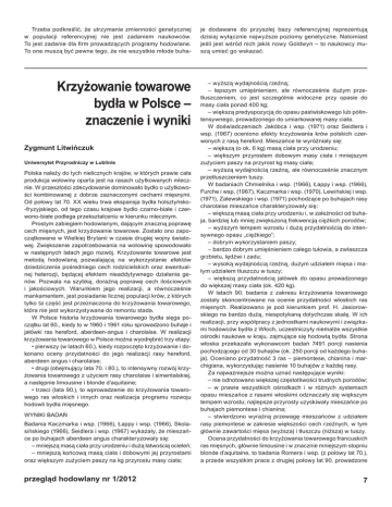 Trzeba podkreślić, że utrzymanie zmienności genetycznej w populacji referencyjnej nie jest zadaniem naukowców. To jest zadanie dla firm prowadzących programy hodowlane. To one muszą być pewne tego, że nie wszystkie młode buha- je dodawane do przyszłej bazy referencyjnej reprezentują dzisiaj wyłącznie najwyższe poziomy genetyczne. Natomiast jeśli jest wśród nich jakiś nowy Goldwyn – to naukowcy muszą umieć go wskazać. Krzyżowanie towarowe bydła w Polsce – znaczenie i wyniki – wyższą wydajnością rzeźną; – lepszym umięśnieniem, ale równocześnie dużym przetłuszczeniem, co jest szczególnie widoczne przy opasie do masy ciała ponad 400 kg; – większą predyspozycją do opasu pastwiskowego lub półintensywnego, prowadzonego do umiarkowanej masy ciała. W doświadczeniach Jakóbca i wsp. (1971) oraz Seidlera i wsp. (1967) oceniono efekty krzyżowania krów polskich czerwonych z rasą hereford. Mieszańce te wyróżniały się: – większą (o ok. 6 kg) masą ciała przy urodzeniu; – większym przyrostem dobowym masy ciała i mniejszym zużyciem paszy na przyrost kg masy ciała; – wyższą wydajnością rzeźną, ale równocześnie znacznym przetłuszczeniem tuszy. W badaniach Chmielnika i wsp. (1966), Łappy i wsp. (1966), Furche i wsp. (1967), Kaczmarka i wsp. (1970), Lewińskiej i wsp. (1971), Zalewskiego i wsp. (1971) pochodzące po buhajach rasy charolaise mieszańce charakteryzowały się: – większą masą ciała przy urodzeniu i, w zależności od buhaja, bardziej lub mniej zwiększoną frekwencją ciężkich porodów; – wyższym tempem wzrostu i dużą przydatnością do intensywnego opasu „ciężkiego”; – dobrym wykorzystaniem paszy; – bardzo dobrym umięśnieniem całego tułowia, a zwłaszcza grzbietu, lędźwi i zadu; – wysoką wydajnością rzeźną, dużym udziałem mięsa i małym udziałem tłuszczu w tuszy; – większą przydatnością jałówek do opasu prowadzonego do większej masy ciała (ok. 420 kg). W latach 90. badania z zakresu krzyżowania towarowego zostały skoncentrowane na ocenie przydatności włoskich ras mięsnych. Realizowano je pod kierunkiem prof. H. Jasiorowskiego na bardzo dużą, niespotykaną dotychczas skalę. W ich realizacji, przy współpracy z jednostkami naukowymi i związkami hodowców bydła z Włoch, uczestniczyły niemalże wszystkie ośrodki naukowe w kraju, zajmujące się hodowlą bydła. Strona włoska przekazała wykonawcom badań 7491 porcji nasienia pochodzącego od 30 buhajów (ok. 250 porcji od każdego buhaja). Oceniano przydatność 3 ras – piemontese, chianina i marchigiana, wykorzystując nasienie 10 buhajów z każdej rasy. Za najważniejsze można uznać następujące wyniki: – nie odnotowano większej częstotliwości trudnych porodów; – w prawie wszystkich ośrodkach i w różnych systemach opasu mieszańce z rasami włoskimi odznaczały się większym tempem wzrostu; najlepsze przyrosty uzyskiwały mieszańce po buhajach piemontese i chianina; – stwierdzono wyraźną przewagę mieszańców z udziałem rasy piemontese w zakresie większości cech rzeźnych, w tym głównie zawartości mięsa (wyższa) i tłuszczu (niższa) w tuszy. Ocena przydatności do krzyżowania towarowego francuskich ras mięsnych, głównie limousine i w znacznie mniejszym stopniu blonde d’aquitaine, to badania Romera i wsp. (z połowy lat 70.), a przede wszystkim prace z drugiej połowy lat 90. prowadzone Zygmunt Litwińczuk Uniwersytet Przyrodniczy w Lublinie Polska należy do tych nielicznych krajów, w których prawie cała produkcja wołowiny oparta jest na rasach użytkowanych mlecznie. W przeszłości zdecydowanie dominowało bydło o użytkowości kombinowanej z dobrze zaznaczonymi cechami mięsnymi. Od połowy lat 70. XX wieku trwa ekspansja bydła holsztyńsko-fryzyjskiego, od tego czasu krajowe bydło czarno-białe i czerwono-białe podlega przekształceniu w kierunku mlecznym. Prostym zabiegiem hodowlanym, dającym znaczną poprawę cech mięsnych, jest krzyżowanie towarowe. Zostało ono zapoczątkowane w Wielkiej Brytanii w czasie drugiej wojny światowej. Zwiększenie zapotrzebowania na wołowinę spowodowało w następnych latach jego rozwój. Krzyżowanie towarowe jest metodą hodowlaną pozwalającą na wykorzystanie efektów dziedziczenia pośredniego cech rodzicielskich oraz ewentualnej heterozji, będącej efektem nieaddytywnego działania genów. Pozwala na szybką, doraźną poprawę cech ilościowych i jakościowych. Warunkiem jego realizacji, a równocześnie mankamentem, jest posiadanie licznej populacji krów, z których tylko ta część jest przeznaczona do krzyżowania towarowego, która nie jest wykorzystywana do remontu stada. W Polsce historia krzyżowania towarowego bydła sięga początku lat 60., kiedy to w 1960 i 1961 roku sprowadzono buhaje i jałówki ras hereford, aberdeen-angus i charolaise. W realizacji krzyżowania towarowego w Polsce można wyodrębnić trzy etapy: • pierwszy (w latach 60.), kiedy rozpoczęto krzyżowanie i dokonano oceny przydatności do jego realizacji rasy hereford, aberdeen angus i charolaise; • drugi (obejmujący lata 70. i 80.), to intensywny rozwój krzyżowania towarowego z użyciem rasy charolaise i simentalskiej, a następnie limousine i blonde d’aquitaine; • trzeci (lata 90.), to wprowadzenie do krzyżowania towarowego ras włoskich i innych oraz realizacja programu rozwoju hodowli bydła mięsnego. WYNIKI BADAŃ Badania Kaczmarka i wsp. (1966), Łappy i wsp. (1966), Skolasińskiego (1966), Seidlera i wsp. (1967) wykazały, że mieszańce po buhajach aberdeen angus charakteryzowały się: – mniejszą masą ciała przy urodzeniu i dużą łatwością ocieleń; – mniejszą końcową masą ciała i dobowymi jej przyrostami oraz większym zużyciem paszy na kg przyrostu masy ciała; przegląd hodowlany nr 1/2012 7 w Instytucie Zootechniki (Trela i wsp.), IGiHZ PAN w Jastrzębcu (Reklewski i wsp.), o