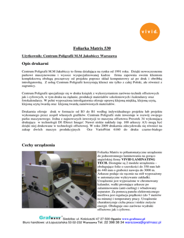 Foliarka Matrix 530 Użytkownik: Centrum Poligrafii M.M Jakubiccy Warszawa Opis drukarni Centrum Poligrafii M.M Jakubiccy to firma działająca na rynku od 1991 roku. Dzięki nowoczesnemu parkowi maszynowemu i wysoce wyspecjalizowanej kadrze firma zapewnia swoim klientom kompleksową obsługę począwszy od projektu poprzez skład komputerowy aż po druk i obróbkę introligatorską. Z usług Centrum Poligrafii korzystają klienci nie tylko z całej Polski, ale również z zagranicy. Centrum Poligrafii specjalizuje się w druku książek z wykorzystaniem zarówno technik offsetowych jak i cyfrowych, w tym druku na żądanie, produkcji materiałów szkoleniowych i kalendarzy oraz fotokalendarzy. W pełni wyposażona introligatornia oferuje oprawę klejoną miękką, klejoną szytą, klejoną szytą twardą oraz klejoną twardą zamówionych materiałów. Drukarnia oferuje druk w formacie od B3 do B1 według indywidualnego projektu lub projektu wykonanego przez zespół własnych grafików. Centrum Poligrafii stale inwestuje w rozwój swojego parku maszynowego. Jedna z najnowszych inwestycji to maszyna offsetowa Presstek 34 wykonująca drukująca w technologii DI /Direct Image/. Nawet niskie nakłady (np. 100 arkuszy A3) mogą być dzięki niej drukowane w technologii offsetowej. W roku 2009 drukarnia zdecydowała się również na zakup dwóch maszyn produkcyjnych Oce VarioPrint 6160 do druku czarno-białego Cechy urządzenia Foliarka Matrix to półautomatyczne urządzenie do jednostronnego laminowania na gorąco angielskiej firmy VIVID LAMINATING TECH. Dostępne są 2 modele urządzenia – obsługujące folie o szerokości do 350 mm lub do 440 mm o grubości nawoju do 3000 m. Arkusze podaje sie ręcznie na stół wyposażony w automatyczne wykrywanie zakładki. Urządzenie jest wyposażone w chromowany kalander, wałki prostujące arkusze po zalaminowaniu (anti-curling) i wbudowany separator. Za pomocą panelu elektronicznego możliwa jest regulacja prędkości (do 7 metrów na minutę) i temperatury pracy. Urządzenie charakteryzuje cicha praca i niskie zużycie energii. Obsługuje ono zarówno wydruki offsetowe jak i cyfrowe. Siedziba: ul. Kościuszki 47 27-500 Opatów www.grafmasz.pl Biuro handlowe: ul.Łopuszańska 53 02-232 Warszawa Tel. 22 398 38 34 [email protected] Zastosowanie urządzenia Centrum Poligrafii zdecydowało sie na foliarkę Matrix 530 obsługująca folie o szerokości do 440 mm. Jako _e firma specjalizuje sie w produkcji książek i galanterii papierniczej urządzenie wykorzystywane jest przede wszystkim do laminowania okładek zarówno pod oprawę miękką jak i twarda szyta. Oprócz tego urządzenie jest używane do foliowania wizytówek, ulotek i wykonywania wielu innych bieżących zleceń. Materiały drukowane są na maszynie cyfrowej XEROX DC 700. Pan Mieczysław Jakubicki jest bardzo zadowolony z posiadanego urządzenie. Jako jego główne zalety wskazuje wysoka jakość wykonanych prac i prosta obsługę urządzenia . Szczególnie wygodną i przyśpieszającą prace funkcja jest automatyczny separator. Siedziba: ul. Kościuszki 47 27-500 Opatów www.grafmasz.pl Biuro handlowe: ul.Łopuszańska 53 02-232 Warszawa Tel. 22 398 38 34 [email protected]