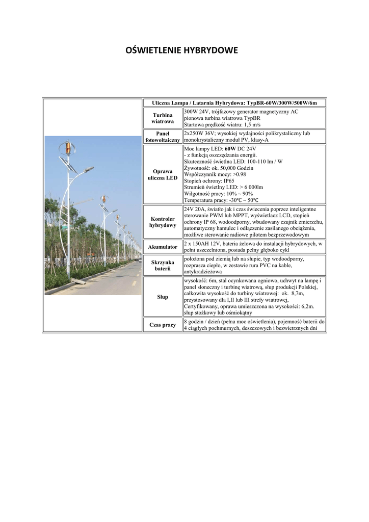OŚWIETLENIE HYBRYDOWE Uliczna Lampa / Latarnia Hybrydowa: TypBR-60W/300W/500W/6m Turbina wiatrowa 300W 24V, trójfazowy generator magnetyczny AC pionowa turbina wiatrowa TypBR Startowa prędkość wiatru: 1,5 m/s 2x250W 36V; wysokiej wydajności polikrystaliczny lub Panel fotowoltaiczny monokrystaliczny moduł PV, klasy-A Oprawa uliczna LED Moc lampy LED: 60W DC 24V - z funkcją oszczędzania energii. Skuteczność świetlna LED: 100-110 lm / W Żywotność: ok. 50,000 Godzin Współczynnik mocy: >0.98 Stopień ochrony: IP65 Strumień świetlny LED: > 6 000lm Wilgotność pracy: 10% ~ 90% Temperatura pracy: -30℃ ~ 50℃ Kontroler hybrydowy 24V 20A, światło jak i czas świecenia poprzez inteligentne sterowanie PWM lub MPPT, wyświetlacz LCD, stopień ochrony IP 68, wodoodporny, wbudowany czujnik zmierzchu, automatyczny hamulec i odłączenie zasilanego obciążenia, możliwe sterowanie radiowe pilotem bezprzewodowym Akumulator 2 x 150AH 12V, bateria żelowa do instalacji hybrydowych, w pełni uszczelniona, posiada pełny głęboko cykl Skrzynka baterii Słup Czas pracy położona pod ziemią lub na słupie, typ wodoodporny, rozprasza ciepło, w zestawie rura PVC na kable, antykradzieżowa wysokość: 6m, stal ocynkowana ogniowo, uchwyt na lampę i panel słoneczny i turbinę wiatrową, słup produkcji Polskiej, całkowita wysokość do turbiny wiatrowej: ok. 8,7m, przystosowany dla I,II lub III strefy wiatrowej, Certyfikowany, oprawa umieszczona na wysokości: 6,2m. słup stożkowy lub ośmiokątny 8 godzin / dzień (pełna moc oświetlenia), pojemność baterii do 4 ciągłych pochmurnych, deszczowych i bezwietrznych dni