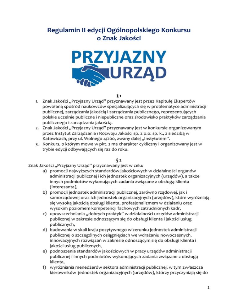 Regulamin II edycji Ogólnopolskiego Konkursu o Znak Jakości §1 1. Znak Jakości „Przyjazny Urząd” przyznawany jest przez Kapitułę Ekspertów powołaną spośród naukowców specjalizujących się w problematyce administracji publicznej, zarządzania jakością i zarządzania publicznego, reprezentujących polskie uczelnie publiczne i niepubliczne oraz środowisko praktyków zarządzania publicznego i zarządzania jakością. 2. Znak Jakości „Przyjazny Urząd” przyznawany jest w konkursie organizowanym przez Instytut Zarządzania i Rozwoju Jakości sp. z o.o. sp. k., z siedzibą w Katowicach, przy ul. Wolnego 4/200, zwany dalej „Instytutem”. 3. Konkurs, o którym mowa w pkt. 2 ma charakter cykliczny i organizowany jest w trybie edycji odbywających się raz do roku. §2 Znak Jakości „Przyjazny Urząd” przyznawany jest w celu: a) promocji najwyższych standardów jakościowych w działalności organów administracji publicznej i ich jednostek organizacyjnych (urzędów), a także innych podmiotów wykonujących zadania związane z obsługą klienta (interesanta), b) promocji jednostek administracji publicznej, zarówno rządowej, jak i samorządowej oraz ich jednostek organizacyjnych (urzędów), które wyróżniają się wysoką jakością obsługi klienta, profesjonalizmem w działaniu oraz wysokim poziomem kompetencji fachowych zatrudnionych kadr, c) upowszechniania „dobrych praktyk” w działalności urzędów administracji publicznej w zakresie odnoszącym się do obsługi klienta i jakości usług publicznych, d) budowania w skali kraju pozytywnego wizerunku jednostek administracji publicznej o szczególnych osiągnięciach we wdrażaniu nowoczesnych, innowacyjnych rozwiązań w zakresie odnoszącym się do obsługi klienta i jakości usług publicznych, e) podnoszenia standardów jakościowych w pracy urzędów administracji publicznej i innych podmiotów wykonujących zadania związane z obsługą klienta, f) wyróżniania menedżerów sektora administracji publicznej, w tym zwłaszcza kierowników jednostek organizacyjnych (urzędów), którzy przyczyniają się do 1 wdrażania w zarządzanych przez siebie instytucjach wysokich standardów jakościowych w zakresie obsługi klienta i świadczenia usług publicznych. §3 O uzyskanie Znaku Jakości „Przyjazny Urząd” mogą ubiegać się jednostki sektora administracji publicznej, zarówno rządowej, jak i samorządowej oraz inne jednostki wykonujące zadania związane z obsługą klienta, w szczególności: a) gminy – poprzez zgłoszenie do konkursu urzędu gminy lub innej jednostki organizacyjnej bądź instytucji wykonującej czynności z zakresu obsługi klienta na szczeblu gminy, b) powiaty - poprzez zgłoszenie do konkursu starostwa powiatowego lub innej jednostki organizacyjnej bądź instytucji wykonującej czynności z zakresu obsługi klienta na szczeblu powiatu, c) samorządy województw - poprzez zgłoszenie do konkursu urzędu marszałkowskiego lub innej jednostki organizacyjnej bądź instytucji wykonującej czynności z zakresu obsługi klienta na szczeblu województwa, d) organy administracji rządowej zespolonej i niezespolonej – poprzez zgłoszenie do konkursu urzędu lub jednostki organizacyjnej bądź instytucji wykonującej czynności z zakresu obsługi klienta, e) przedsiębiorstwa i inne jednostki organizacyjne wykonujące zadania związane z obsługą klienta. §4 Znak Jakości „Przyjazny Urząd” otrzymują jednostki organizacyjne, które: a) stosują wysokie standardy jakościowe w swojej działalności związanej z obsługą klienta/świadczeniem usług publicznych, b) cechują się profesjonalizmem i rzetelnością w działaniach na rzecz swoich interesariuszy zewnętrznych, c) wdrażają nowoczesne i efektywne rozwiązania w zakresie obsługi klienta/ świadczenia usług publicznych, d) inwestują we własne zasoby kadrowe w formach wpływających w sposób istotny na jakość pracy urzędników (np. kursy, szkolenia, odpowiednia polityka motywacyjna itp.), f) są otwarte na potrzeby interesariuszy zewnętrznych. §5 1. Zgłoszenia udziału w konkursie dokonują organy lub osoby upoważnione do reprezentowania jednostki ubiegającej się o uzyskanie Znaku Jakości „Przyjazny Urząd”. 2. Zgłoszenia udziału w konkursie dokonuje się poprzez przesłanie na adres Instytutu zgłoszenia oraz wypełnionego kwestionariusza konkursowego w terminie określonym przez Instytut i ogłoszonym na stronie internetowej Konkursu. 3. Zgłoszenie udziału w konkursie jest równoznaczne z wyrażeniem zgody na udostępnianie danych oraz informacji niezbędnych do przeprowadzenia postępowania konkursowego, zgodnie z przepisami niniejszego Regulaminu. 2 §6 1. Zgłoszenia i kwestionariusze konkursowe podlegają ocenie formalnej, a następnie – pod warunkiem pozytywnego wyniku oceny formalnej – ocenie merytorycznej. 2. Celem oceny formalnej jest sprawdzenie poprawności wypełnienia zgłoszenia i kwestionariusza konkursowego oraz zdolności prawnej jednostki aplikującej o Znak Jakości „Przyjazny Urząd” do udziału w konkursie. 1. 2. 3. 4. 5. §7 Oceny merytorycznej w konkursie dokonują członkowie Kapituły Ekspertów. Kapituła Ekspertów składa się z ekspertów wewnętrznych i ekspertów zewnętrznych. Ekspertów zewnętrznych powołuje się spośród pracowników naukowych polskich uczelni, posiadających co najmniej stopień naukowy doktora, znaczący dorobek naukowy lub praktyczny w dziedzinie administracji publicznej oraz wiadomości specjalistyczne z zakresu zarządzania w administracji, zarządzania publicznego lub zarządzania jakością. Ekspertów wewnętrznych powołuje się spośród członków Zarządu Instytut oraz spośród pracowników lub współpracowników Instytutu, którzy posiadają wiadomości specjalistyczne z zakresu problematyki administracji publicznej, zarządzania publicznego, marketingu publicznego lub zarządzania jakością. Członków Kapi