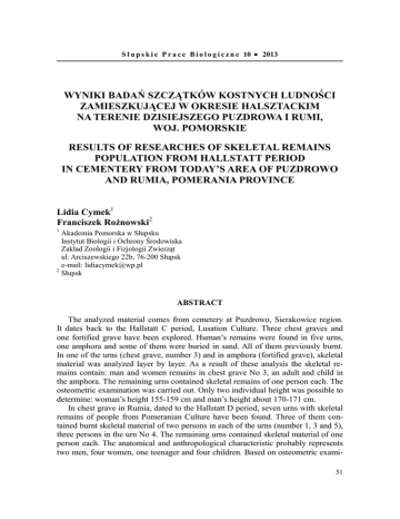 S ł u p s k i e P r a c e B i o l o g i c z n e 10 • 2013 WYNIKI BADAŃ SZCZĄTKÓW KOSTNYCH LUDNOŚCI ZAMIESZKUJĄCEJ W OKRESIE HALSZTACKIM NA TERENIE DZISIEJSZEGO PUZDROWA I RUMI, WOJ. POMORSKIE RESULTS OF RESEARCHES OF SKELETAL REMAINS POPULATION FROM HALLSTATT PERIOD IN CEMENTERY FROM TODAY’S AREA OF PUZDROWO AND RUMIA, POMERANIA PROVINCE Lidia Cymek1 Franciszek Rożnowski2 1 Akademia Pomorska w Słupsku Instytut Biologii i Ochrony Środowiska Zakład Zoologii i Fizjologii Zwierząt ul. Arciszewskiego 22b, 76-200 Słupsk e-mail: [email protected] 2 Słupsk ABSTRACT The analyzed material comes from cemetery at Puzdrowo, Sierakowice region. It dates back to the Hallstatt C period, Lusation Culture. Three chest graves and one fortified grave have been explored. Human’s remains were found in five urns, one amphora and some of them were buried in sand. All of them previously burnt. In one of the urns (chest grave, number 3) and in amphora (fortified grave), skeletal material was analyzed layer by layer. As a result of these analysis the skeletal remains contain: man and women remains in chest grave No 3, an adult and child in the amphora. The remaining urns contained skeletal remains of one person each. The osteometric examination was carried out. Only two individual height was possible to determine: woman’s height 155-159 cm and man’s height about 170-171 cm. In chest grave in Rumia, dated to the Hallstatt D period, seven urns with skeletal remains of people from Pomeranian Culture have been found. Three of them contained burnt skeletal material of two persons in each of the urns (number 1, 3 and 5), three persons in the urn No 4. The remaining urns contained skeletal material of one person each. The anatomical and anthropological characteristic probably represents two men, four women, one teenager and four children. Based on osteometric exami51 nation of femur and radius diameter individual height of one man (170-171 cm) and two women (160-164 cm) was possible to determine. Słowa kluczowe: analiza antropologiczna, kultura łużycka, kultura pomorska, okres Hallstatt C/D Key words: anthropological analysis, Lusatian Culture, Pomeranian Culture, Hallstatt C/D period WPROWADZENIE W opracowaniu antropologicznym przepalonych kości z Puzdrowa i Rumi szczegółowej analizie poddano szczątki kostne złożone w popielnicach, w których pozostawiono je do ich eksploracji przez antropologów. Dzięki temu wydzielono poszczególne warstwy, określano w obrębie każdej z nich przynależność anatomiczną fragmentów kości oraz odnotowywano osobliwości w ich ułożeniu. W przypadku popielnic silnie uszkodzonych, w których znajdowała się tylko część kości, a także w odniesieniu do szczątków pochodzących z popielnic rozbitych, które zebrano w terenie, ograniczono się tylko do ogólnego opisu zidentyfikowanych fragmentów. W niniejszym opracowaniu zastosowano skrócony podział fragmentów kości na dwie grupy: 1. kości czaszki i 2. kości szkieletu pozaczaszkowego. Ocena wyodrębnionych fragmentów kości pozwoliła określić wiek i płeć osób zmarłych oraz przybliżoną wysokość ciała. Szerzej metodykę postępowania przy analizie szczątków kostnych omówiono w pracy Fudzińskiego i Cymek (2005). WYNIKI Puzdrowo (stan. 2), gm. Sierakowice Stanowisko to jest zlokalizowane około 1 km na południe od wsi Puzdrowo, w pobliżu szosy prowadzącej do Tuchlina, oraz około 150 m od zabudowań właściciela tego pola, na najwyższej partii wzniesienia (Podgórski 1993). Na odkrytym cmentarzysku grzebała swoich zmarłych ludność kultury łużyckiej, a było ono użytkowane w starszym okresie halsztackim (Hallstatt C). W trakcie ratowniczych badań archeologicznych zebrano materiał zabytkowy z grobów skrzynkowych nr 1 i 2, odsłonięto grób skrzynkowy nr 3 oraz grób obwarowany nr 4. Grób skrzynkowy (?) nr 1 Popielnica 1 Kości czaszki. Sto trzydzieści dziewięć fragmentów kości sklepienia, o zróżnicowanej grubości. Fragment kości czołowej – z częścią prawego brzegu oczodołowego i prawym wyrostkiem jarzmowym. Cztery ułamki kości ciemieniowych, trwale zrośnięte ze sobą. Kawałek łuski kości potylicznej. Ułamki lewej i prawej kości skroniowej – kawałki części sutkowych oraz wycinki części skalistych. Dwa ułamki 52 trzonu szczęki i część wyrostka podniebiennego. Dwa ułamki trzonu żuchwy i część jej gałęzi z masywnym wyrostkiem kłykciowym. Czternaście ułamków zębów stałych (części koron i korzeni). Kości szkieletu pozaczaszkowego. Część kręgu szczytowego. Ułamek trzonu kręgu obrotowego. Trzon kręgu szyjnego (wysokość przednia 12 mm, wysokość tylna 14 mm). Jedenaście ułamków trzonów kręgów piersiowych. Jeden fragment trzonu kręgu lędźwiowego (wysokość trzonu przednia 28 mm, tylna 25 mm). Małe ułamki łuków kręgów i ich wyrostków. Odcinki żeber. Część wydrążenia stawowego łopatki. Wycinek głowy kości ramiennej. Mały wycinek głowy kości promieniowej. Odcinki trzonów kości łokciowych i promieniowych. Fragment talerza kości biodrowej z zachowaną powierzchnią uchowatą. Część trzonu kości kulszowej. Wycinek panewki kości miednicznej. Wycinki głowy kości udowej. Ponad sto dłuższych i liczne drobne ułamki masywnych trzonów kości długich. Fragmenty kości rąk i stóp. Liczne drobne ułamki kości o nieokreślonej przynależności anatomicznej. Wiek: osoba zmarła mając 40-50 lat (Maturus). Płeć: mężczyzna. Barwa szczątków kostnych: jasnobeżowo-szara. Popielnica 2 (??) Szczątki kostne opisane jako przynależne do popielnicy 2 (zniszczonej) zostały w czasie badań ratowniczych zebrane na terenie hałdy piasku. Kości czaszki. Sześćdziesiąt fragmentów kości sklepienia, cienkie, o delikatnej budowie, trzynaście z nich z wyraźnie ząbkowanymi wycinkami brzegów. Część łuski kości potylicznej z dość dobrze wykształconą guzowatością zewnętrzną