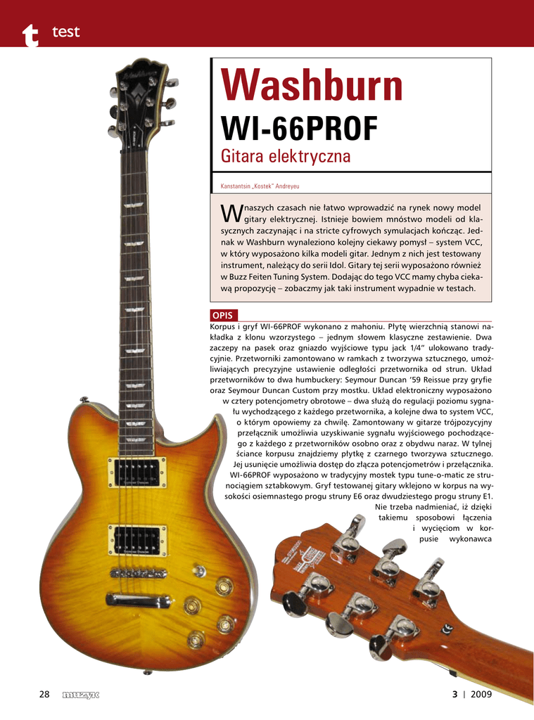 t test Washburn WI-66PROF Gitara elektryczna Kanstantsin „Kostek” Andreyeu W naszych czasach nie łatwo wprowadzić na rynek nowy model gitary elektrycznej. Istnieje bowiem mnóstwo modeli od klasycznych zaczynając i na stricte cyfrowych symulacjach kończąc. Jednak w Washburn wynaleziono kolejny ciekawy pomysł – system VCC, w który wyposażono kilka modeli gitar. Jednym z nich jest testowany instrument, należący do serii Idol. Gitary tej serii wyposażono również w Buzz Feiten Tuning System. Dodając do tego VCC mamy chyba ciekawą propozycję – zobaczmy jak taki instrument wypadnie w testach. OPIS Korpus i gryf WI-66PROF wykonano z mahoniu. Płytę wierzchnią stanowi nakładka z klonu wzorzystego – jednym słowem klasyczne zestawienie. Dwa zaczepy na pasek oraz gniazdo wyjściowe typu jack 1/4” ulokowano tradycyjnie. Przetworniki zamontowano w ramkach z tworzywa sztucznego, umożliwiających precyzyjne ustawienie odległości przetwornika od strun. Układ przetworników to dwa humbuckery: Seymour Duncan ‘59 Reissue przy gryfie oraz Seymour Duncan Custom przy mostku. Układ elektroniczny wyposażono w cztery potencjometry obrotowe – dwa służą do regulacji poziomu sygnału wychodzącego z każdego przetwornika, a kolejne dwa to system VCC, o którym opowiemy za chwilę. Zamontowany w gitarze trójpozycyjny przełącznik umożliwia uzyskiwanie sygnału wyjściowego pochodzącego z każdego z przetworników osobno oraz z obydwu naraz. W tylnej ściance korpusu znajdziemy płytkę z czarnego tworzywa sztucznego. Jej usunięcie umożliwia dostęp do złącza potencjometrów i przełącznika. WI-66PROF wyposażono w tradycyjny mostek typu tune-o-matic ze strunociągiem sztabkowym. Gryf testowanej gitary wklejono w korpus na wysokości osiemnastego progu struny E6 oraz dwudziestego progu struny E1. Nie trzeba nadmieniać, iż dzięki takiemu sposobowi łączenia i wycięciom w korpusie wykonawca 28 3 | 2009 test t umieszczono sześć kluczy olejowych Grover 18:1. Cały osprzęt testowanej gitary jest chromowany. System Buzz Feiten polega na takim ustawieniu mostka i siodełka, które pozwala zmniejszyć niedokładności we współbrzmieniach wynikające z stroju temperowanego. Każdy gitarzysta wie, że niektóre akordy zagrane w odpowiednich przewrotach na gitarze „z natury nie stroją same w sobie”. Liczba takowych przy graniu na testowanej gitarze rzeczywiście znacząco zmniejsza się. System VCC (Voice Contour Control) umożliwia płynne przekształcanie sygnału z takiego który odpowiada przetwornikom typu humbucker, w taki który odpowiada przetwornikom jednocewkowym. Za pomocą dwóch potencjometrów VCC możemy w ten sposób zmieniać sygnał wychodzący z każdego z przetworników osobno. ma łatwy dostęp do wszystkich dwudziestu dwóch progów na każdej ze strun. Gryf jest bardzo wygodny, powierzchnia szyjki stanowi fragment krzywej o promieniu 14”, a szerokość siodełka wynosi 43 mm. Jednak najciekawszą właściwością szyjki jest jej giętkość, która umożliwia uzyskiwanie szlachetnie brzmiącego wibrato poprzez wibrowanie korpusem i szyjką. Dla mniej wprawionych taka właściwość może wydawać się przeszkodą, ponieważ w zależności od pozycji ciała grającego może zmienić się strój instrumentu. Ale warto poświecić trochę uwagi by nauczyć się wykorzystywać tę właściwość testowanej gitary. Podstrunnicę WI-66PROF wykonano z palisandru. Umieszczono w niej dwadzieścia dwa progi, które oznaczono wzorami w kształcie skrzydeł wykonanymi z masy perłowej. Oznaczone są (tak jak w większości modeli gitar) progi o numerach 1, 3, 5, 7, 9, 12, 15, 17, 19 oraz 21. Te same progi oznaczono małymi białymi kropkami w bocznej części podstrunnicy. Główka gryfu została ozdobiona nakładką w kolorze czarnym, na której umieszczono logo producenta. Na jej wierzchniej części tuż przy sio- WRAŻENIA Mimo, że wygląd i estetyka każdego instrumentu to sprawa gustu grającego – jednemu się spodoba innemu nie, to jednak nadmienię, że WI-66PROF jest solidnie zaprojektowanym i starannie wykonanym instrumentem, który… ładnie wygląda (osobista opinia testującego). „Na sucho” gitara brzmi szlachetnie – świadczy to między innymi o wysokiej jakości drewna zastosowanego w instrumencie. Tym najczęściej charakteryzują się amerykańskie gitary (testowany instrument wyprodukowano w Indonezji). Jak już wspomniałem wyżej, szyjka jest bardzo wygodna. Mimo że podstrunnica „manualnie” sprawia wrażenie szerokiej, to w praktyce nie odczuwa się żadnych oporów podczas grania szybkich pasaży solowych, wręcz przeciwnie – powstaje subiektywne wrażenie że instrument „pomaga” inspirując „przypadkowo” wytwarzającym się efektem vibrato powstającym na skutek takiej, a nie innej konstrukcji gitary. Poniżej przedstawiam krótką charakterystykę brzmienia instrumentu. Układ VCC zasługuje na szczegółowe omówienie. Mimo, że przekształcanie brzmienia z „singlowego” w „humbuckerowe” jest płynne, to jednak można wyróżnić w tej płynności trzy etapy: • etap pierwszy – brzmienie humbuckera, • etap drugi – po delikatnym przekręceniu potencjometru najpierw ulegają przekształ- dełku znajdziemy płytkę z czarnego tworzywa sztucznego. Usunięcie jej umożliwia dostęp do śruby regulującej prawidłowe ustawienie gryfu. W górnej części główki 2009 | 3 29 t test Washburn WI-66PROF ceniu tony niskie i uwypukla się pasmo środkowe, • etap trzeci – brzmienie „singlowe”. Prawdziwym okazało się stwierdzenie producenta, że czym (kształt, gatunki drewna) nie przypomina gitar Fender. Tym nie mniej słyszymy wyraźny „twang” właściwy dla gitar z przetwornikami typu single coil. Brzmienie testowanej gitary w tym przypadku nie zmienia się radykalnie – jest naDo testu dostarczył: dal ciepłe, ale Music Info ul. Madalińskiego 11a 30-303 Kraków tel. (012) 267248