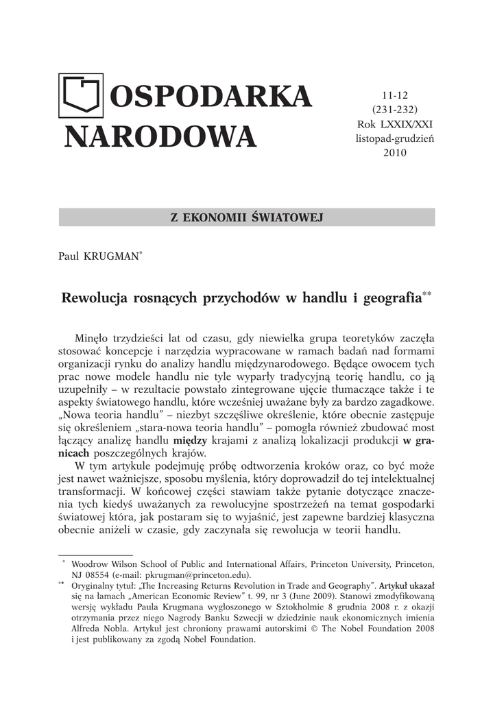 OSPODARKA NARODOWA 11-12 (231-232) Rok LXXIX/XXI listopad-grudzień 2010 Z EKONOMII ŚWIATOWEJ Paul KRUGMAN* Rewolucja rosnących przychodów w handlu i geografia** Minęło trzydzieści lat od czasu, gdy niewielka grupa teoretyków zaczęła stosować koncepcje i narzędzia wypracowane w ramach badań nad formami organizacji rynku do analizy handlu międzynarodowego. Będące owocem tych prac nowe modele handlu nie tyle wyparły tradycyjną teorię handlu, co ją uzupełniły – w rezultacie powstało zintegrowane ujęcie tłumaczące także i te aspekty światowego handlu, które wcześniej uważane były za bardzo zagadkowe. „Nowa teoria handlu” – niezbyt szczęśliwe określenie, które obecnie zastępuje się określeniem „stara-nowa teoria handlu” – pomogła również zbudować most łączący analizę handlu między krajami z analizą lokalizacji produkcji w granicach poszczególnych krajów. W tym artykule podejmuję próbę odtworzenia kroków oraz, co być może jest nawet ważniejsze, sposobu myślenia, który doprowadził do tej intelektualnej transformacji. W końcowej części stawiam także pytanie dotyczące znaczenia tych kiedyś uważanych za rewolucyjne spostrzeżeń na temat gospodarki światowej która, jak postaram się to wyjaśnić, jest zapewne bardziej klasyczna obecnie aniżeli w czasie, gdy zaczynała się rewolucja w teorii handlu. * Woodrow Wilson School of Public and International Affairs, Princeton University, Princeton, NJ 08554 (e-mail: [email protected]). *�* Oryginalny tytuł: „The Increasing Returns Revolution in Trade and Geography”. ��������������� Artykuł ukazał się na łamach „American Economic Review” t. 99, nr 3 (June 2009). Stanowi zmodyfikowaną wersję wykładu Paula Krugmana wygłoszonego w Sztokholmie 8 grudnia 2008 r. z okazji otrzymania przez niego Nagrody Banku Szwecji w dziedzinie nauk ekonomicznych imienia Alfreda Nobla. Artykuł jest chroniony prawami autorskimi © The Nobel Foundation 2008 i jest publikowany za zgodą Nobel Foundation. GOSPODARKA NARODOWA Nr 11-12/2010 Zagadkowe aspekty handlu Pamiętam, że w czasie pierwszego roku pracy na stanowisku asystenta moi koledzy reagowali zdziwieniem słysząc, iż pracuję nad teorią handlu międzynarodowego – pytali, dlaczego u licha chcę się tym zajmować. Jeden z nich stwierdził, że „handel jest przecież monolitycznym obszarem badawczym” i dodał, że „stanowi zamkniętą konstrukcję, w której nie pozostało już nic ciekawego do wyjaśnienia”. Jednakże oznaki niezadowolenia z konwencjonalnej teorii handlu uwidoczniły się zanim pojawiły się nowe modele handlu. Dawniej uważałem rozprzestrzenianie się tego niezadowolenia za przejaw kontrkultury handlowej. Istniała nawet pewnego rodzaju klasyka drugiego obiegu. Myślę tu w szczególności o „An Essay on Trade and Transformation” („Esej o handlu i transformacji”) autorstwa Burenstama [1961], w którym dowodzono, że eksport odzwierciedla zazwyczaj cechy charakterystyczne rynku krajowego. Studenci drugiego stopnia przekazywali sobie ten esej z rąk do rąk, tak jakby to był samizdat zawierający pamflet. Dostępna była również ważna literatura empiryczna na temat handlu wewnątrzgałęziowego, przede wszystkim prace Balassy [1966] oraz Grubela i Lloyda [1975], która domagała się ram teoretycznych. Dlaczego kontrkultura handlowa rozkwitła mimo pozornej kompletności konwencjonalnej teorii handlu? Powód można określić mianem problemu podwójnego podobieństwa: olbrzymie znaczenie w handlu światowym miała wymiana podobnych towarów pomiędzy podobnymi krajami, której egzemplifikację stanowił ogromny dwustronny handel produktami przemysłu samochodowego miedzy Stanami Zjednoczonymi a Kanadą. W 1980 r. tego rodzaju handel wciąż pozostawał stosunkowo nowym zjawiskiem. Handel w pierwszej wielkiej epoce globalizacji – epoce, która stała się możliwa dzięki maszynie parowej oraz telegrafowi – był podwójnie zróżnicowany: zróżnicowanymi produktami handlowały ze sobą zróżnicowane kraje. Przewaga komparatywna, tj. koncepcja, wedle której kraje handlują ze sobą po to, aby wykorzystać przewagę, jaką daje im ich odmienność, dobrze tłumaczyła większość strumieni handlowych. Dopiero wraz z rozwojem handlu po drugiej wojnie światowej, zwłaszcza po zawarciu w latach pięćdziesiątych i sześćdziesiątych XX w. daleko idących porozumień handlowych, na pierwszy plan wysunęły się bardziej zagadkowe wzorce handlu, dając tym samym pożywkę kontrkulturze handlowej. Dane na temat brytyjskiej wymiany handlowej, które przedstawiono na rysunkach 1, 2 i 3, odzwierciedlają opisywaną zmianę. Na rysunku 1 zilustrowana została struktura brytyjskiego eksportu i importu w przededniu pierwszej wojny światowej. Wzorzec handlu idealnie pasował do klasycznej koncepcji przewagi komparatywnej: Wielka Brytania, kraj gęsto zaludniony, obfity w kapitał, ale z niedoborem ziemi, eksportował towary przetworzone, importował zaś surowce. Paul Krugman, Rewolucja rosnących przychodów w handlu i geografia Rysunek 1. Struktura handlu brytyjskiego około 1910 r. 100% 50% 0% Eksport Produkty nieprzetworzone Import Produkty przetworzone Źródło: Baldwin, Martin [1999] Analogiczne dane, opisujące strukturę handlu w roku 1990, nie dają się tak łatwo zinterpretować: Wielka Brytania importowała i eksportowała głównie produkty przetworzone. Można by żywić nadzieję, że analiza sektora przetwórczego odsłoniłaby bardziej wyrazisty wzorzec, ale taka analiza prowadzi nas do handlu wewnątrzgałęziowego: handel produktami przetworzonymi, zwłaszcza między krajami na zbliżonym poziomie rozwoju, obejmuje w znacznym stopniu dwustronną wymianę w obrębie nawet wąskozdefiniowanych kategorii produktów. Odbudowany po drugiej wojnie światowej handel nabrał w o wiele większym stopniu aniżeli w czasach pierwszej globali