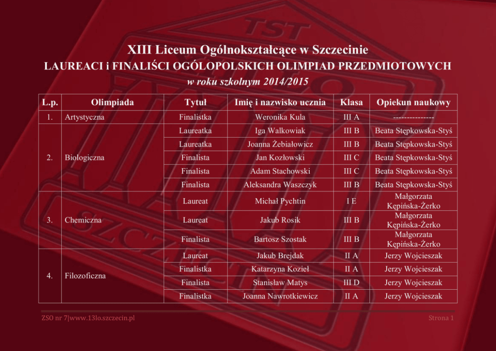 XIII Liceum Ogólnokształcące w Szczecinie LAUREACI i FINALIŚCI OGÓLOPOLSKICH OLIMPIAD PRZEDMIOTOWYCH w roku szkolnym 2014/2015 L.p. 1. 2. 3. 4. Olimpiada Artystyczna Biologiczna Chemiczna Filozoficzna ZSO nr 7|www.13lo.szczecin.pl Tytuł Imię i nazwisko ucznia Klasa Opiekun naukowy Finalistka Weronika Kula III A --------------- Laureatka Iga Walkowiak III B Beata Stępkowska-Styś Laureatka Joanna Żebiałowicz III B Beata Stępkowska-Styś Finalista Jan Kozłowski III C Beata Stępkowska-Styś Finalista Adam Stachowski III C Beata Stępkowska-Styś Finalista Aleksandra Waszczyk III B Laureat Michał Pychtin IE Laureat Jakub Rosik III B Finalista Bartosz Szostak III B Laureat Jakub Brejdak II A Beata Stępkowska-Styś Małgorzata Kępińska-Żerko Małgorzata Kępińska-Żerko Małgorzata Kępińska-Żerko Jerzy Wojcieszak Finalistka Katarzyna Kozieł II A Jerzy Wojcieszak Finalista Stanisław Matys III D Jerzy Wojcieszak Finalistka Joanna Nawrotkiewicz II A Jerzy Wojcieszak Strona 1 5. 6. Fizyczna Geograficzna Finalistka Agata Dudkiewicz III D Marek Golka Finalista Krzysztof Filipiak II D Marek Golka Finalista Adrian Koźluk IE Marek Golka Finalistka Agata Lonc III D Marek Golka Finalistka Kornelia Łukojć III D Marek Golka Finalista Marzec Maksymilian II D Marek Golka Finalista Michorzewski Marcin III D Marek Golka Finalista Poczobut Paweł IE Marek Golka Finalista Roy Sebastian III D Marek Golka Finalista Rugor Piotr III D Marek Golka Finalista Philip Smolenski-Jensen IE Marek Golka Finalista Wojciech Szwarc II D Marek Golka Laureat Krzysztof Mirowski IE Laureat Michał Szkibiel III D Finalista Jakub Czugała II C Tomasz Rydzewski Marlena Duda-Urbańska Tomasz Rydzewski Finalista Kasper Hasior III C Tomasz Rydzewski Finalista Adrian Koźluk IE Tomasz Rydzewski 7. Historyczna Laureat Jakub Młynarski II C Maciej Kopeć 8. Informatyczna Finalista Piotr Haryza III D Czesław Drozdowski ZSO nr 7|www.13lo.szczecin.pl Strona 2 Finalista Krzysztof Małysa IE Czesław Drozdowski Finalista Marcin Michorzewski III D Czesław Drozdowski Finalista Michał Niciejewski IE Czesław Drozdowski Finalista Wojciech Szwarc II D Czesław Drozdowski 9. Języka Angielskiego Laureat Jakub Łabuń III D Jarosław Skowroński 10. Języka NIemieckiego Laureatka Juliana Jakubiec IA Beata Stelter 11. Jezyka Rosyjskiego Finalista Makar Golubkow II C Mariola Grudziak Finalistka Alicja Grochowska II A Finalistka Ilona Jakimowicz II C Finalistka Katarzyna Jarota IA Finalistka Joanna Nawrotkiewicz II A Jerzy Wojcieszak Barbara Sokolińska-Szybowska Barbara Sokolińska-Szybowska Jerzy Wojcieszak Finalista Maksymilian Sitarski III A Jerzy Wojcieszak Finalistka Katarzyna Stankiewicz III A Jerzy Wojcieszak Finalistka Monika Świderska III A Laureat Marek Drozdowski III D Laureat Marcin Michorzewski III D Jerzy Wojcieszak Łukasz Maczan Beata Bogdańska Adam Neugebauer Łukasz Maczan Beata Bogdańska Adam Neugebauer 12. 13. Literatury i Języka Polskiego Matematyczna ZSO nr 7|www.13lo.szczecin.pl Strona 3 14. Wiedzy o Polsce i Świecie Współczesnym ZSO nr 7|www.13lo.szczecin.pl Finalistka Anna Czerwińska III D Finalista Adrian Koźluk IE Finalista Krzysztof Lambrecht II D Finalista Wojciech Mitros IE Finalista Philip Smolenski-Jensen IE Finalista Michał Szkibiel III D Łukasz Maczan Beata Bogdańska Adam Neugebauer Beata Bogdańska Adam Neugebauer Beata Bogdańska Beata Bogdańska Adam Neugebauer Beata Bogdańska Adam Neugebauer Łukasz Maczan Finalistka Diana Trokowska II D Beata Bogdańska Laureat Jakub Brejdak II A Jolanta Konieczna Laureat Karol Gliwny IE Jolanta Konieczna Laureatka Karolina Ośródka III A Jolanta Konieczna Laureat Tymoteusz Roczyński III A Jolanta Konieczna Strona 4 OLIMPIADY TEMATYCZNE L.p. 1. 2. 3. Olimpiada Astronomiczna Lingwistyki Matematycznej Przedsiębiorczości 4. Teologii Katolickiej 5. Wiedzy Ekologicznej 6. Wiedzy Ekonomicznej ZSO nr 7|www.13lo.szczecin.pl Tytuł Imię i nazwisko ucznia Klasa Opiekun naukowy Finalista Bartosz Dzięcioł IE Tomasz Skowron Finalista Radosław Ciuksza III D -------------- Finalistka Anna Czerwińska III D -------------- Finalista Adrian Koźluk IE -------------- Laureat Mikołaj Madej II C Patryk Araszkiewicz Finalista Jakub Łabuń III D Patryk Araszkiewicz Finalista Krzysztof Papliński II D Patryk Araszkiewicz Finalista Mateusz Bodziony IE ks. Grzegorz Adamski Finalista Jakub Drzonek ID ks. Grzegorz Adamski Finalista Tomasz Chady IB Iwona Szafińska Finalistka Laureatka I miejsce Laureat Adriana Turowska IB Iwona Szafińska Zuzanna Kosmala IC Patryk Araszkiewicz Kasper Hasior III D Patryk Araszkiewicz Laureat Jakub Łabuń III D Patryk Araszkiewicz Finalista Bartosz Bassa III D Patryk Araszkiewicz Finalistka Marta Keller III C Patryk Araszkiewicz Strona 5 7. 8. 9. Wiedzy o Bankach Wiedzy Technicznej Wiedzy o Żywieniu i Żywności Finalista Dawid Biernat II C Patryk Araszkiewicz Finalista Kasper Hasior III C Patryk Araszkiewicz Finalista Jakub Łabuń III D Patryk Araszkiewicz Finalista Aleksander Polak II D Patryk Araszkiewicz Laureat Marcin Michorzewski III D Marek Golka Finalistka Anna Czerwińska III D Marek Golka Finalista Bartosz Dzięcioł IE Marek Golka Finalista Paweł Poczobut IE Marek Golka Finalistka Patrycja Drzonek III B Beata Stępkowska-Styś Finalistka Alicja Tabisz III B Beata Stępkowska-Styś OLIMPIADY MIĘDZYNARODOWE Tytuł Imię i nazwisko ucznia L.p. Olimpiada, zawody 1. IV Europejska Olimpiada Matematyczna Dziewcząt Brązowy Medal Anna Czerwińska III D 2. XXV Międzynarodowe Bałtyckie Zawody Matematyczne III miejsce (zespołowo) Marcin Michorzewski III D ZSO nr 7|www.13lo.szczecin.pl Klasa Opiekun naukowy Łukasz Maczan Beata Bogdańska Adam Neugebauer Łukasz Maczan Beata Bogdańska Adam Neugebauer Strona 6