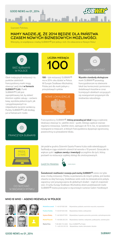 GOOD NEWS no 01_2014 Szanowni Państwo, MAMY NADZIEJĘ, ŻE 2014 BĘDZIE DLA PAŃSTWA CZASEM NOWYCH BIZNESOWYCH MOŻLIWOŚCI. Wierzymy, że współpraca z marką SUBWAY® jest jedną z nich. Do zobaczenia w Nowym Roku! LICZBA MIESIĄCA SIEĆ SUBWAY® W POLSCE Obok tradycyjnych restauracji i tz. punktów satelickich franczyzobiorcy marki mogą otworzyć swój lokal w formacie SUBWAY® Café. Punkt SUBWAY® Café jest zaprojektowany tak, by ułatwić klientom szybkie zakupy – zarówno kawy, wyrobów piekarniczych, jak i przygotowywanych na indywidualne życzenie sandwiczy. Punkty SUBWAY® Café działają już w Katowicach i Łodzi. 100 WARTO WIEDZIEĆ 100 – tyle restauracji SUBWAY® ma w 2014 roku działać w Polsce. W Europie Środkowo-Wschodniej Polska jest dla marki jednym z priorytetowych rynków. NOWE LOKALIZACJE NOWY SĄCZ Wysokie standardy ekologiczne marki SUBWAY® pozwalają franczyzobiorcom na otwieranie lokali bez konieczności poniesienia dodatkowych kosztów w coraz liczniejszych obiektach szczycących się rozwiązaniami przyjaznymi dla środowiska naturalnego. ŁÓDŹ Franczyzobiorcy SUBWAY®, którzy prowadzą już lokal mogą w wybranej lokalizacji otworzyć tz. satellite store – punkt, którego zaplecze stanowi regularna restauracja. Satellite store, zajmujące ok 10 m. kw., to sprawdzone rozwiązanie w miejscach, w których franczyzobiorca dysponuje ograniczoną powierzchnią na prowadzenie lokalu. FRANCZYZA SUBWAY® PISZĄ O NAS Jak podał w grudniu Dziennik Gazeta Prawna liczba osób odwiedzających fastfoody w ciągu ostatnich czterech lat wzrosła o 10 procent. Oznaczało to większe zyski i szybsze zwroty z inwestycji szczególnie dla tych, którzy postawili na restauracje szybkiej obsługi dla zmotoryzowanych. GAZETA PRAWNA CO SŁYCHAĆ W BADANICH RYNKU czytaj więcej Świadomość możliwości rozwoju pod marką SUBWAY® rośnie nie tylko wraz z liczbą restauracji. Polska, w porównaniu do innych rynków, jest bardzo otwarta na ideę franczyzy, Dodatkowo wiele osób ma doświadczenie pobytu zagranicą i jest przyzwyczajona do globalnych działań – stąd ich znajomość sieci. O rynku Europy Środkowo-Wschodniej okiem przedstawicieli marki SUBWAY® można przeczytać w styczniowym numerze Galerii Handlowych WHO IS WHO – AGENCI ROZWOJU W POLSCE GOOD NEWS no 01_2014 Michał Dorszewski T: +48 507 000 508 Województwa: podlaskie, warminsko-mazurskie, mazowieckie Paulina Patelka T:+48 697 829 296 Województwa: łódzkie, wielkopolskie Szymon Mudry T: +48 509 877 970 Województwa: kujawsko-pomorskie, pomorskie, zachodniopomorskie Michał Piasecki T: +48 608 205 210 Województwa: lubelskie, małopolskie, podkarpackie, swietokrzyskie Martin Princ T: 00-800-112-4063 Biuro SUBWAY® w Pradze T: + 420 233 310 135 Województwa: slaskie, dolnoslaskie, lubuskie SUBWAY