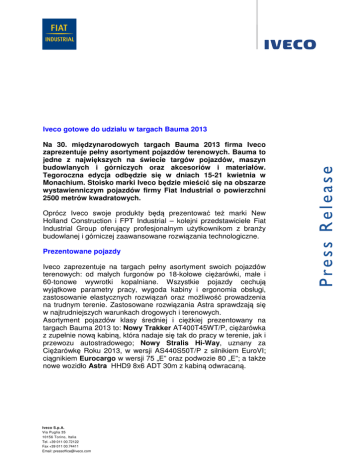 Iveco gotowe do udziału w targach Bauma 2013 Na 30. międzynarodowych targach Bauma 2013 firma Iveco zaprezentuje pełny asortyment pojazdów terenowych. Bauma to jedne z największych na świecie targów pojazdów, maszyn budowlanych i górniczych oraz akcesoriów i materiałów. Tegoroczna edycja odbędzie się w dniach 15-21 kwietnia w Monachium. Stoisko marki Iveco będzie mieścić się na obszarze wystawienniczym pojazdów firmy Fiat Industrial o powierzchni 2500 metrów kwadratowych. Oprócz Iveco swoje produkty będą prezentować też marki New Holland Construction i FPT Industrial – kolejni przedstawiciele Fiat Industrial Group oferujący profesjonalnym użytkownikom z branży budowlanej i górniczej zaawansowane rozwiązania technologiczne. Prezentowane pojazdy Iveco zaprezentuje na targach pełny asortyment swoich pojazdów terenowych: od małych furgonów po 18-kołowe ciężarówki, małe i 60-tonowe wywrotki kopalniane. Wszystkie pojazdy cechują wyjątkowe parametry pracy, wygoda kabiny i ergonomia obsługi, zastosowanie elastycznych rozwiązań oraz możliwość prowadzenia na trudnym terenie. Zastosowane rozwiązania Astra sprawdzają się w najtrudniejszych warunkach drogowych i terenowych. Asortyment pojazdów klasy średniej i ciężkiej prezentowany na targach Bauma 2013 to: Nowy Trakker AT400T45WT/P, ciężarówka z zupełnie nową kabiną, która nadaje się tak do pracy w terenie, jak i przewozu autostradowego; Nowy Stralis Hi-Way, uznany za Ciężarówkę Roku 2013, w wersji AS440S50T/P z silnikiem EuroVI; ciągnikiem Eurocargo w wersji 75 „E” oraz podwozie 80 „E”; a także nowe wozidło Astra HHD9 8x6 ADT 30m z kabiną odwracaną. Iveco S.p.A. Via Puglia 35 10156 Torino, Italia Tel. +39 011 00.72122 Fax +39 011 00.74411 Email: [email protected] W klasie lekkiej pojawi się pojazd Daily w wersji 55S17DW ze skrzynią biegów Sonntag oraz różnymi rozwiązaniami transportowymi, np. osobnymi kontenerami. Technologie w działaniu Wszystkie prezentowane na stoisku pojazdy posiadają silniki opracowane przez FTP Industrial, które charakteryzuje wydajność w zużyciu paliwa i ograniczona emisja spalin. Nowy Trakker i Nowy Stralis Hi-Way są wyposażone w technologię HI-eSCR, która działa bez systemu EGR (recyrkulacji spalin) i ma wiele zalet, jeśli chodzi o pracę w kamieniołomach, gdzie silniki muszą działać w trudnych warunkach i pracować na większych obrotach. Iveco Iveco to spółka grupy Fiat Industrial, która zajmuje się projektowaniem, produkcją i sprzedażą szerokiego asortymentu lekkich, średnich i ciężkich pojazdów użytkowych, ciężarówek terenowych oraz autobusów miejskich i autokarów, a także pojazdów specjalnych używanych w pożarnictwie, sektorze obronnym, obronie cywilnej i pracach w terenie. Iveco zatrudnia niemal 25 000 pracowników na całym świecie. Posiada 11 zakładów produkcyjnych w Europie, Azji, Afryce, Oceanii i Ameryce Południowej, w których produkuje pojazdy wyposażone w najnowocześniejsze funkcje i technologie. Techniczne wsparcie dla pojazdów Iveco na całym świecie gwarantuje 5000 punktów sprzedaży i warsztatów serwisowych zlokalizowanych w 160 krajach. Turyn, 30 stycznia 2013 r.