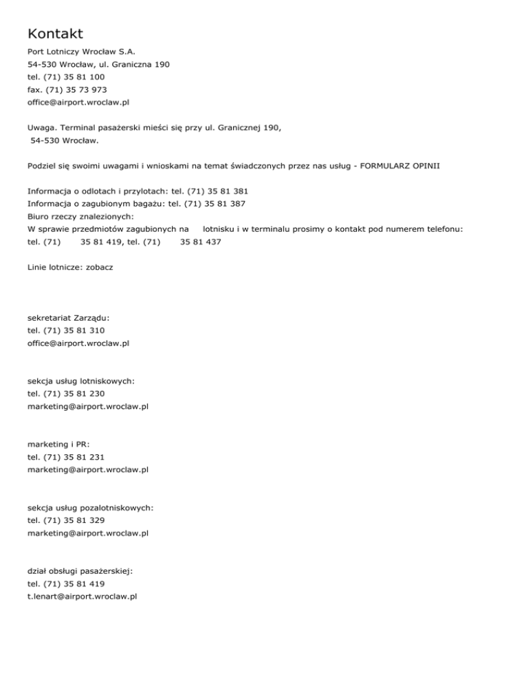 Kontakt Port Lotniczy Wrocław S.A. 54-530 Wrocław, ul. Graniczna 190 tel. (71) 35 81 100 fax. (71) 35 73 973 [email protected] Uwaga. Terminal pasażerski mieści się przy ul. Granicznej 190, 54-530 Wrocław. Podziel się swoimi uwagami i wnioskami na temat świadczonych przez nas usług - FORMULARZ OPINII Informacja o odlotach i przylotach: tel. (71) 35 81 381 Informacja o zagubionym bagażu: tel. (71) 35 81 387 Biuro rzeczy znalezionych: W sprawie przedmiotów zagubionych na tel. (71) 35 81 419, tel. (71) Linie lotnicze: zobacz sekretariat Zarządu: tel. (71) 35 81 310 [email protected] sekcja usług lotniskowych: tel. (71) 35 81 230 [email protected] marketing i PR: tel. (71) 35 81 231 [email protected] sekcja usług pozalotniskowych: tel. (71) 35 81 329 [email protected] dział obsługi pasażerskiej: tel. (71) 35 81 419 [email protected] lotnisku i w terminalu prosimy o kontakt pod numerem telefonu: 35 81 437 dział inwestycji: tel. (71) 35 81 311 [email protected] dział administracyjny: tel. (71) 35 81 317 [email protected] dział utrzymania lotniska: tel. (71) 35 81 331 [email protected] dział informatyczno-energetyczny: tel. (71) 35 81 333 [email protected] safety: tel. (71) 35 81 334 [email protected] security tel. (71) 35 81 444 [email protected] Straż Ochrony Lotniska: tel. (71) 35 81 445 (24h) Straż Graniczna: tel. (71) 35 81 354 (24h) Urząd Celny: tel. (71) 35 81 361, (71) 35 75 979 (24h) Policja: tel. (71) 35 81 240 Kontakt dla Biznesu