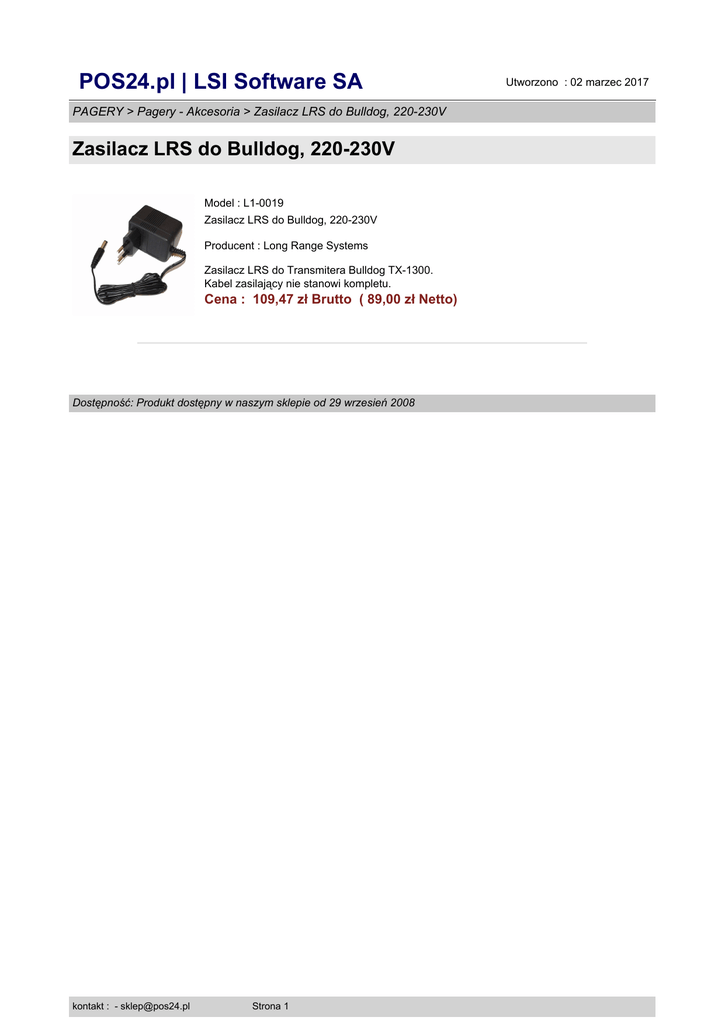 POS24.pl | LSI Software SA PAGERY > Pagery - Akcesoria > Zasilacz LRS do Bulldog, 220-230V Zasilacz LRS do Bulldog, 220-230V Model : L1-0019 Zasilacz LRS do Bulldog, 220-230V Producent : Long Range Systems Zasilacz LRS do Transmitera Bulldog TX-1300. Kabel zasilający nie stanowi kompletu. Cena : 109,47 zł Brutto ( 89,00 zł Netto) Dostępność: Produkt dostępny w naszym sklepie od 29 wrzesień 2008 kontakt : - [email protected] Strona 1 Utworzono : 02 marzec 2017