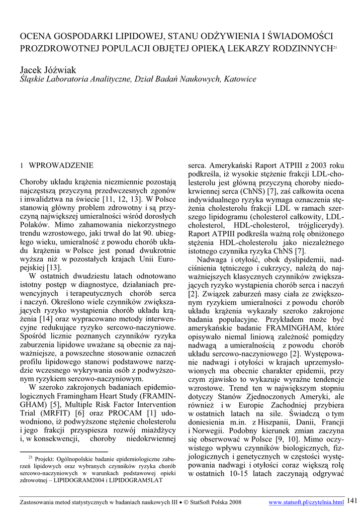 OCENA GOSPODARKI LIPIDOWEJ, STANU ODŻYWIENIA I ŚWIADOMOŚCI PROZDROWOTNEJ POPULACJI OBJĘTEJ OPIEKĄ LEKARZY RODZINNYCH21 Jacek Jóźwiak Śląskie Laboratoria Analityczne, Dział Badań Naukowych, Katowice 1 WPROWADZENIE Choroby układu krążenia niezmiennie pozostają najczęstszą przyczyną przedwczesnych zgonów i inwalidztwa na świecie [11, 12, 13]. W Polsce stanowią główny problem zdrowotny i są przyczyną największej umieralności wśród dorosłych Polaków. Mimo zahamowania niekorzystnego trendu wzrostowego, jaki trwał do lat 90. ubiegłego wieku, umieralność z powodu chorób układu krążenia w Polsce jest ponad dwukrotnie wyższa niż w pozostałych krajach Unii Europejskiej [13]. W ostatnich dwudziestu latach odnotowano istotny postęp w diagnostyce, działaniach prewencyjnych i terapeutycznych chorób serca i naczyń. Określono wiele czynników zwiększających ryzyko wystąpienia chorób układu krążenia [14] oraz wypracowano metody interwencyjne redukujące ryzyko sercowo-naczyniowe. Spośród licznie poznanych czynników ryzyka zaburzenia lipidowe uważane są obecnie za najważniejsze, a powszechne stosowanie oznaczeń profilu lipidowego stanowi podstawowe narzędzie wczesnego wykrywania osób z podwyższonym ryzykiem sercowo-naczyniowym. W szeroko zakrojonych badaniach epidemiologicznych Framingham Heart Study (FRAMINGHAM) [5], Multiple Risk Factor Intervention Trial (MRFIT) [6] oraz PROCAM [1] udowodniono, iż podwyższone stężenie cholesterolu i jego frakcji przyspiesza rozwój miażdżycy i, w konsekwencji, choroby niedokrwiennej 21 Projekt: Ogólnopolskie badanie epidemiologiczne zaburzeń lipidowych oraz wybranych czynników ryzyka chorób sercowo-naczyniowych w warunkach podstawowej opieki zdrowotnej – LIPIDOGRAM2004 i LIPIDOGRAM5LAT serca. Amerykański Raport ATPIII z 2003 roku podkreśla, iż wysokie stężenie frakcji LDL-cholesterolu jest główną przyczyną choroby niedokrwiennej serca (ChNS) [7], zaś całkowita ocena indywidualnego ryzyka wymaga oznaczenia stężenia cholesterolu frakcji LDL w ramach szerszego lipidogramu (cholesterol całkowity, LDLcholesterol, HDL-cholesterol, trójglicerydy). Raport ATPIII podkreśla ważną rolę obniżonego stężenia HDL-cholesterolu jako niezależnego istotnego czynnika ryzyka ChNS [7]. Nadwaga i otyłość, obok dyslipidemii, nadciśnienia tętniczego i cukrzycy, należą do najważniejszych klasycznych czynników zwiększających ryzyko wystąpienia chorób serca i naczyń [2]. Związek zaburzeń masy ciała ze zwiększonym ryzykiem umieralności z powodu chorób układu krążenia wykazały szeroko zakrojone badania populacyjne. Przykładem może być amerykańskie badanie FRAMINGHAM, które opisywało niemal liniową zależność pomiędzy nadwagą a umieralnością z powodu chorób układu sercowo-naczyniowego [2]. Występowanie nadwagi i otyłości w krajach uprzemysłowionych ma obecnie charakter epidemii, przy czym zjawisko to wykazuje wyraźne tendencje wzrostowe. Trend ten w największym stopniu dotyczy Stanów Zjednoczonych Ameryki, ale również i w Europie Zachodniej przybiera w ostatnich latach na sile. Świadczą o tym doniesienia m.in. z Hiszpanii, Danii, Francji i Norwegii. Podobny kierunek zmian zaczyna się obserwować w Polsce [9, 10]. Mimo oczywistego wpływu czynników biologicznych, fizjologicznych i genetycznych w częstości występowania nadwagi i otyłości coraz większą rolę w ostatnich 10-15 latach zaczynają odgrywać Zastosowania metod statystycznych w badaniach naukowych III • StatSoft Polska 2008 www.statsoft.pl/czytelnia.html 141 Ocena gospodarki lipidowej, stanu odżywienia i świadomości prozdrowotnej populacji objętej opieką lekarzy rodzinnych czynniki środowiskowe. Można do nich zaliczyć niekorzystne nawyki żywieniowe związane ze zwiększeniem spożycia pokarmów wysokoenergetycznych (posiłki typu fast food, słodzone napoje gazowane) i zmianą rytmu odżywiania (późne posiłki łączące obiad i kolację), zmniejszenie aktywności fizycznej, zmniejszenie wymiaru pracy fizycznej na rzecz pracy z ograniczeniem ruchu. W okresie ostatnich 20 lat przeprowadzono w Polsce kilka badań epidemiologicznych, dotyczących czynników ryzyka chorób serca. Skalę zagrożeń chorobami serca i naczyń, opisaną na podstawie wyników badań: Pol-MONICA [8] i Pol-MONICA Bis [9], SPES [10] i NATPOL PLUS [15] można jednak różnie interpretować, gdyż w obserwacjach tych ograniczano się bądź do wybranych regionów (Pol-MONICA, Pol-MONICA Bis, SPES), bądź też badanie przeprowadzano na dużym obszarze z udziałem mniej licznej populacji (NATPOL PLUS). Dotychczas nie publikowano polskich badań dotyczących zaburzeń gospodarki lipidowej, stanu odżywiania oraz stanu świadomości prozdrowotnej, realizowanych wśród pacjentów lekarzy rodzinnych, przeprowadzonych na dużej populacji z podziałem epidemiologicznym na regiony (województwa). W związku z powyższym zespół naukowy z udziałem prof. dr. hab. med. Witolda Lukasa w 2003 roku dokonał pomiarów pełnego lipidogramu u 15 534 pacjentów ze 198 ośrodków Podstawowej Opieki Zdrowotnej z terenu 8 województw południowej i zachodniej Polski [3, 4]. W powyższym pilotażowym badaniu, nazwanym LIPIDOGRAM2003, odsetek osób z podwyższonym poziomem cholesterolu całkowitego wyniósł 72%, natomiast stężenie LDL-cholesterolu przekraczało normę jedynie u 28% badanych. Odmienne były także odsetki osób ze stężeniem HDL-cholesterolu poniżej dopuszczalnej normy (6%) oraz osób, u których stwierdzono podwyższone stężenie trójglicerydów (22%). Dodatkowo wyniki badania LIPIDOGRAM2003 wskazywały na niezwykle wysoki odsetek występowania nadwagi i otyłości wśród badanych osób, przy czym zaburzenia w lipidogramie dotyczyły bardzo często osób z prawidłową masą ciała. Zaobserwowano, iż jedynie stężenia HDL-cholesterolu i trójglicerydów zależały w sposób proporcjonalny od masy c