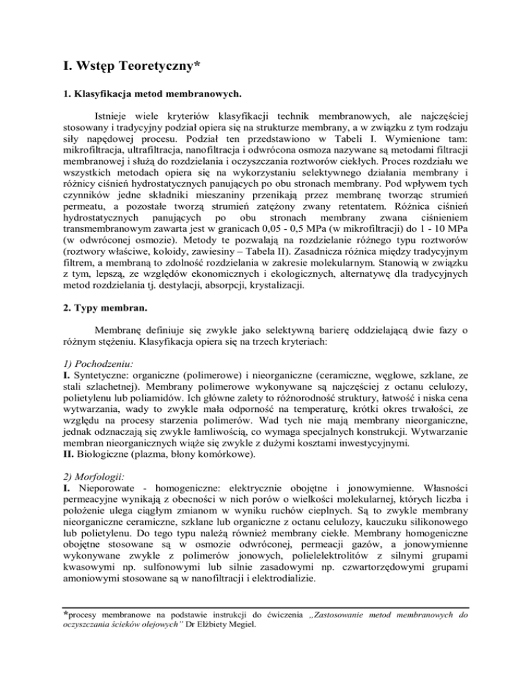 I. Wstęp Teoretyczny* 1. Klasyfikacja metod membranowych. Istnieje wiele kryteriów klasyfikacji technik membranowych, ale najczęściej stosowany i tradycyjny podział opiera się na strukturze membrany, a w związku z tym rodzaju siły napędowej procesu. Podział ten przedstawiono w Tabeli I. Wymienione tam: mikrofiltracja, ultrafiltracja, nanofiltracja i odwrócona osmoza nazywane są metodami filtracji membranowej i służą do rozdzielania i oczyszczania roztworów ciekłych. Proces rozdziału we wszystkich metodach opiera się na wykorzystaniu selektywnego działania membrany i różnicy ciśnień hydrostatycznych panujących po obu stronach membrany. Pod wpływem tych czynników jedne składniki mieszaniny przenikają przez membranę tworząc strumień permeatu, a pozostałe tworzą strumień zatężony zwany retentatem. Różnica ciśnień hydrostatycznych panujących po obu stronach membrany zwana ciśnieniem transmembranowym zawarta jest w granicach 0,05 - 0,5 MPa (w mikrofiltracji) do 1 - 10 MPa (w odwróconej osmozie). Metody te pozwalają na rozdzielanie różnego typu roztworów (roztwory właściwe, koloidy, zawiesiny – Tabela II). Zasadnicza różnica między tradycyjnym filtrem, a membraną to zdolność rozdzielania w zakresie molekularnym. Stanowią w związku z tym, lepszą, ze względów ekonomicznych i ekologicznych, alternatywę dla tradycyjnych metod rozdzielania tj. destylacji, absorpcji, krystalizacji. 2. Typy membran. Membranę definiuje się zwykle jako selektywną barierę oddzielającą dwie fazy o różnym stężeniu. Klasyfikacja opiera się na trzech kryteriach: 1) Pochodzeniu: I. Syntetyczne: organiczne (polimerowe) i nieorganiczne (ceramiczne, węglowe, szklane, ze stali szlachetnej). Membrany polimerowe wykonywane są najczęściej z octanu celulozy, polietylenu lub poliamidów. Ich główne zalety to różnorodność struktury, łatwość i niska cena wytwarzania, wady to zwykle mała odporność na temperaturę, krótki okres trwałości, ze względu na procesy starzenia polimerów. Wad tych nie mają membrany nieorganiczne, jednak odznaczają się zwykle łamliwością, co wymaga specjalnych konstrukcji. Wytwarzanie membran nieorganicznych wiąże się zwykle z dużymi kosztami inwestycyjnymi. II. Biologiczne (plazma, błony komórkowe). 2) Morfologii: I. Nieporowate - homogeniczne: elektrycznie obojętne i jonowymienne. Własności permeacyjne wynikają z obecności w nich porów o wielkości molekularnej, których liczba i położenie ulega ciągłym zmianom w wyniku ruchów cieplnych. Są to zwykle membrany nieorganiczne ceramiczne, szklane lub organiczne z octanu celulozy, kauczuku silikonowego lub polietylenu. Do tego typu należą również membrany ciekłe. Membrany homogeniczne obojętne stosowane są w osmozie odwróconej, permeacji gazów, a jonowymienne wykonywane zwykle z polimerów jonowych, polielelektrolitów z silnymi grupami kwasowymi np. sulfonowymi lub silnie zasadowymi np. czwartorzędowymi grupami amoniowymi stosowane są w nanofiltracji i elektrodializie. *procesy membranowe na podstawie instrukcji do ćwiczenia „Zastosowanie metod membranowych do oczyszczania ścieków olejowych” Dr Elżbiety Megiel. II. Porowate o szerokim zakresie wielkości porów stosowane w ultra- i mikrofiltracji. 3) strukturze: I. Symetryczne o strukturze jednorodnej. II. Asymetryczne o strukturze uwarstwionej (warstwa zewnętrzna o grubości 0.1 - 0.5 μm będąca właściwą warstwą permeacyjną, wewnętrzna o znacznie większej porowatości przejmująca obciążenia mechaniczne o grubości 150 - 300 μm). Wśród nich wyróżniamy: membrany uzyskiwane metodą inwersji faz wykonane z jednej substancji oraz kompozytowe wykonane z dwóch różnych substancji otrzymywane przez nakładanie warstw. Metoda inwersji faz polega na sporządzeniu homogenicznego roztworu polimeru, naniesienie go na odpowiednie podłoże w postaci cienkiego filmu, odparowaniu części rozpuszczalnika przez co następuje wytrącenie polimeru, a następnie jego wygrzewaniu. Do membran niesymetrycznych zalicza się również membrany dynamiczne złożone z nośnej przegrody i naniesionej na nią substancji zwanej pomocą filtracyjną, dodawanej do nadawy. Membrany asymetryczne stosuje się przede wszystkim w nanofiltracji i odwróconej osmozie. Tabela I. Techniki separacji membranoweja. a Membrany i membranowe techniki rozdziału – Praca zbiorowa pod redakcją Anny Narębskiej. Toruń 1997. Tabela I. cd. Techniki separacji membranoweja. a Membrany i membranowe techniki rozdziału – Praca zbiorowa pod redakcją Anny Narębskiej. Toruń 1997. Tabela II. Wielkości i masy molowe związków separowanych technikami membranowymib. b Membrany i membranowe techniki rozdziału – Praca zbiorowa pod redakcją Anny Narębskiej, Toruń 1997. 3. Typy modułów membranowych. I. Płytowe – sąsiednie membrany rozdzielane są arkuszami z materiału porowatego, pełniącego funkcję ochronną dla membrany umożliwiając przepływ permeatu. II. Spiralne – rozdzielone materiałem porowatym membrany nawinięte są współosiowo na rurkę o niedużej średnicy. III. Rurowe – membrana nawinięta na rurkę o małej średnicy. IV. Kapilarne – połączone ze sobą wiele mikrorurek wykonanych z membrany. Charakteryzują się dużą wytrzymałością mechaniczną a stosowane są głównie w dializie. We wszystkich przedstawionych typach modułów można zastosować jeden z czterech podstawowych wariantów prowadzenia strumieni – Rys.1. 4. Mechanizm filtracji membranowej roztworów. Model dyfuzyjny. Przyjmuje się, że membrana jest quasi - homogeniczna, dzięki czemu można stosować do niej teorie roztworów. Proces transportu przez membranę można przybliżyć procesem rozpuszczania w membranie. Podlega więc prawom dyfuzji molekularnej. Siłą napędową procesu jest lokalny gradient potencjału chemicznego wynikający z różnic w stężeniach składnika mieszaniny i różnic ciś