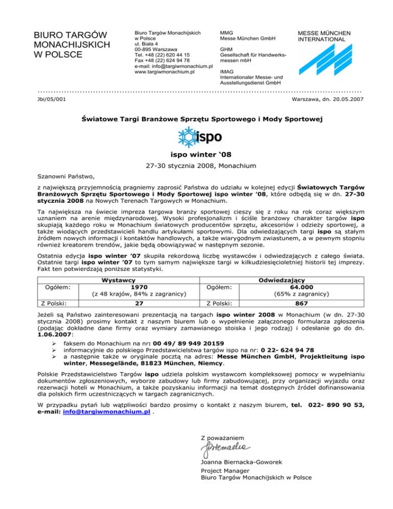 BIURO TARGÓW MONACHIJSKICH W POLSCE Biuro Targów Monachijskich w Polsce ul. Biała 4 00-895 Warszawa Tel. +48 (22) 620 44 15 Fax +48 (22) 624 94 78 e-mail: [email protected] www.targiwmonachium.pl MMG Messe München GmbH MESSE MÜNCHEN INTERNATIONAL GHM Gesellschaft für Handwerksmessen mbH IMAG Internationaler Messe- und Ausstellungsdienst GmbH …………………………………………………………………………………………………………… Jbi/05/001 Warszawa, dn. 20.05.2007 Światowe Targi Branżowe Sprzętu Sportowego i Mody Sportowej ispo winter ‘08 27-30 stycznia 2008, Monachium Szanowni Państwo, z największą przyjemnością pragniemy zaprosić Państwa do udziału w kolejnej edycji Światowych Targów Branżowych Sprzętu Sportowego i Mody Sportowej ispo winter ’08, które odbędą się w dn. 27-30 stycznia 2008 na Nowych Terenach Targowych w Monachium. Ta największa na świecie impreza targowa branży sportowej cieszy się z roku na rok coraz większym uznaniem na arenie międzynarodowej. Wysoki profesjonalizm i ściśle branżowy charakter targów ispo skupiają każdego roku w Monachium światowych producentów sprzętu, akcesoriów i odzieży sportowej, a także wiodących przedstawicieli handlu artykułami sportowymi. Dla odwiedzających targi ispo są stałym źródłem nowych informacji i kontaktów handlowych, a także wiarygodnym zwiastunem, a w pewnym stopniu również kreatorem trendów, jakie będą obowiązywać w następnym sezonie. Ostatnia edycja ispo winter ’07 skupiła rekordową liczbę wystawców i odwiedzających z całego świata. Ostatnie targi ispo winter ’07 to tym samym największe targi w kilkudziesięcioletniej historii tej imprezy. Fakt ten potwierdzają poniższe statystyki. Ogółem: Z Polski: Wystawcy 1970 (z 48 krajów, 84% z zagranicy) Ogółem: 27 Z Polski: Odwiedzający 64.000 (65% z zagranicy) 867 Jeżeli są Państwo zainteresowani prezentacją na targach ispo winter 2008 w Monachium (w dn. 27-30 stycznia 2008) prosimy kontakt z naszym biurem lub o wypełnienie załączonego formularza zgłoszenia (podając dokładne dane firmy oraz wymiary zamawianego stoiska i jego rodzaj) i odesłanie go do dn. 1.06.2007: ¾ ¾ ¾ faksem do Monachium na nr: 00 49/ 89 949 20159 informacyjnie do polskiego Przedstawicielstwa targów ispo na nr: 0 22- 624 94 78 a następnie także w oryginale pocztą na adres: Messe München GmbH, Projektleitung ispo winter, Messegelände, 81823 München, Niemcy. Polskie Przedstawicielstwo Targów ispo udziela polskim wystawcom kompleksowej pomocy w wypełnianiu dokumentów zgłoszeniowych, wyborze zabudowy lub firmy zabudowującej, przy organizacji wyjazdu oraz rezerwacji hoteli w Monachium, a także pozyskaniu informacji na temat dostępnych źródeł dofinansowania dla polskich firm uczestniczących w targach zagranicznych. W przypadku pytań lub wątpliwości bardzo prosimy o kontakt z naszym biurem, tel. e-mail: [email protected] . 022- 890 90 53, Z poważaniem Joanna Biernacka-Goworek Project Manager Biuro Targów Monachijskich w Polsce Poniżej znajdą Państwo najistotniejsze informacje o imprezie oraz ofertę na udział w targach ispo winter 2008: Obszary tematyczne (ispo_communities), w ramach których wystawcy targów ispo winter ’08 mogą zaprezentować swoją ofertę board_ispo: sprzęt, obuwie i odzież snowboard’owa, skateboarding’owa; fitness_ispo/wellness_ispo: akcesoria/ odzież fitnessowa/ nordic fitness/ wellness, sprzęt treningowy, wyposażenie klubów fitness i ośrodków wellness; football_ispo: sprzęt, obuwie i odzież piłkarska; outdoor_ispo: sprzęt, akcesoria, odzież i obuwie outdoorowe; racket_ispo: sprzęt i odzież do tenisa ziemnego, stołowego, squash’a i badmindtona; runnig/nordic_ispo: odzież, obuwie i akcesoria do joggingu, walkingu, nordic -walkingu; ski_ispo: sprzęt, odzież oraz akcesoria narciarskie; sportstyle_ispo: odzież i obuwie sportowe dla wszystkich dyscyplin, odzież inspirowana sportem; teamsports_ispo: sprzęt i odzież sportowa do gier zespołowych; textrends_ispo: tkaniny używane do produkcji odzieży sportowej; triathlon_ispo: sprzęt, odzież i akcesoria stosowane w 3 dyscyplinach triatlonowych Więcej informacji na temat targów ispo winter znajdą Państwo na stronie www.ispo-winter.com (także w polskiej wersji językowej ) CENY POWIERZCHNI WYSTAWIENNICZEJ NETTO* -stoisko -stoisko -stoisko -stoisko szeregowe narożne czołowe** blokowe (wyspowe)** 133 139 144 147 EUR/m2 EUR/m2 EUR/m2 EUR/m2 (stoisko (stoisko (stoisko (stoisko z z z z jednej strony otwarte) dwóch stron otwarte) trzech stron otwarte) czterech stron otwarte) *Do powyższych cen należy doliczyć 19 % VAT (VAT obowiązujący na terenie Niemiec). Powyższe ceny nie obejmują kosztów zabudowy stoiska, a jedynie samą powierzchnię wystawienniczą. ** Stoiska czołowe i wyspowe dostępne są jedynie w przypadku wynajmu większych powierzchni wystawienniczych, powyżej 60 m2. Uwaga: Minimalna powierzchnia stoiska wymagana przez organizatora: 16 m2 Uwaga: Oficjalny termin nadsyłania zgłoszeń do Monachium upływa dn. 15.08.2007. Organizator będzie przyjmował zgłoszenia, aż do wyczerpania się wolnej powierzchni. DODATKOWE KOSZTY – USŁUGI OBOWIĄZKOWE DLA KAŻDEGO WYSTAWCY ¾ opłata zgłoszeniowa w wysokości 115 EUR netto od każdego wystawcy lub podwystawcy ¾ podstawowy wpis do katalogu wystawców – 169 EUR netto; obejmuje wpis w indeksie alfabetycznym wystawców (3 linijki) oraz w indeksie produktów (1 linijka) + wpis do internetowego katalogu wystawców na stronie www.ispo.com + wpis do elektronicznego systemu informacji dla odwiedzających na targach ¾ przedpłata za podłączenie elektryczności oraz zużycie prądu lub inne usługi zamawiane u organizatora 15 EUR netto /m2 (przedpłata pobierana przed targami wraz z należnością za powierzchnię wystawienniczą, rozliczana po targach na podstawie faktury końcowej i w oparciu o faktycz