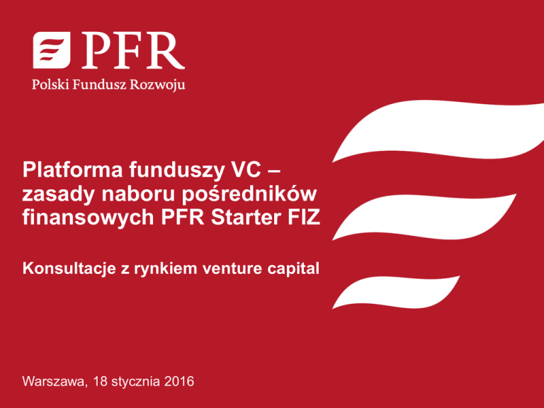 Platforma funduszy VC – zasady naboru pośredników finansowych PFR Starter FIZ Konsultacje z rynkiem venture capital Warszawa, 18 stycznia 2016 Platforma funduszy VC PFR Ventures PFR Starter FIZ Fundusze w ramach PFR Ventures PFR Ventures obecnie wdraża 4 fundusze dedykowane innowacyjnym MŚP na zróżnicowanych etapach rozwoju, zaczynając od najwcześniejszej fazy (pre-seed), fazy zalążkowej (seed), pierwszych wdrożeń (early stage) oraz fazy wzrostu i ekspansji • środki do dyspozycji: 782 mln zł PFR Starter FIZ pre-seed, seed • wejścia kapitałowe przeciętnie od 200 tys. do 3 mln PLN • finansowanie zwrotne poprzez pośredników finansowych (fundusze VC) • środki do dyspozycji: 258 mln zł PFR Biznest FIZ seed, start up • wejścia kapitałowe od 200 tys. do 4 mln PLN • finansowanie zwrotne poprzez grupy aniołów biznesu PFR Otwarte Innowacje FIZ PFR KOFFI FIZ • środki do dyspozycji: 421 mln zł early stage, wzrost • wejścia kapitałowe od 5 mln do 15 mln PLN • finansowanie zwrotne poprzez pośredników finansowych (fundusze VC) wzrost i ekspansja • środki do dyspozycji: 324 mln zł • wejścia kapitałowe od 2,5 mln do 15 mln PLN • finansowanie zwrotne poprzez pośredników finansowych (fundusze VC) • środki do dyspozycji: 433 mln PLN / 100 mln EUR BRIdge CVC runda inwestycyjna • wartość inwestycji od 10 mln PLN do 15 mln PLN A/ B • 50% BRIdge CVC / 50% środki prywatne • finansowanie zwrotne poprzez pośredników finansowych (fundusze CVC) 3 PFR Starter FIZ Środki do dyspozycji Typ funduszu Profil funduszu 782 mln zł Fundusz funduszy Finansowanie poprzez pośredników finansowych (fundusze VC) innowacyjnych MŚP na najwcześniejszych etapach rozwoju (etap preinkubacji, inkubacji i startu) Wielkość inwestycji Przeciętna wartość inwestycji w spółkę od 200 tys. do 3 mln PLN Maks. 80% PFR Starter FIZ / min. 20% środki prywatne Okres inwestycyjny Inwestycje w fundusze 2017-2020 Inwestycje w MŚP 2017-2023 Proces Inwestycyjny Otwarty proces selekcji firm inwestycyjnych, realizowany przez PFR Ventures 4 PFR Starter FIZ – podstawowe założenia instrumentu (1/2) PFR Starter FIZ jest skierowany jako wsparcie dla startupów, udzielane przez pośredników finansowych, którzy dzięki swojemu doświadczeniu, kompetencjom i kontaktom dostarczają finansowanym spółkom tzw. smart money, zwiększając znacząco szanse na komercyjny sukces tych spółek. Cele inwestycyjne Starter FIZ zwiększenie finansowania innowacyjnej działalności MŚP zwiększenie skali działalności przedsiębiorstw wsparcie przedsiębiorstw na najwcześniejszych etapach rozwoju 5 PFR Starter FIZ – podstawowe założenia instrumentu (2/2) Środki do dyspozycji Typ funduszu Profil funduszu 782 mln zł Fundusz funduszy Finansowanie zwrotne przez pośredników finansowych (fundusze VC) innowacyjnych MŚP na najwcześniejszych etapach rozwoju (etap preinkubacji, inkubacji i startu) Wielkość inwestycji Przeciętna wartość inwestycji w spółkę ok. 500 tys. zł max 80% PFR Starter FIZ / min 20% środki prywatne Okres inwestycyjny Inwestycje w fundusze 2017-2020 Inwestycje w spółki 2017-2023 Proces Inwestycyjny Otwarty proces selekcji firm inwestycyjnych, realizowany przez PFR Ventures 6 Harmonogram naboru i wyboru ofert na pośredników finansowych w ramach funduszu PFR Starter FIZ 30 stycznia 2017 r. 30 grudnia 2016 r. Ogłoszenie zasad naboru FAQ 30 stycznia – 28 lutego 2017 r. Finalna dokumentacja Nabór 30dniowy wraz z wersjami edytowalnymi załączników (poprzez formularz online) od marca 2017 r. (min. 2 miesiące) Ocena formalna ofert Ocena merytoryczna ofert, w tym due diligence Rozpoczęcie naboru kwiecień/ maj 2017 r. Publikacja listy wyników od maja 2017 r. Negocjacje umów inwestycyjnych do końca 2Q’2017 r. Podpisanie umów inwestycyjnych Rozpoczęcie wypłat do pośredników / pierwsze inwestycje w MŚP 7 Podstawowe założenia kryteriów merytorycznych wyboru – ocena wniosków w drodze porównywania ofert Kluczowe obszary oceny merytorycznej Pośredników Finansowych Doświadczenie zespołu oraz dotychczasowa działalność Oferenta: • Profile oraz doświadczenie kluczowych członków zespołu Oferenta, • Dotychczasowa działalność inwestycyjna Oferenta oraz/lub opis doświadczenia w zakresie zarządzania oraz rozwijania przedsiębiorstw. Polityka Inwestycyjna – koncepcja funkcjonowania Oferenta: • Opis założeń polityki inwestycyjnej, w tym w szczególności: profil inwestycyjny, deal flow, proces inwestycyjny, podstawowe warunki umów inwestycyjnych z MŚP, plan budowania wartości inwestycji (smart money), polityka wyjść z inwestycji (exit), • Preferencje w zakresie podziału nadwyżki z wyjść z inwestycji (asymetria zysku, carried interest), • Harmonogram realizacji polityki inwestycyjnej. Potencjał w kontekście efektywnej rozbudowy portfolio Pośrednika Finansowego • Lista potencjalnych projektów inwestycyjnych we wczesnej fazie rozwoju (runda seed), • Zdolność do realizacji projektu - wielkość i struktura zespołu, zasady zarządzania i komunikacji. 8 Hierarchia istotności podstawowych kryteriów merytorycznych A. Kluczowy zespół: • Doświadczenie i kwalifikacje kluczowych członków zespołu w zakresie inwestycyjnym, przedsiębiorczym, biznesowym/finansowym, • Ocenie będą podlegały przede wszystkim osoby zaangażowane w działalność Oferenta w minimum 35 godzin tygodniowo, • Kluczowy zespół zadeklaruje łącznie minimum 1% wkładu własnego w ramach wymaganych środków prywatnych. B. Polityka Inwestycyjna: • Realność i efektywność Budżetu Inwestycyjnego i Budżetu Operacyjnego (np. tempo wydatkowania środków, horyzont inwestycyjny i okres rozliczeniowy), w tym w kontekście z założeniami polityki inwestycyjnej i doświadczeniem kluczowego zespołu, • Deklarowany poziom Carried Interest oraz preferencji Inwestorów Prywatnych w zakresie udziału w zysku Pośrednika Finan