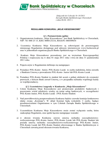 Załącznik do Uchwały Nr 18/2011 Zarządu Banku Spółdzielczego Chorzelach z dnia 06.04. 2011 r. REGULAMIN KONKURSU „MOJE KIESZONKOWE” § 1. Postanowienia ogólne 1. Organizatorem konkursu „Moje Kieszonkowe” jest Bank Spółdzielczy w Chorzelach, NIP: 761 000 25 15, KRS: 0000125216, REGON: 000509034 2. Uczestnicy Konkursu Moje Kieszonkowe są zobowiązani do przestrzegania niniejszego Regulaminu dostępnego pod adresem internetowym www.bschorzele.pl oraz w jednostkach organizacyjnych Banku Spółdzielczego w Chorzelach. 3. Konkurs Moje Kieszonkowe prowadzony jest na terytorium Rzeczypospolitej Polskiej i rozpoczyna się w dniu 01 maja 2011 roku i trwa do dnia 31 października 2011 roku. 4. Pojęcia użyte w Regulaminie definiuje się następująco: a) Posiadacz POL-Konto Junior, POL-Konto Luzak to osoba małoletnia, która zawarła z Bankiem Umowę o prowadzenie POL-Konto Junior lub POL-Konto Luzak , b) Posiadacz POL-Konto Student to student lub uczeń o pełnej zdolności do czynności prawnych, z którym Bank zawarł Umowę, a w przypadku rachunku wspólnego każdy ze współposiadaczy. § 2. Uczestnictwo i nagrody w Konkursie „Moje Kieszonkowe” 1. Celem Konkursu Moje Kieszonkowe jest promowanie produktów bankowych i poszerzanie wśród młodzieży wiedzy na temat usług bankowych, w szczególności POL-Konto Junior, POL-Konto Luzak i POL-Konto Student. 2. Nad prawidłowością przeprowadzenia Konkursu będzie czuwała komisja konkursowa (dalej zwana „Komisją”). W skład Komisji będą wchodziły 3 osoby, będące przedstawicielami Organizatora w tym Członek Zarządu Banku Spółdzielczego w Chorzelach. 3. Uczestnikiem Konkursu Moje Kieszonkowe może zostać wyłącznie osoba, która zaakceptuje Regulamin, oraz spełni łącznie następujące warunki: a) w okresie trwania Konkursu zawrze umowę rachunku oszczędnościoworozliczeniowego POL-Konto Junior, POL-Konto Luzak lub POL-Konto Student lub posiada umowę rachunku oszczędnościowo-rozliczeniowego POL-Konto Junior, POL-Konto Luzak lub POL-Konto Student oferowanego w Banku Spółdzielczym w Chorzelach zawartą przed okresem trwania Konkursu, b) odpowie na pytanie konkursowe, bądź stworzy hasło reklamowe określone dla danego miesiąca i prześle je na podany poniżej adres e-mailowy, podając 11 ostatnich cyfr rachunku POL-Konto Junior, POL-Konto Luzak lub POL-Konto Student w celu identyfikacji. 4. Posiadacz POL-Konto Junior, POL-Konto Luzak lub POL-Konto Student biorący udział w Konkursie „Moje Kieszonkowe” może mieć wyłącznie jeden wyżej wymienionych rachuneków. 5. Posiadacz POL-Konto Junior, POL-Konto Luzak lub POL-Konto Student może brać udział w Konkursie „Moje Kieszonkowe” więcej niż jeden raz. 6. Zadaniem Uczestnika jest udzielenie odpowiedzi na pytanie konkursowe lub stworzenie hasła reklamowego o wskazanej w harmonogramie tematyce określonej jednocześnie na stronie Konkursu www.bschorzele.pl oraz przesłanie tej odpowiedzi bądź hasła reklamowego na adres mailowy [email protected] do dnia poprzedzającego dzień wyboru zwycięzców. Harmonogram: Tematyka Hasło reklamujące wśród rówieśników konto PolKonto Student, Pol-Konto Junior lub POL-Konto Luzak Hasło promujące lokatę w Banku Spółdzielczym w Chorzelach Pytanie: W którym miesiącu obchodzony jest Międzynarodowy Dzień Spółdzielczości? Hasło promujące bankowość internetową Hasło popularyzujące SKO (Szkolne Kasy Oszczędności) i oszczędzanie wśród młodzieży szkolnej Pytanie: Jakie konta osobiste można założyć w Banku Spółdzielczym w Chorzelach? Termin nadsyłania odpowiedzi lub haseł reklamowych Termin wyboru zwycięzców 01 - 30 maja 2011 31 maja 2011 01 – 29 czerwca 2011 30 czerwca 2011 01 - 28 lipca 2011 29 lipca 2011 01 - 30 sierpnia 2011 31 sierpnia 2011 01 – 29 września 2011 30 września 2011 01 października - 30 października 2011 31 października 2011 7. Co miesiąc w okresie od 1 maja 2011 do 31 października 2011, każdego ostatniego roboczego dnia miesiąca, nastąpi wybór przez Komisję 3 osób, posiadających na dzień poprzedzający dzień wyboru, rachunek POL-Konto Junior, POL-Konto Luzak oraz 3 osób, posiadających na dzień poprzedzający dzień wyboru, rachunek POL-Konto Student, które jednocześnie udzieliły odpowiedzi na pytanie konkursowe lub stworzyły hasło reklamowe o określonej tematyce i przesłały je na wskazany adres emailowy. 1 8. Czynnikiem wyboru odpowiedzi będzie ich kreatywność i oryginalność. Zwycięzcy Konkursu zostaną wyłonieni na postawie przesłanych odpowiedzi lub haseł reklamowych. Ocenie Komisji poddane zostaną wyłącznie odpowiedzi bądź hasła reklamowe nadesłane w określonych terminach i zgodne z tematyką wskazanymi w harmonogramie dla poszczególnych miesięcy. 9. Każdy zwycięzca otrzyma kwotę 50 zł netto (po uprzednim potrąceniu podatku zryczałtowanego) w postaci przelewu na rachunek POL-Konto Junior, POL-Konto Luzak lub POL-Konto Student w terminie 7 dni roboczych, określonych w ust.6 10. Obrady Komisji, nastąpią w Centrali Banku Spółdzielczego w Chorzelach, 06-330 Chorzele, ul. Żabia 1. 11. Wyniki Konkursu zostaną ogłoszone na stronie internetowej www.bschorzele.pl w terminie 7 dni roboczych od daty wyłonienia zwycięzców. 12. Lista wszystkich nagrodzonych osób dostępna jest na stronie internetowej www.bschorzele.pl 13. Publikowana lista zwycięzców osób określa dane posiadacza rachunku ROR Junior POL-Konto Junior, POL-Konto Luzak oraz dane właściciela rachunku POL-Konto Student. 14. Osoby nagrodzone zostaną powiadomione o wygranej pisemnie. 15. Obowiązek odprowadzenia podatku zryczałtowanego ciąży na Organizatorze. § 3. Ochrona danych osobowych. Podpisanie umowy rachunku POL-Konto Junior, POL-Konto Luzak lub POL-Konto Student oznacza akceptację niniejszego Regulaminu, a także wyrażenie zgody na wykorzystanie danych osobowych do celów marketingowych, również do opublikowania dan
