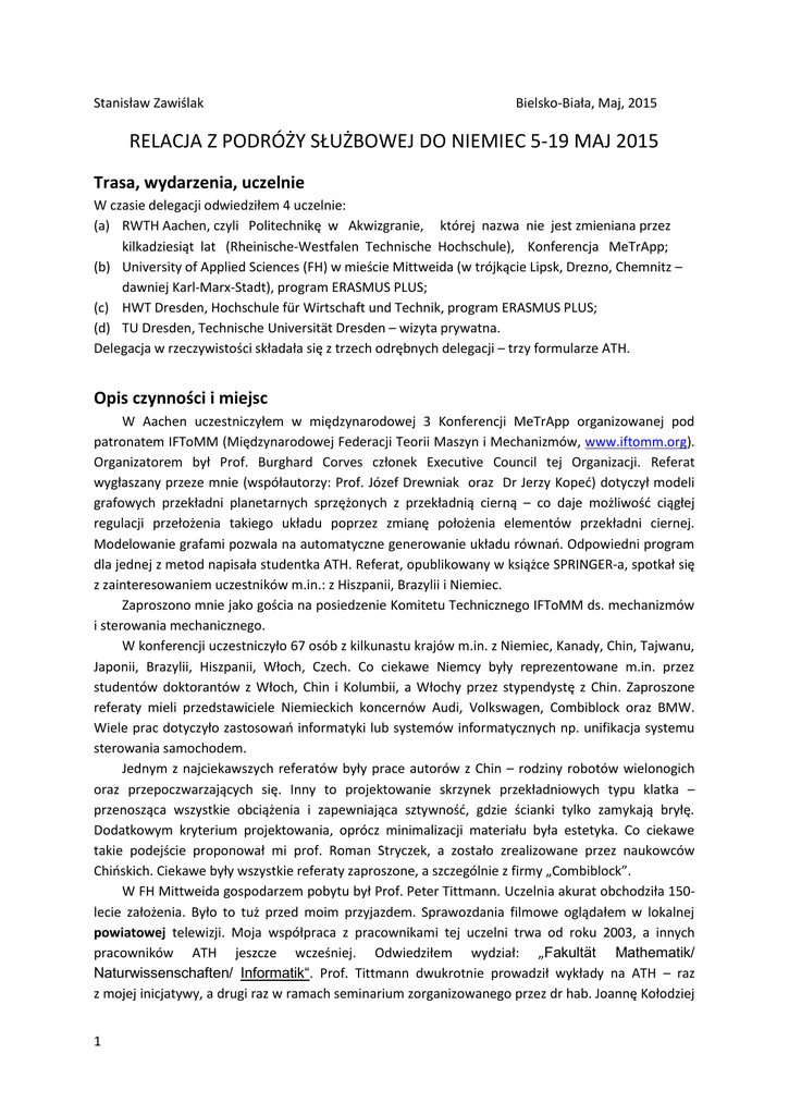 Stanisław Zawiślak Bielsko-Biała, Maj, 2015 RELACJA Z PODRÓŻY SŁUŻBOWEJ DO NIEMIEC 5-19 MAJ 2015 Trasa, wydarzenia, uczelnie W czasie delegacji odwiedziłem 4 uczelnie: (a) RWTH Aachen, czyli Politechnikę w Akwizgranie, której nazwa nie jest zmieniana przez kilkadziesiąt lat (Rheinische-Westfalen Technische Hochschule), Konferencja MeTrApp; (b) University of Applied Sciences (FH) w mieście Mittweida (w trójkącie Lipsk, Drezno, Chemnitz – dawniej Karl-Marx-Stadt), program ERASMUS PLUS; (c) HWT Dresden, Hochschule für Wirtschaft und Technik, program ERASMUS PLUS; (d) TU Dresden, Technische Universität Dresden – wizyta prywatna. Delegacja w rzeczywistości składała się z trzech odrębnych delegacji – trzy formularze ATH. Opis czynności i miejsc W Aachen uczestniczyłem w międzynarodowej 3 Konferencji MeTrApp organizowanej pod patronatem IFToMM (Międzynarodowej Federacji Teorii Maszyn i Mechanizmów, www.iftomm.org). Organizatorem był Prof. Burghard Corves członek Executive Council tej Organizacji. Referat wygłaszany przeze mnie (współautorzy: Prof. Józef Drewniak oraz Dr Jerzy Kopeć) dotyczył modeli grafowych przekładni planetarnych sprzężonych z przekładnią cierną – co daje możliwość ciągłej regulacji przełożenia takiego układu poprzez zmianę położenia elementów przekładni ciernej. Modelowanie grafami pozwala na automatyczne generowanie układu równań. Odpowiedni program dla jednej z metod napisała studentka ATH. Referat, opublikowany w książce SPRINGER-a, spotkał się z zainteresowaniem uczestników m.in.: z Hiszpanii, Brazylii i Niemiec. Zaproszono mnie jako gościa na posiedzenie Komitetu Technicznego IFToMM ds. mechanizmów i sterowania mechanicznego. W konferencji uczestniczyło 67 osób z kilkunastu krajów m.in. z Niemiec, Kanady, Chin, Tajwanu, Japonii, Brazylii, Hiszpanii, Włoch, Czech. Co ciekawe Niemcy były reprezentowane m.in. przez studentów doktorantów z Włoch, Chin i Kolumbii, a Włochy przez stypendystę z Chin. Zaproszone referaty mieli przedstawiciele Niemieckich koncernów Audi, Volkswagen, Combiblock oraz BMW. Wiele prac dotyczyło zastosowań informatyki lub systemów informatycznych np. unifikacja systemu sterowania samochodem. Jednym z najciekawszych referatów były prace autorów z Chin – rodziny robotów wielonogich oraz przepoczwarzających się. Inny to projektowanie skrzynek przekładniowych typu klatka – przenosząca wszystkie obciążenia i zapewniająca sztywność, gdzie ścianki tylko zamykają bryłę. Dodatkowym kryterium projektowania, oprócz minimalizacji materiału była estetyka. Co ciekawe takie podejście proponował mi prof. Roman Stryczek, a zostało zrealizowane przez naukowców Chińskich. Ciekawe były wszystkie referaty zaproszone, a szczególnie z firmy „Combiblock”. W FH Mittweida gospodarzem pobytu był Prof. Peter Tittmann. Uczelnia akurat obchodziła 150lecie założenia. Było to tuż przed moim przyjazdem. Sprawozdania filmowe oglądałem w lokalnej powiatowej telewizji. Moja współpraca z pracownikami tej uczelni trwa od roku 2003, a innych pracowników ATH jeszcze wcześniej. Odwiedziłem wydział: „Fakultät Mathematik/ Naturwissenschaften/ Informatik“. Prof. Tittmann dwukrotnie prowadził wykłady na ATH – raz z mojej inicjatywy, a drugi raz w ramach seminarium zorganizowanego przez dr hab. Joannę Kołodziej 1 (obecnie pracuje w Politechnice Krakowskiej). Za drugim razem przyjechało na seminarium także 10 niemieckich studentów. Wykłady miałem m.in. dla studentów studiów magisterskich kursu prowadzonego w całości w języku angielskim. Skład grupy studenckiej to reprezentanci m.in. Chin, Malezji, Indii, Syrii, Gruzji oraz 1 Niemiec. Mittweida to ok. 20 tys. miasteczko leżące w trójkącie, którego wierzchołkami są miasta Drezno, Lipsk oraz Chemnitz (dawniej Karl-Marx-Stadt). Prof. Tittmann jest autorem 3 książek - 2 po niemiecku (teoria grafów oraz kombinatoryka) oraz 1 o zasięgu światowym (po angielsku, CRC - Boca Raton) z zakresu niezawodności sieci. Na podstawie tego i poprzednich wyjazdów w ramach ERASMUS-a oraz ERASMUS-a PLUS można zauważyć, że kursy w języku angielskim (np. cały stopień magisterski) prowadzone są w wielu uczelniach całkowicie po angielsku (jak w ATH zarządzanie!!) – zwłaszcza w Niemczech oraz Finlandii. Na te kursy rekrutowani są studenci z całego świata. Jest to źródłem finansowania wydziałów. Co ciekawe Niemcy nie uznają dyplomów magistra z niektórych krajów np. arabskich. Na tych kursach, studiują zatem uczestnicy, którzy mają formalnie stopień magistra ze swoich krajów, chcą pracować w swoim zawodzie w Niemczech i muszą uzyskać dyplom niemieckiej uczelni. Tematem moich wykładów były grafy – problemy i algorytmy. Uruchamiałem wiele programów komputerowych wykonanych w ramach dyplomów lub zaliczeń z przedmiotu „Algorytmiczne ujęcie teorii grafów”. Wykłady i programy spotkały się z dużym zainteresowaniem. W Dreźnie miałem wykłady na FWT Dresden (Wyższej Szkoły Zawodowej Gospodarki i Techniki), wydział „Faculty of Informatics / Mathematics”. Jest to nowa uczelnia partnerska ATH. Pojechałem do niej z inspiracji Pań pracujących w naszym dziale Wymiany Akademickiej i przy Ich pomocy. Pani Mgr Hanna Lamers pisała listy do Kierowniczki biura wymiany międzynarodowej w Dreźnie, która znalazła Opiekuna dla mnie. Prof. Marco Hamann, który modeluje układy mechaniczne innymi obiektami algebraicznymi (wielomianami) niż grafy. Zatem, był on zainteresowany moimi pracami. Prof. Marco Hamann został przeze mnie zaproszony do odwiedzenia ATH w ramach i na zasadach programu ERASMUS PLUS tzn. koszty pobytu będą pokrywane w całości przez stroną niemiecką. Tematy wykładów były podobne, rozszerzone o projektowanie ewolucyjne (wyniki opracowane na cele habilitacji, program napisał wtedy Kolega dr Marek Praszkiewicz), a także o jeszcze wcześniej