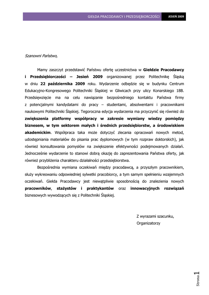 GIEŁDA PRACODAWCY I PRZEDSIĘBIORCZOŚCI JESIEŃ 2009 Szanowni Państwo, Mamy zaszczyt przedstawić Państwu ofertę uczestnictwa w Giełdzie Pracodawcy i Przedsiębiorczości – Jesień 2009 organizowanej przez Politechnikę Śląską w dniu 22 października 2009 roku. Wydarzenie odbędzie się w budynku Centrum Edukacyjno-Kongresowego Politechniki Śląskiej w Gliwicach przy ulicy Konarskiego 18B. Przedsięwzięcie ma na celu nawiązanie bezpośredniego kontaktu Państwa firmy z potencjalnymi kandydatami do pracy – studentami, absolwentami i pracownikami naukowymi Politechniki Śląskiej. Tegoroczna edycja wydarzenia ma przyczynić się również do zwiększenia platformy współpracy w zakresie wymiany wiedzy pomiędzy biznesem, w tym sektorem małych i średnich przedsiębiorstw, a środowiskiem akademickim. Współpraca taka może dotyczyć zlecania opracowań nowych metod, udostępniania materiałów do pisania prac dyplomowych (w tym rozpraw doktorskich), jak również konsultowania pomysłów na zwiększenie efektywności podejmowanych działań. Jednocześnie wydarzenie to stanowi dobrą okazję do zaprezentowania Państwa oferty, jak również przybliżenia charakteru działalności przedsiębiorstwa. Bezpośrednia wymiana oczekiwań między pracodawcą, a przyszłym pracownikiem, służy wykreowaniu odpowiedniej sylwetki pracobiorcy, a tym samym spełnieniu wzajemnych oczekiwań. Giełda Pracodawcy jest niewątpliwie sposobnością do znalezienia nowych pracowników, stażystów i praktykantów oraz innowacyjnych rozwiązań biznesowych wywodzących się z Politechniki Śląskiej. Z wyrazami szacunku, Strona 1 Organizatorzy GIEŁDA PRACODAWCY I PRZEDSIĘBIORCZOŚCI JESIEŃ 2009 Uczestnicy Do udziału w wydarzeniu zapraszamy przedsiębiorstwa małego, średniego i dużego sektora, działające na terenie kraju i zagranicy, reprezentujące branżę inżynieryjną, zorientowane na pozyskiwanie zasobów ludzkich, fachowej wiedzy, innowacji ze środowiska akademickiego. Na Giełdzie zaprezentują się również instytucje rynku pracy i instytucje wspierające przedsiębiorczość, prowadzące swoją działalność na terenie woj. śląskiego. Grupa docelowa Odbiorcami Giełdy Pracodawcy i Przedsiębiorczości są przede wszystkim studenci, absolwenci i pracownicy naukowi Politechniki Śląskiej, niemniej jednak o wydarzeniu zostaną poinformowane również wszystkie okoliczne szkoły techniczne. Promocja wydarzenia Kampania reklamowa wydarzenia będzie odbywać się przy użyciu następujących narzędzi: Plakaty, ulotki informacyjne; Katalog giełdowy; Portal internetowy http://www.kariera.polsl.pl/gielda.htm stworzony na potrzeby Giełdy Pracodawcy i Przedsiębiorczości – Jesień 2009; Newsletter do pracowników naukowych Politechniki Śląskiej i studentów/absolwentów zarejestrowanych w bazie internetowej Biura Karier Studenckich (ok. 6800 odbiorców) wysłany w przeddzień oraz na dwa tygodnie przez planowanym wydarzeniem; Informacje w mediach (radio, telewizja, portale pracy), w tym patronat wybranych Strona 2 stacji. GIEŁDA PRACODAWCY I PRZEDSIĘBIORCZOŚCI JESIEŃ 2009 Szczegóły oferty W ramach uczestnictwa w Giełdzie Pracodawcy i Przedsiębiorczości – Jesień 2009 jesteśmy w stanie zapewnić Państwa firmie Pakiet podstawowy (szczegóły w poniższej tabeli). Stanowisko w holu budynku Centrum Edukacyjno – Kongresowego Politechniki Śląskiej Logo i odnośnik do strony internetowej na portalu Giełdy (podstrona „Wystawcy”) Prezentacja multimedialna na portalu Giełdy (podstrona ,,Wystawcy”) Reklama w katalogu giełdowym o formacie A53 Logo na plakacie promującym Prezentacja firmy na Politechnice Śląskiej w terminie uzgodnionym z Organizatorem Liczba przedstawicieli firmy podczas Giełdy Catering Cena Małe przedsiębiorstwa1 Duże przedsiębiorstwa2 Tak (stolik + 2 krzesła) Tak (stoisko 6m wykonane przez profesjonalną firmę wraz z umeblowaniem, fryzem, podłączeniem elektrycznym i internetowym) Tak Tak Nie Tak Reklama w postaci krótkiej informacji o firmie (dane teleadresowe, krótki opis działalności firmy, ok. 500 znaków) Reklama w postaci udostępnienia jednej strony kolorowej w katalogu Nie Tak Nie Tak 2 osoby dowolna Tak Tak 2 Pakiet bezpłatny 1500zł + 22% VAT Strona Z pakietu przeznaczonego dla małych przedsiębiorstw mogą skorzystać firmy spełniające następujące wymagania: liczba pracowników w firmie nie przekracza 20 osób; działalność firmy oparta jest na nowoczesnych technologiach; firma ma możliwość udostępnienia studentom narzędzi i produktów w celach napisania pracy dyplomowej. 2 Przedsiębiorstwa o wielkości zatrudnienia powyżej 20 osób. 3 Warunkiem umieszczenia informacji w katalogu Giełdy Pracodawcy i Przedsiębiorczości – Jesień 2009 jest dostarczenie drogą elektroniczną materiałów w terminie do 2 października 2009r. 3 1 GIEŁDA PRACODAWCY I PRZEDSIĘBIORCZOŚCI JESIEŃ 2009 Pakiet Sponsora (wzbogacony pakiet podstawowy): Stoisko o wielkości 8m2; Wyeksponowane logo na plakatach i ulotkach promujących Giełdę; Dwie kolorowe strony w katalogu giełdowym; Logo, odnośnik do strony internetowej i prezentacja multimedialna na stronie głównej oraz na podstronie ,,Wystawcy” portalu Giełdy; Prezentacja w dniu wydarzenia, w Sali Centrum Edukacyjno-Kongresowego. Cena Pakietu Sponsora wynosi 3500 zł + 22% VAT. Pakiet Promocyjny Dla dużych przedsiębiorstw, które nie są zainteresowane bezpośrednim uczestnictwem w wydarzeniu, istnieje możliwość skorzystania z Pakietu Promocyjnego, który obejmuje: Możliwości umieszczenia materiałów promocyjnych firmy (plakaty, ulotki, gadżety itp.) przekazanych organizatorom na specjalnie przygotowanym stanowisku obsługiwanym przez organizatorów; Stronę w katalogu giełdowym o formacie A5 (warunkiem umieszczenia informacji w katalogu Giełdy Pracodawcy i Przedsiębiorczości – Jesień 2009 jest dostarczenie drogą elektroniczną materiałów w t