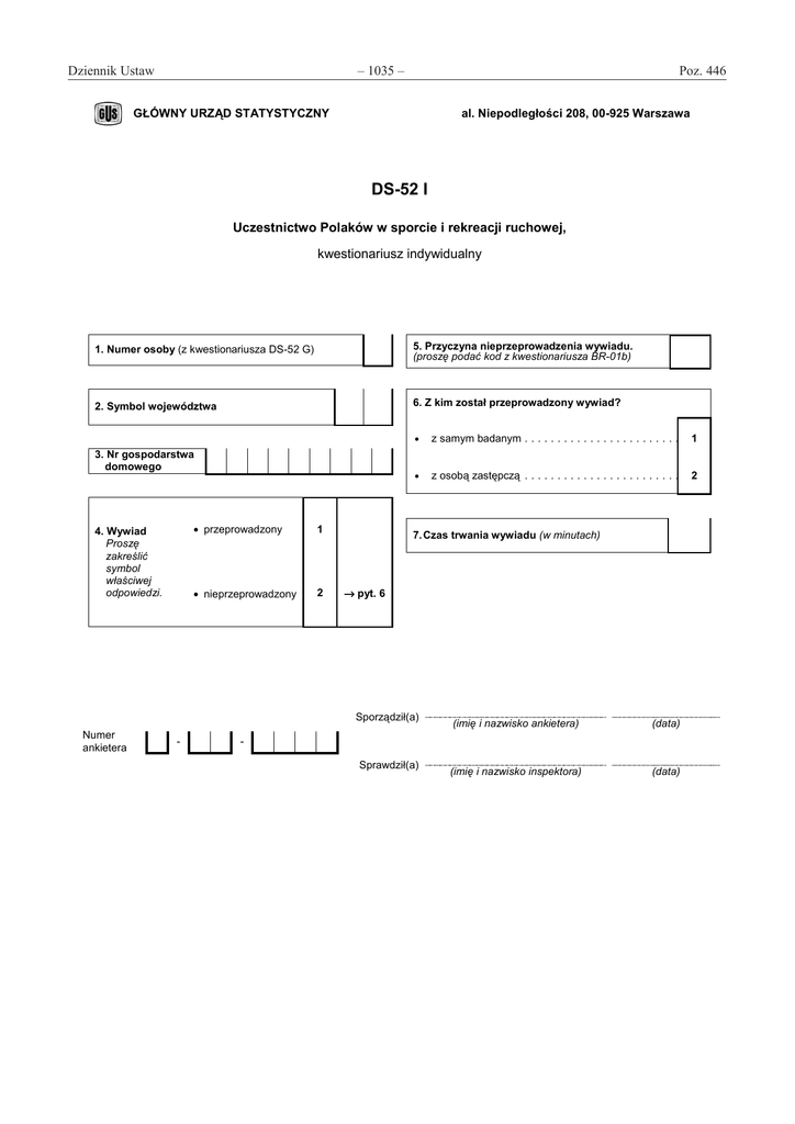 Dziennik Ustaw – 1035 – Poz. 446 GŁÓWNY URZĄD STATYSTYCZNY al. NiepodległoĞci 208, 00-925 Warszawa DS-52 I Uczestnictwo Polaków w sporcie i rekreacji ruchowej, kwestionariusz indywidualny 1. Numer osoby (z kwestionariusza DS-52 G) 5. Przyczyna nieprzeprowadzenia wywiadu. (proszĊ podaü kod z kwestionariusza BR-01b) 2. Symbol województwa 6. Z kim został przeprowadzony wywiad? 3. Nr gospodarstwa domowego 4. Wywiad ProszĊ zakreĞliü symbol właĞciwej odpowiedzi. • przeprowadzony 1 • nieprzeprowadzony 2 • z samym badanym . . . . . . . . . . . . . . . . . . . . . . . . 1 • z osobą zastĊpczą . . . . . . . . . . . . . . . . . . . . . . . . 2 7. Czas trwania wywiadu (w minutach) → pyt. 6 Sporządził(a) Numer ankietera - (imiĊ i nazwisko ankietera) (data) (imiĊ i nazwisko inspektora) (data) Sprawdził(a) Dziennik Ustaw – 1036 – Poz. 446 UWAGA: Osoby, które w formularzu DS-52 G w dziale 5 w pytaniu 1 zaznaczyły odpowiedĨ „3” („nie uczestniczył”) wypełniają kolumnĊ 2 i koniec wywiadu. 8. Charakterystyka posiadanych umiejĊtnoĞci oraz uczestnictwa w zajĊciach sportowych lub rekreacji ruchowej Posiadane umiejĊtnoĞci związane z uprawianiem sportu lub rekreacji ruchowej UmiejĊtnoĞci/ zajĊcia sportowe 0 Symbole rodzajów zajĊü (dyscyplin/ sportów) 1 gra w piłkĊ noĪną 01 gra w koszykówkĊ 02 gra w piłkĊ rĊczną 03 gra w siatkówkĊ 04 inne zespołowe gry sportowe (hokej, rugby itp.) 05 gra w tenisa ziemnego, badmintona lub squasha 06 gra w tenisa stołowego 07 gra w brydĪa 08 gra w szachy 09 gra w bilard, snookera 10 gra w krĊgle 11 jazda konna 12 jazda na rowerze 13 jazda na łyĪwach 14 jazda na nartach, snowboardzie 15 jazda na rolkach, deskorolce, wrotkach itp. 16 aerobik, fitness, joga, gimnastyka 17 jogging, nordic walking 18 taniec 19 pływanie 20 nurkowanie 21 lekkoatletyka 22 sporty siłowe i kulturystyka 23 sporty walki (zapasy, judo, karate, boks i inne) 24 wĊdkarstwo 25 windsurfing, kitesurfing i pokrewne 26 wioĞlarstwo, kajakarstwo 27 wspinaczka 28 Īeglarstwo 29 inne dyscypliny/sporty ogólnorozwojowe zajĊcia ruchowe i poprawiające kondycjĊ fizyczną 30 W których zajĊciach sportowych lub rekreacji ruchowej Pan(Pani) uczestniczył(a) w okresie od1 X 2011 r. do 30 IX 2012 r.? ProszĊ wypełniü w zaleĪnoĞci od posiadanych umiejĊtnoĞci: ProszĊ wpisaü: 0- gdy brak umiejĊtnoĞci 1- posiadanie umiejĊtnoĞci w stopniu podstawowym 2- posiadanie umiejĊtnoĞci w stopniu zaawansowanym 2 0- nie uczestniczył 1- uczestniczył 3 31 9. Jaki był główny motyw uprawiania przez Pana(Panią) sportu lub rekreacji ruchowej? ProszĊ zaznaczyü tylko jedną odpowiedĨ. • dla zdrowia, ze wzglĊdu na zalecenie lekarza . . . . . . . . . . . . . . . . . . . . . . . . . . . . . . . . . . . . . . . . . . . . . . 1 • dla przyjemnoĞci, rozrywki . . . . . . . . . . . . . . . . . . . . . . . . . . . . . . . . . . . . . . . . . . . . . . . . . . . . . . . . . . . 2 • dla utrzymania kondycji fizycznej oraz zachowania właĞciwej sylwetki. . . . . . . . . . . . . . . . . . . . . . . . . . . . . 3 • ze wzglĊdu na spotkania ze znajomymi . . . . . . . . . . . . . . . . . . . . . . . . . . . . . . . . . . . . . . . . . . . . . . . . . . 4 • ze wzglĊdu na uprawianie sportu lub rekreacji ruchowej w przeszłoĞci . . . . . . . . . . . . . . . . . . . . . . . . . . . . 5 • inne przyczyny . . . . . . . . . . . . . . . . . . . . . . . . . . . . . . . . . . . . . . . . . . . . . . . . . . . . . . . . . . . . . . . . . . . 6 10. Charakterystyka uczestnictwa w zajĊciach sportowych lub rekreacyjnych oraz zawodach sportowych i sportowo-rekreacyjnych (z wyłączeniem uczestnictwa w obozach sportowych lub sportowo-rekreacyjnych) Jak czĊsto? Ile lat? Miejsce, w którym Pan(Pani) uczestniczył(a) w zajĊciach sportowych lub rekreacyjnych 1 2 proszĊ podaü liczbĊ pełnych lat uczestnict wa 3 1 - Obiekt sportowy 2 - Klub fitness/ siłownia 3 - Dom/ mieszkanie 4 - poza infrastrukturą sportową (park, las itp.) 4 5 Główny organizator Finansowanie zajĊü sportowych lub rekreacyjnych, w których Pan/Pani uczestniczył(a) (dotyczy wyłącznie okresu 1 X 2011 r. – 30 IX 2012 r.) Czy i jak czĊsto Pan/Pani uczestniczył(a) w zawodach sportowych i rekreacyjnych? Forma finansowania proszĊ podaü czas w godzinach, minutach godzin 1 - klub sportowy 2 - szkoła (SKS, UKS) 3 - ognisko TKKF 4 - zespół LZS 5 - zakład pracy 6 - prywatny organizator 7 - inni organizatorzy 8 - bez organizatora (indywidualnie, z rodziną itp.) 9 - nie wiem minut 6 proszĊ podaü czas w godzinach, minutach (nie dotyczy, gdy w kolumnie 5 wskazano odpowiedĨ 3) godzin 7 minut 8 1 - całoĞü wydatków poniósł organizator zajĊü 2 - czĊĞü wydatków poniósł uczestnik 3 - całoĞü wydatków poniósł uczestnik 4 - uczestnictwo nie wiązało siĊ z wydatkami PrzeciĊtne miesiĊczne opłaty za zajĊcia w pełnych złotych 1 - nie uczestniczył(a) 2 - uczestniczył(a) 1–5 razy w roku 3 - uczestniczył(a) 6–10 razy w roku 4 - uczestniczył(a) ponad 10 razy w roku 10 11 Uwaga: W przypadku odpowiedzi 1 lub 4 kolumna 10 nie powinna byü wypełniona. 9 – 1037 – Symbole rodzajów zajĊü (dyscyplin/ sportów) z pytania 8 1 - okazjonalnie (w czasie wakacji, na urlopie) 2 - sporadycznie (przeciĊtnie raz w miesiącu) 3 - 1-2 razy w tygodniu/ w okresie wypoczynku sobotnioniedzielnego 4 - 3–5 razy w tygodniu 5 - ponad 5 razy w tygodniu 1 - miejscowoĞü zamieszkania 2 - miejscowoĞü usytuowania miejsca pracy lub nauki 3 - inna miejscowoĞü odległa do 5,0 km od miejsca zamieszkania 4 - inna miejscowoĞü odległa od 5,1 do 10 km od miejsca zamieszkania 5 - inna miejscowoĞü odległa powyĪej 10 km od miejsca zamieszkania PrzeciĊtny czas trwania zajĊü PrzeciĊtny czas dojazdu na zajĊcia w obie strony Dziennik Ustaw Uwaga: W pytaniach 10–11 w kolumnie 1 proszĊ wstawiü najwyĪej 5 symboli z pytania 8, dotyczących rodzajów zajĊü sportowych lub rekreacyjn